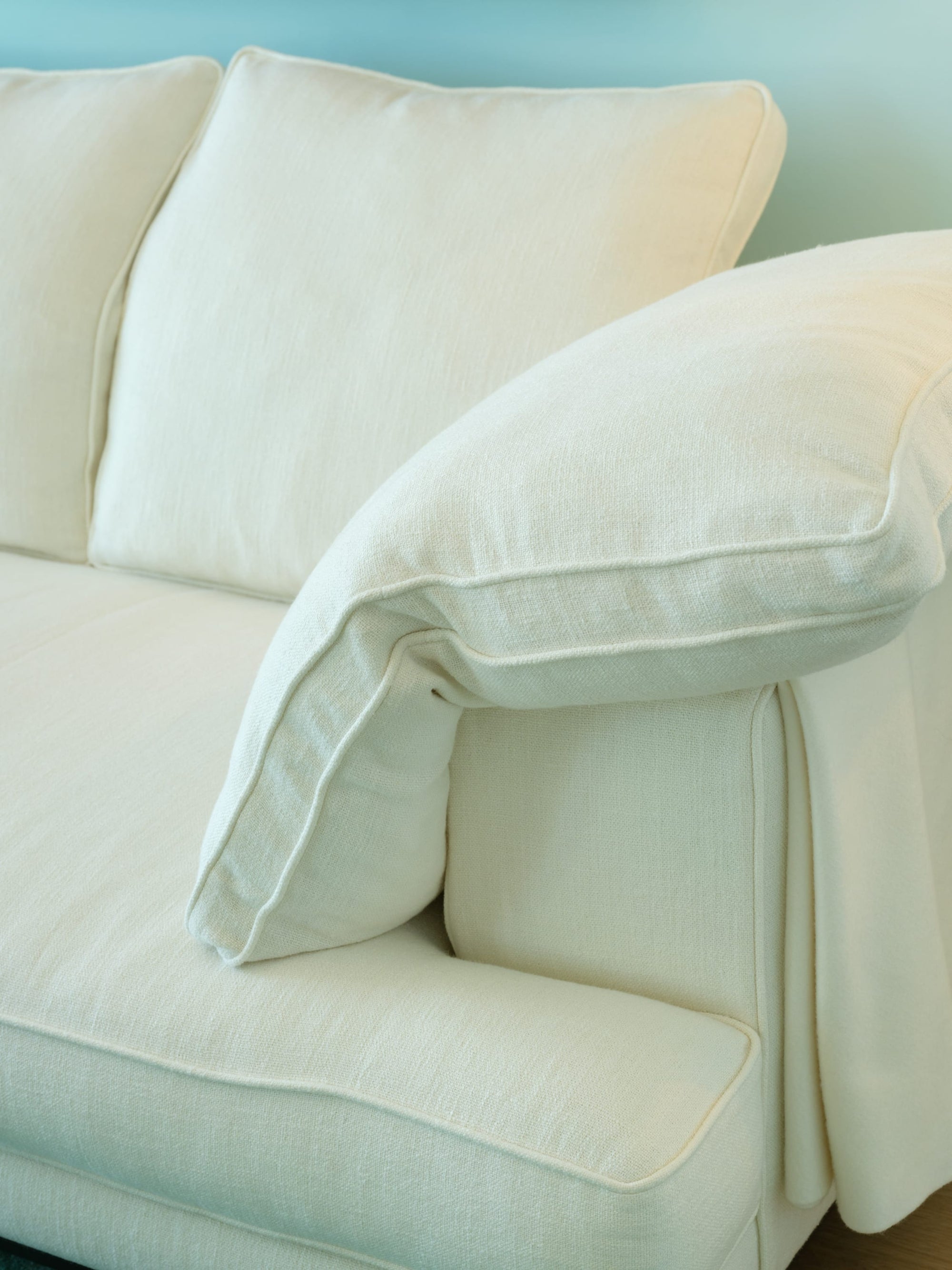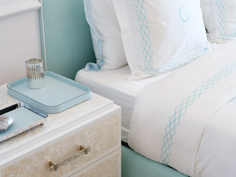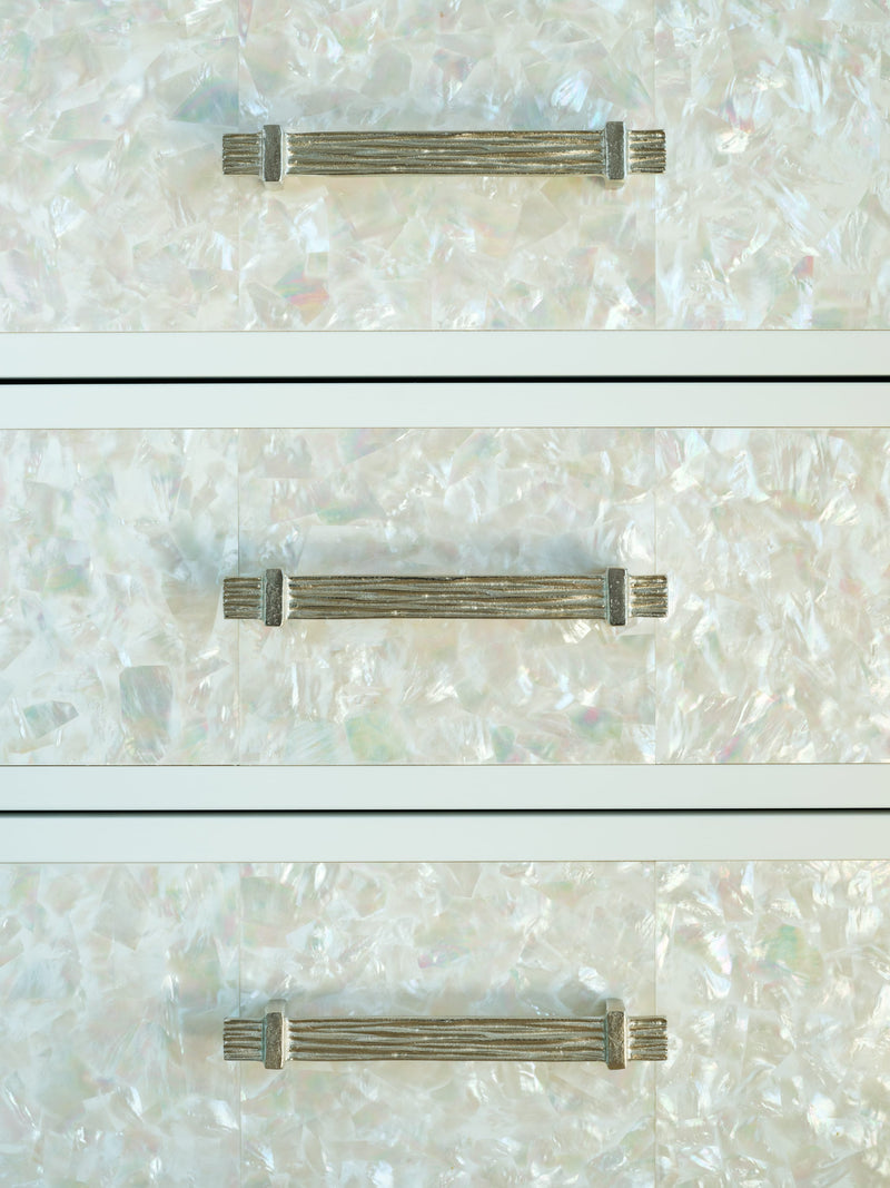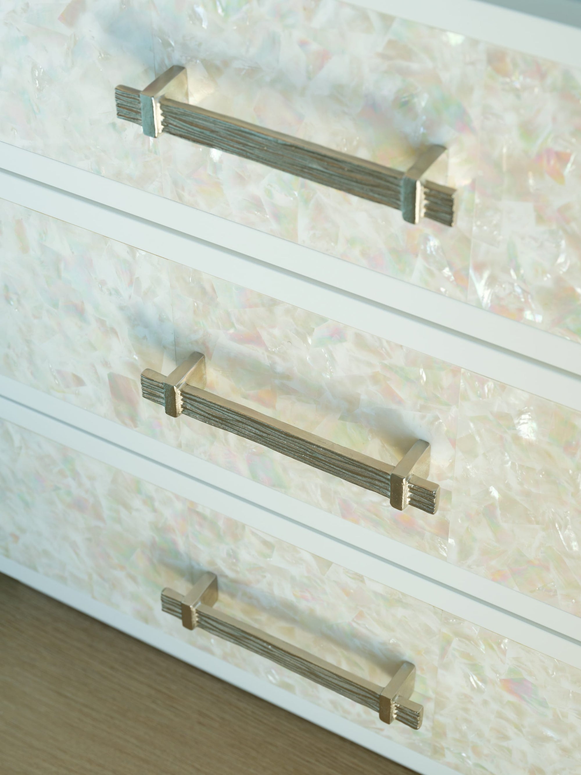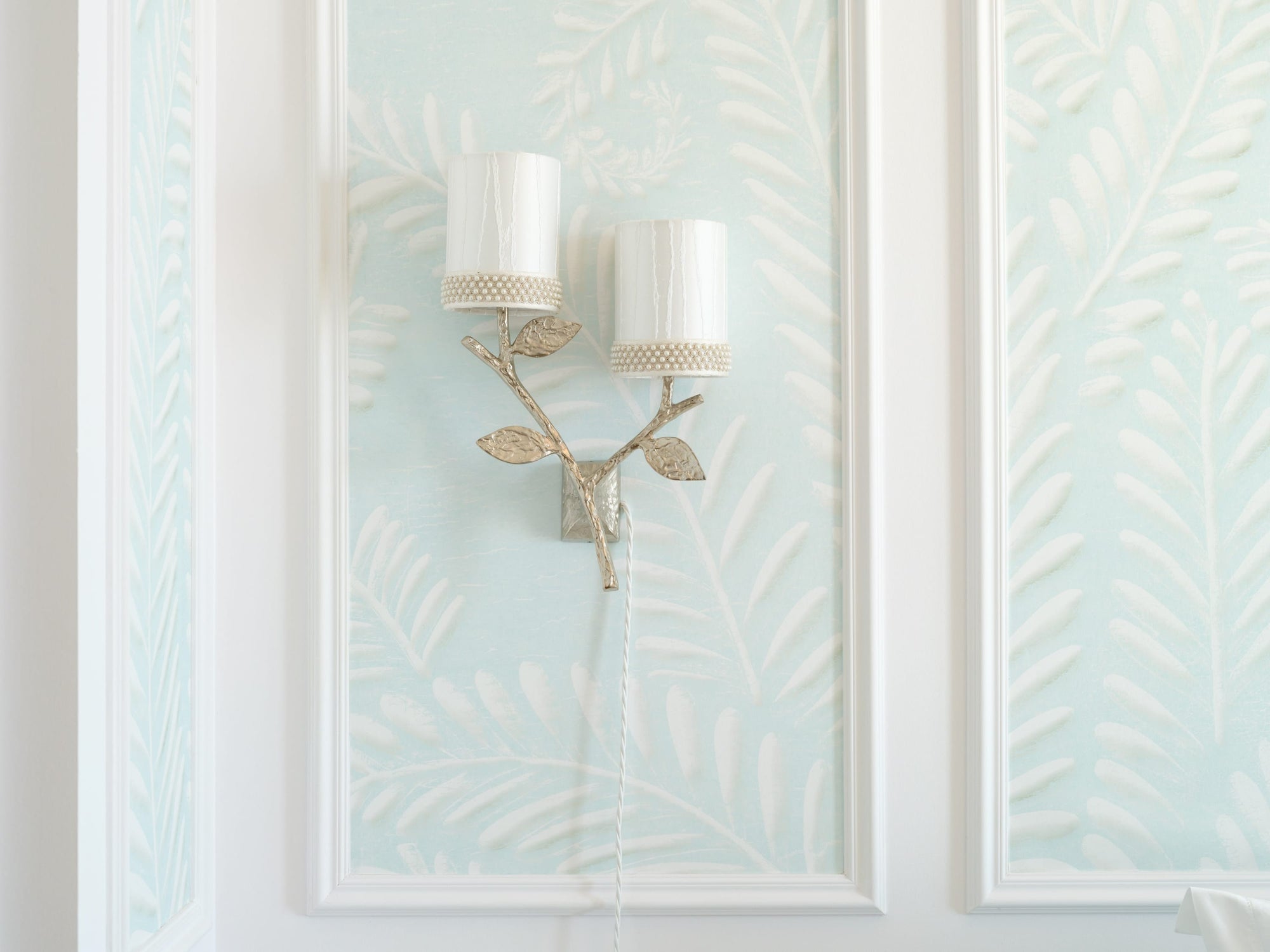 While the living room exudes energy, the bedroom offers a serene, hotel-inspired retreat. From hand-painted wallpaper and intricate boiseries to custom mother-of-pearl bedside tables, every detail exudes elegance. Luxurious touches, like whimsical pompom curtains, create a dreamy atmosphere, turning the bedroom into a haven.