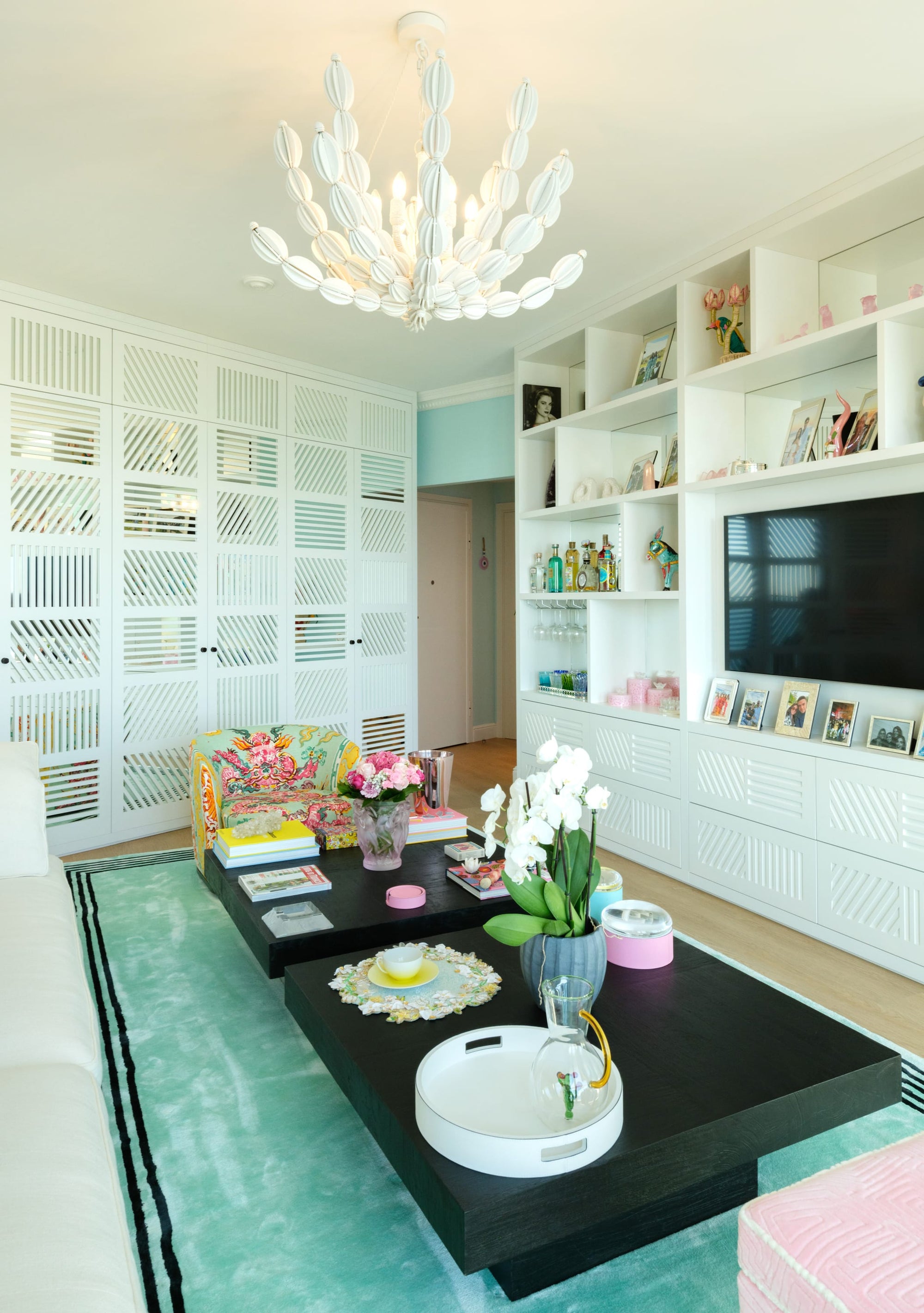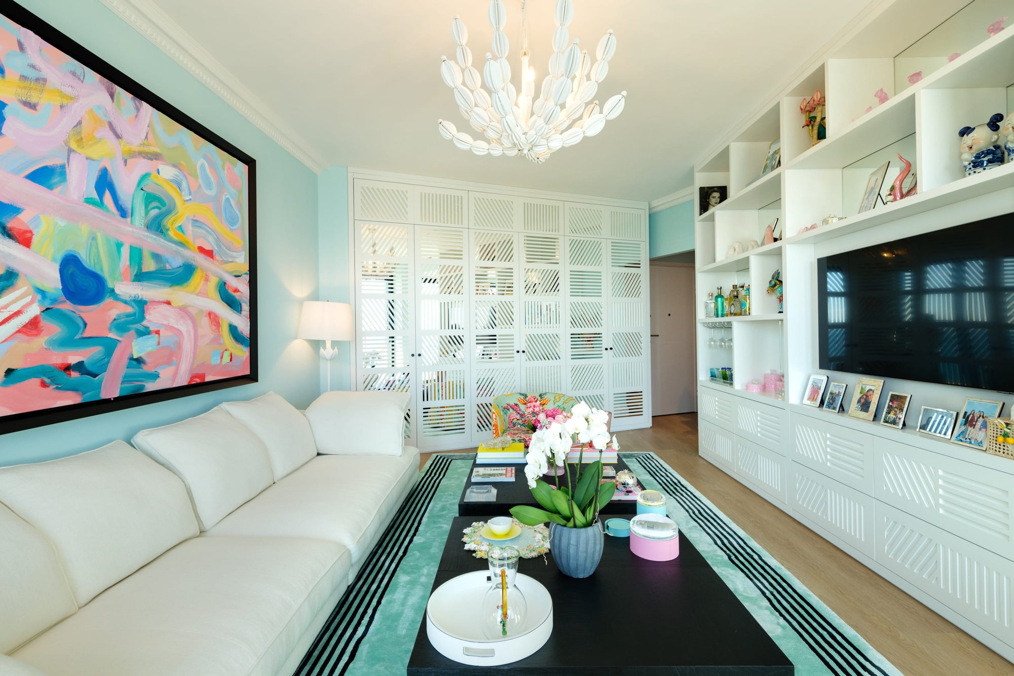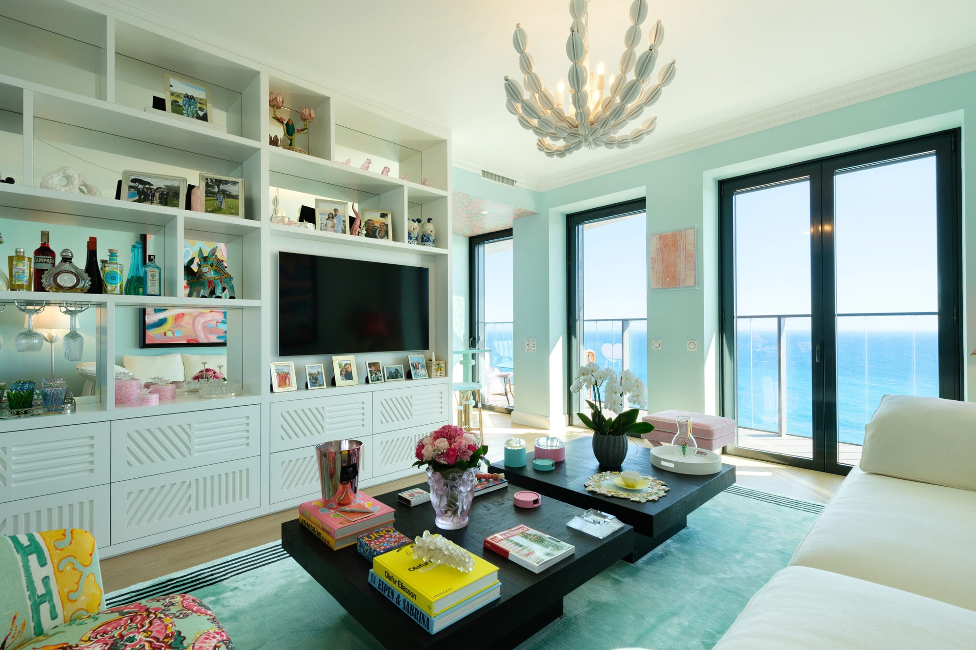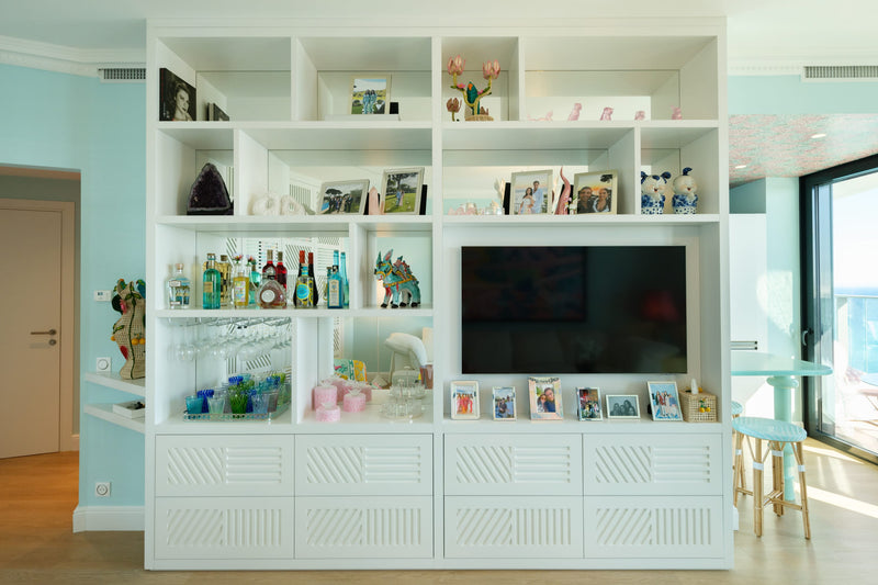 The design process brought together a harmonious mix of Caribbean whimsy and Beverly Hills glamour, all tied together with a contemporary edge. Despite its limited space, the apartment maximizes storage while maintaining a layout perfect for hosting. At the heart of the living area is an oversized sofa paired with dark wood coffee tables—an ideal setup for casual "aperi-cena" gatherings or cozy movie nights. The living room is a colorful, inviting space that balances bold hues with a contemporary framework. The combination of curated art, a thoughtfully chosen color palette, and versatile furniture makes it both functional and fun.