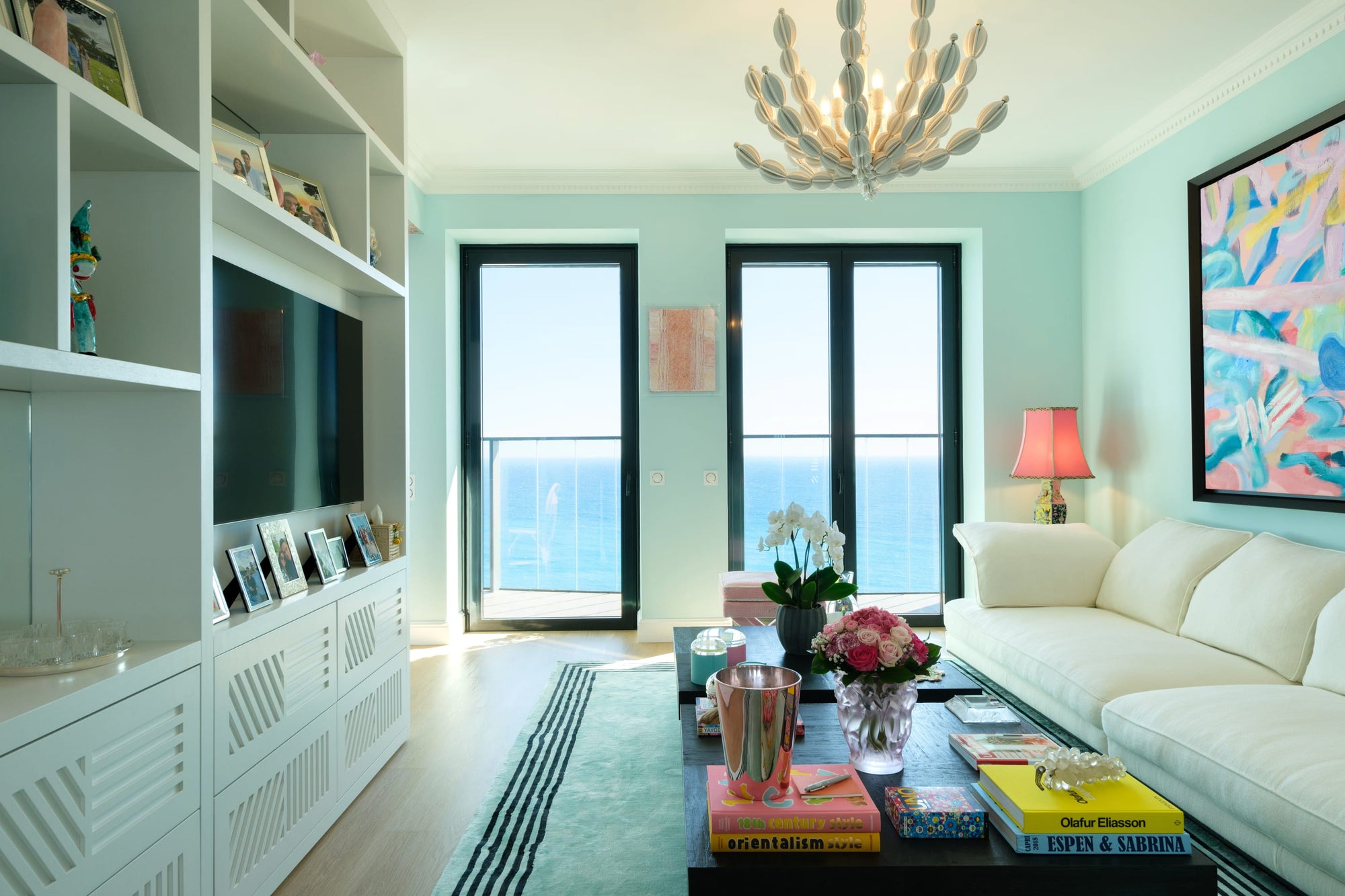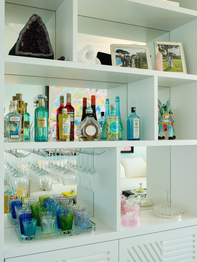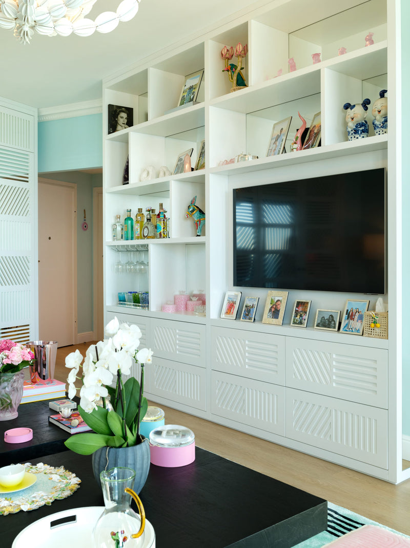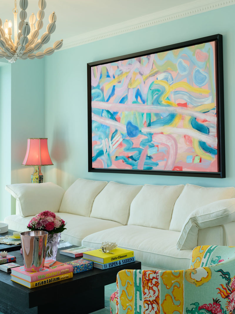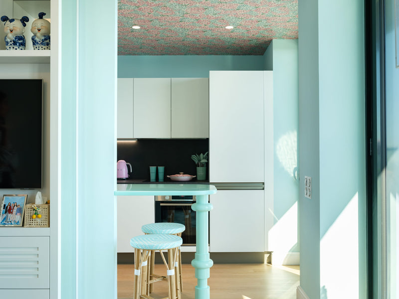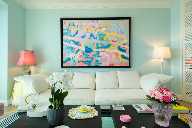 The design process brought together a harmonious mix of Caribbean whimsy and Beverly Hills glamour, all tied together with a contemporary edge. Despite its limited space, the apartment maximizes storage while maintaining a layout perfect for hosting. At the heart of the living area is an oversized sofa paired with dark wood coffee tables—an ideal setup for casual "aperi-cena" gatherings or cozy movie nights. The living room is a colorful, inviting space that balances bold hues with a contemporary framework. The combination of curated art, a thoughtfully chosen color palette, and versatile furniture makes it both functional and fun.