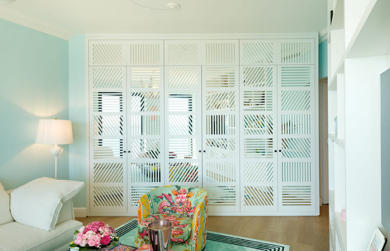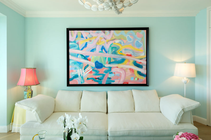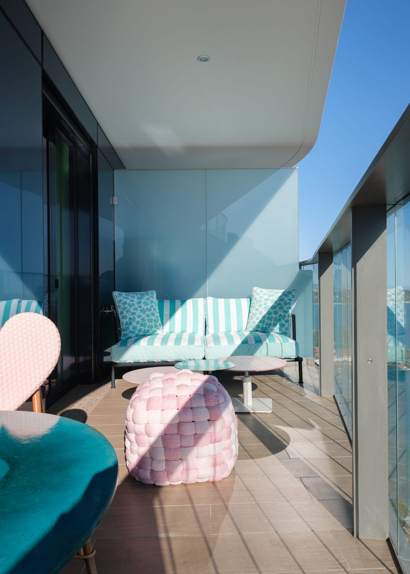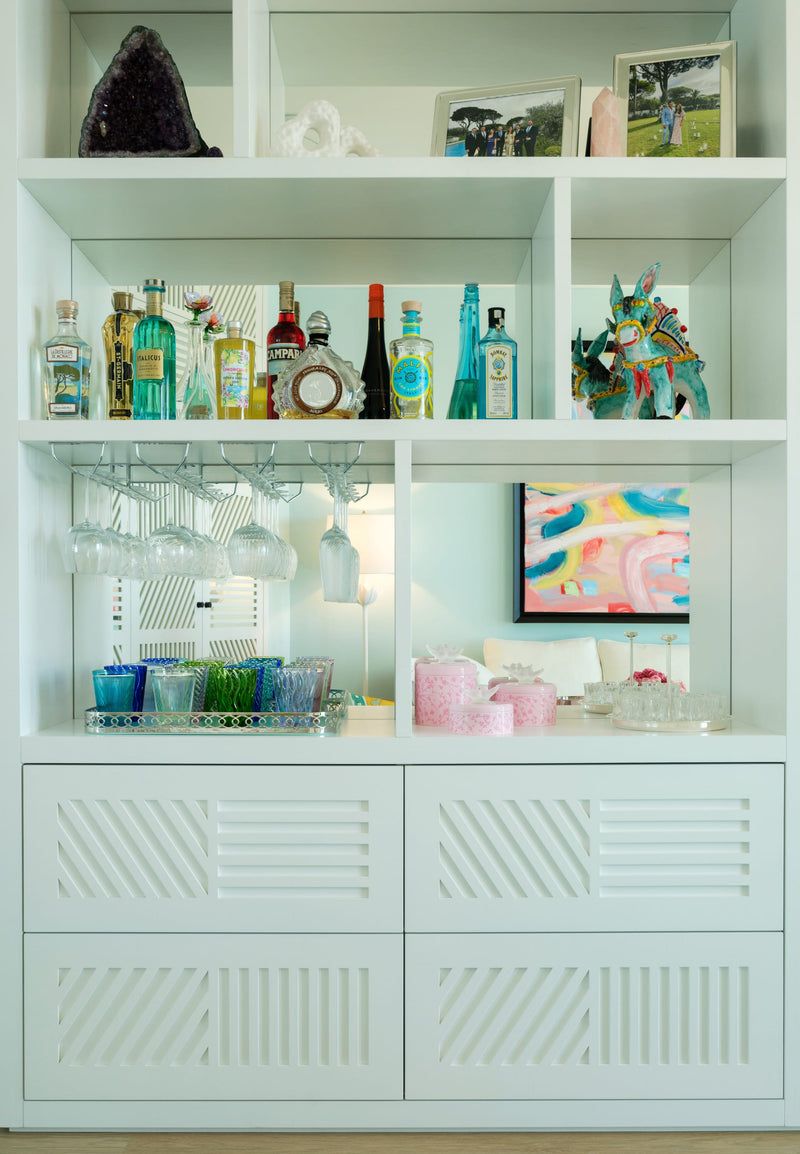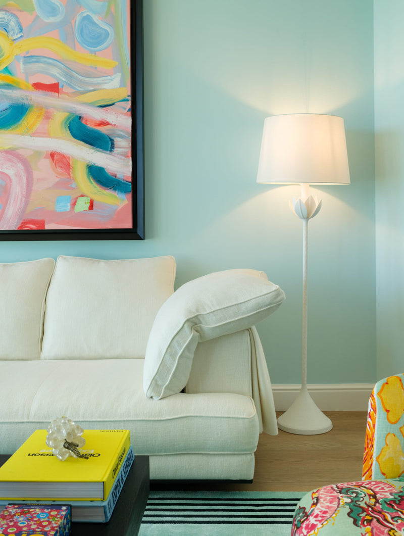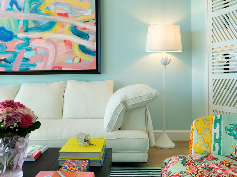 The design process brought together a harmonious mix of Caribbean whimsy and Beverly Hills glamour, all tied together with a contemporary edge. Despite its limited space, the apartment maximizes storage while maintaining a layout perfect for hosting. At the heart of the living area is an oversized sofa paired with dark wood coffee tables—an ideal setup for casual "aperi-cena" gatherings or cozy movie nights. The living room is a colorful, inviting space that balances bold hues with a contemporary framework. The combination of curated art, a thoughtfully chosen color palette, and versatile furniture makes it both functional and fun.