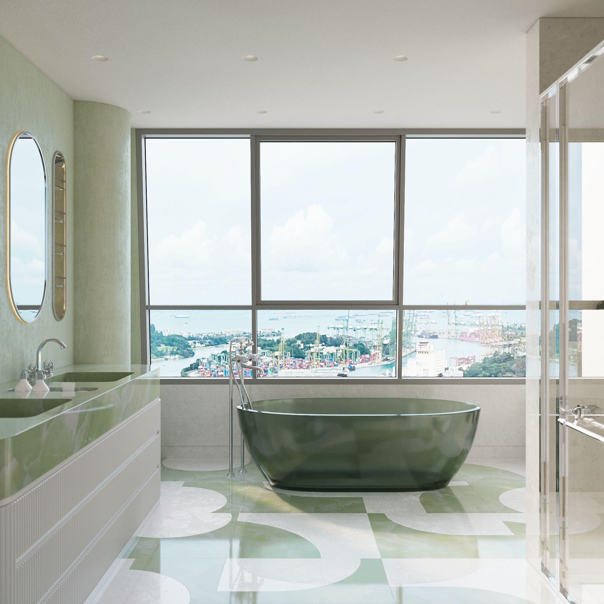 The freestanding green resin bathtub offers a view of Monte-Carlo, while the custom oval mirror and convenient vanity wall storage enhance both form and function.