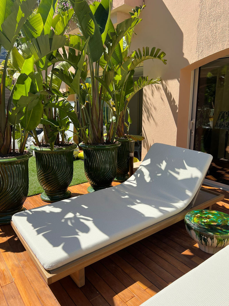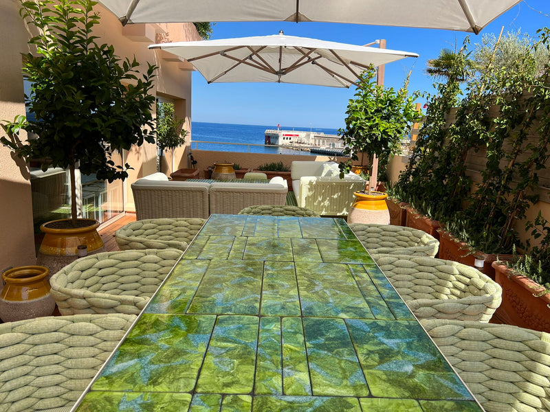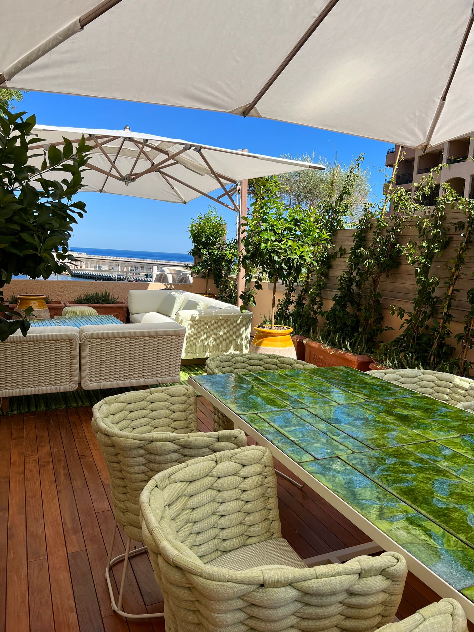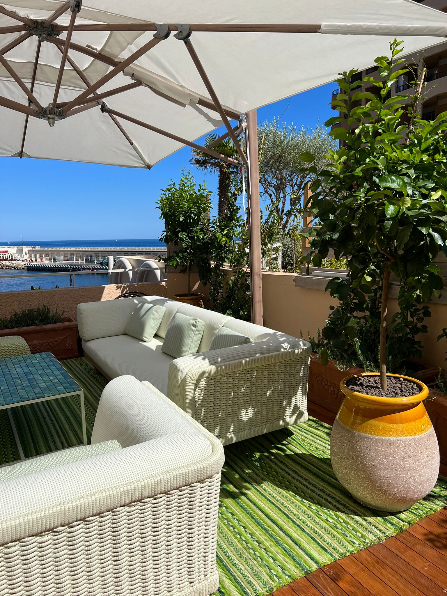 For this dream-like terrace in Monaco, we used different tones of green with Paola Lenti rope furniture, ceramic tables and mustard glazed pots with exotic plants.