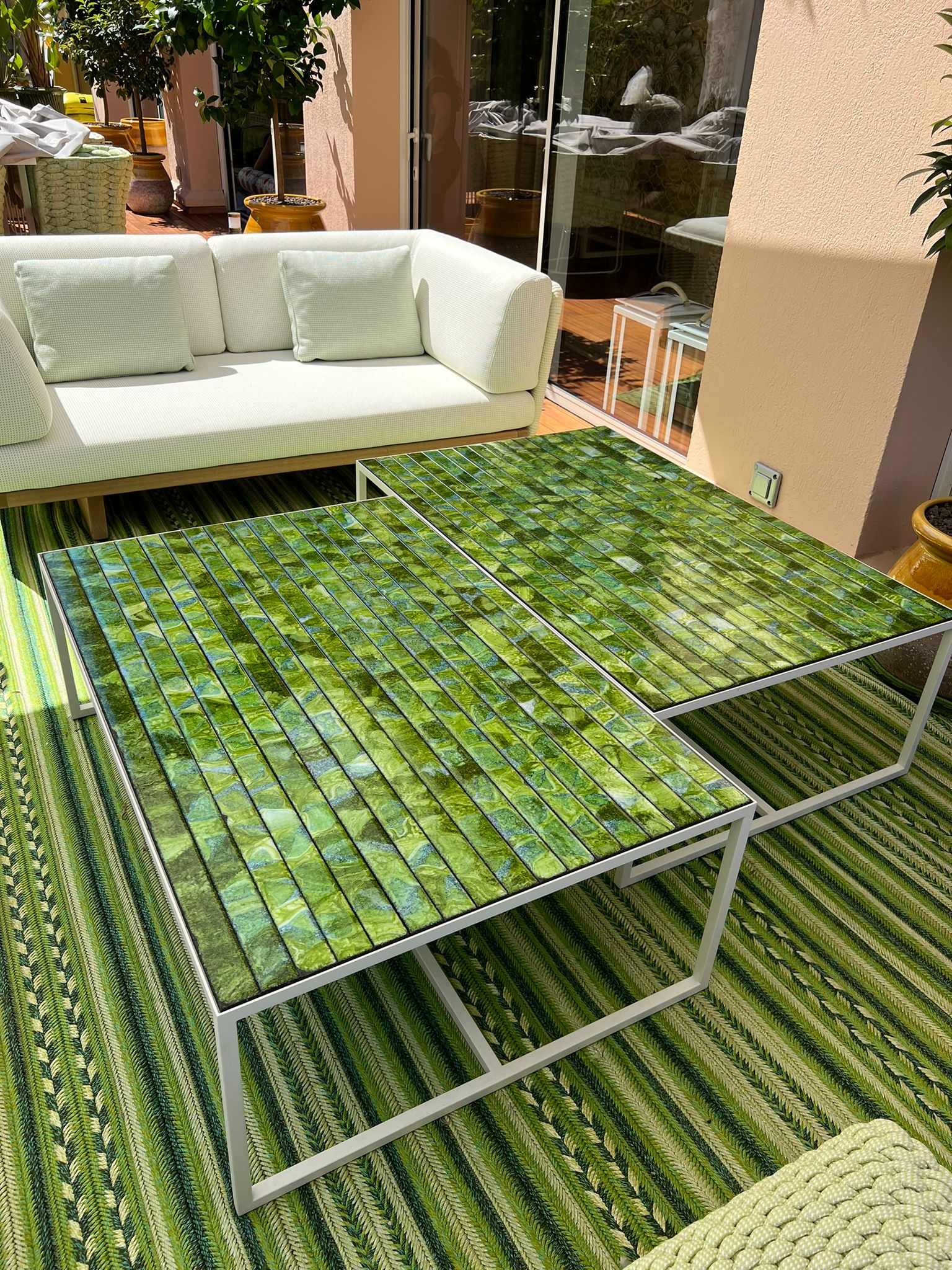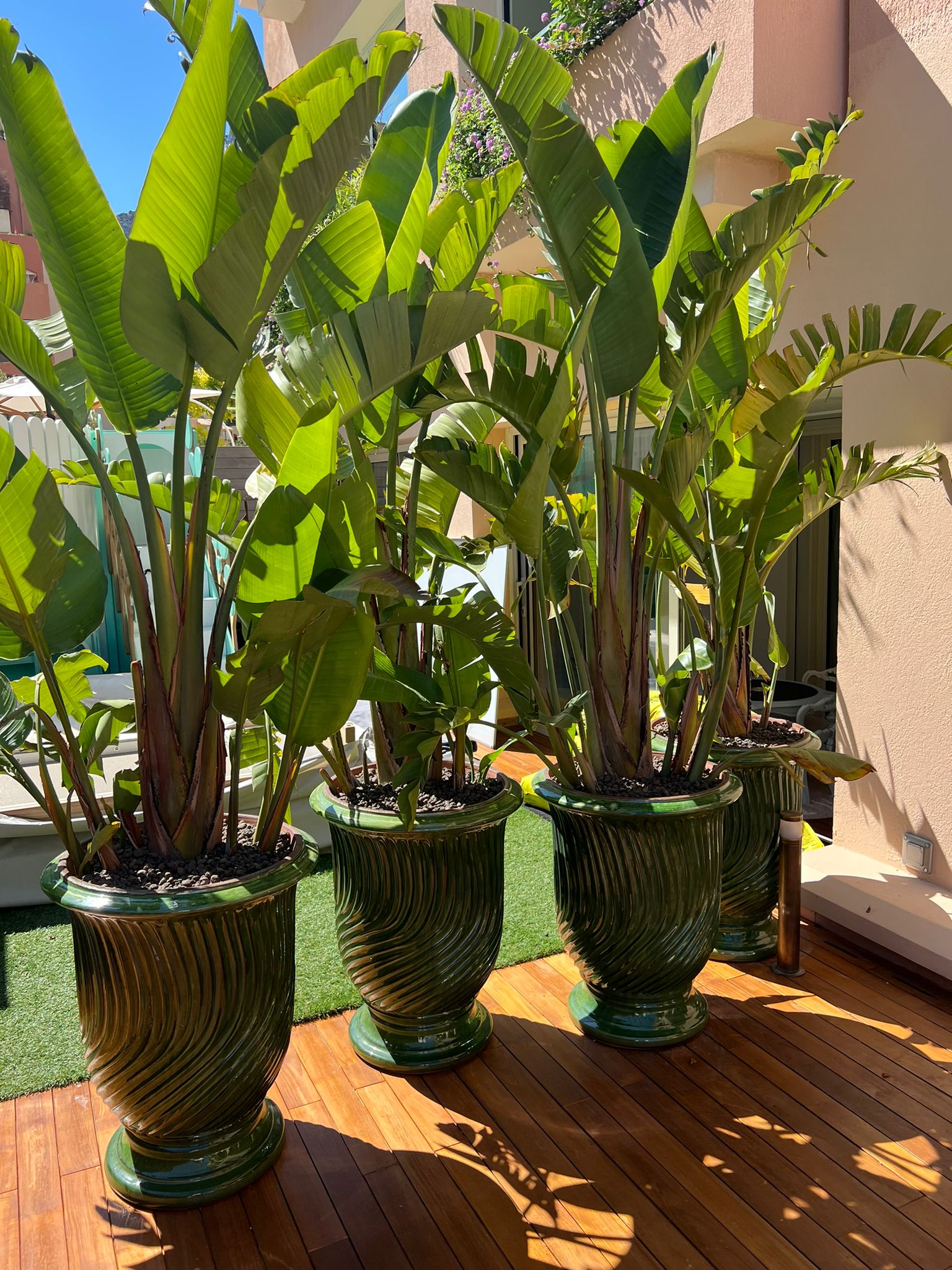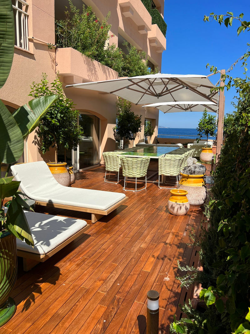 For this dream-like terrace in Monaco, we used different tones of green with Paola Lenti rope furniture, ceramic tables and mustard glazed pots with exotic plants.