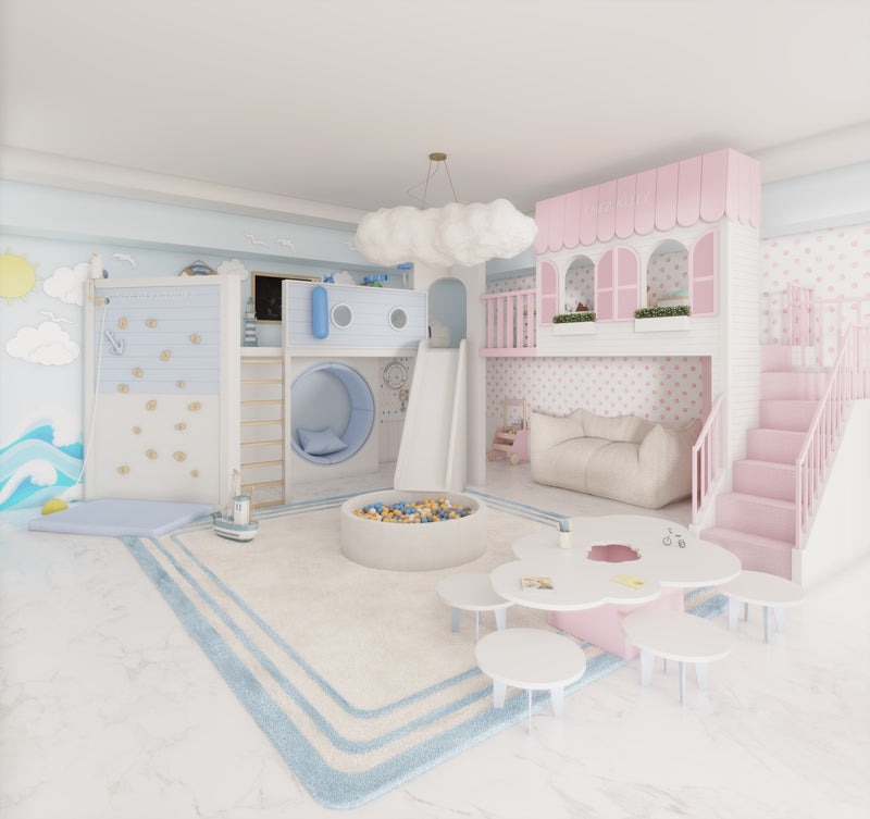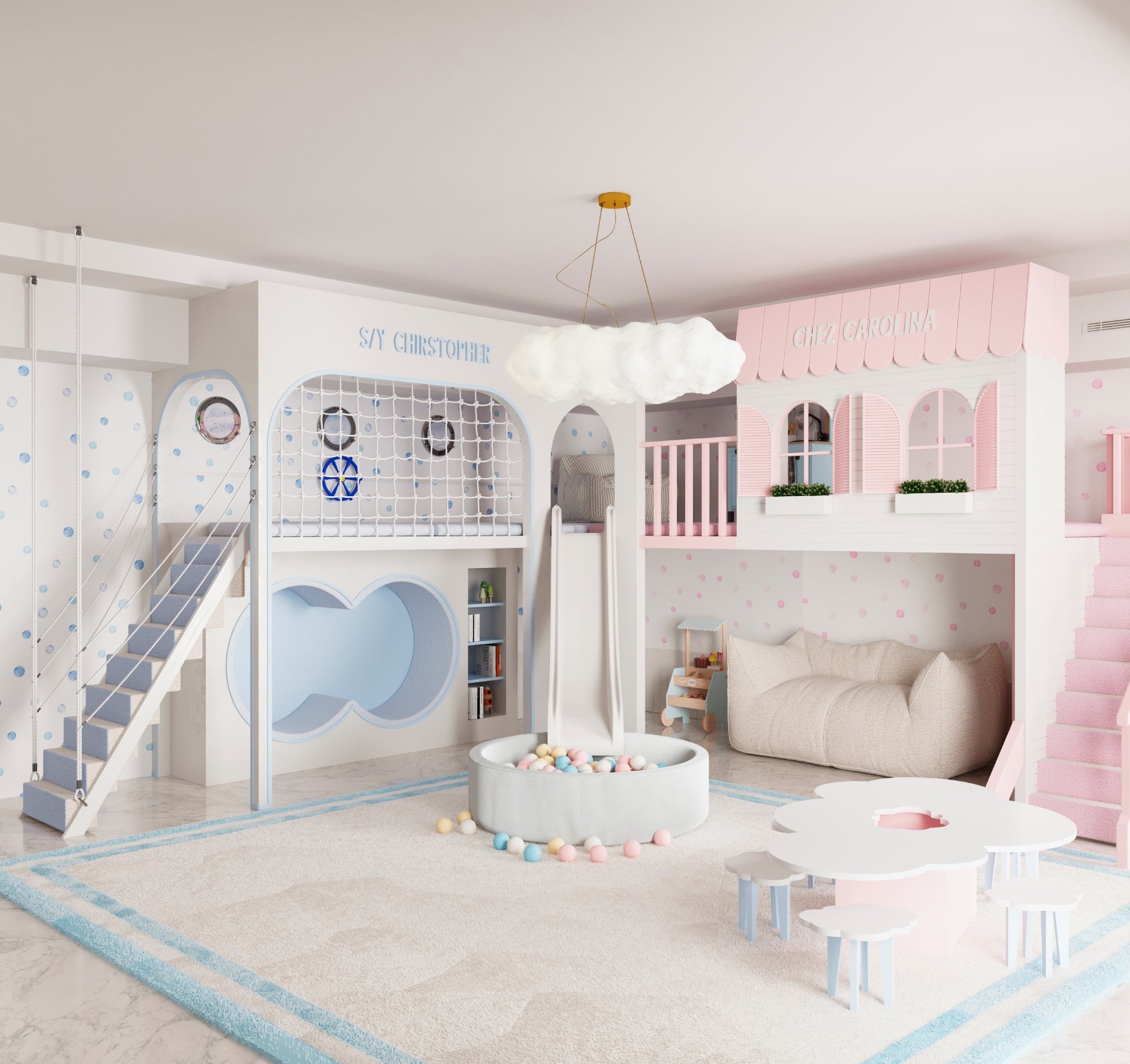 Both children can reunite through a tunnel joining both sides and slide through the ball pool ! They will land on a thick, cos, hypoallergenic carpet and can draw on our custom Mathy By Bols cloud table. The iconic Circu cloud lamp and both custom wallpapers, one with watercolour dots in shades of pink and one with a beach landscape create the perfect backdrop for the original structure.