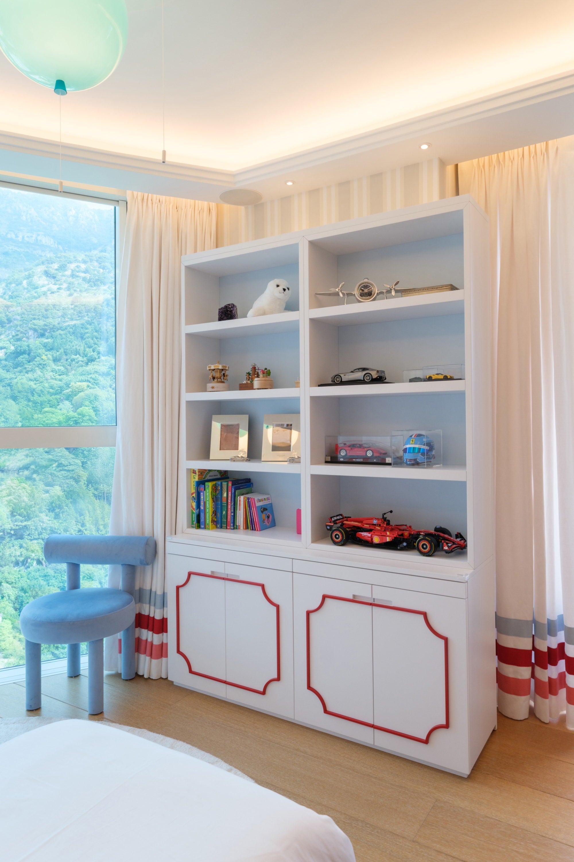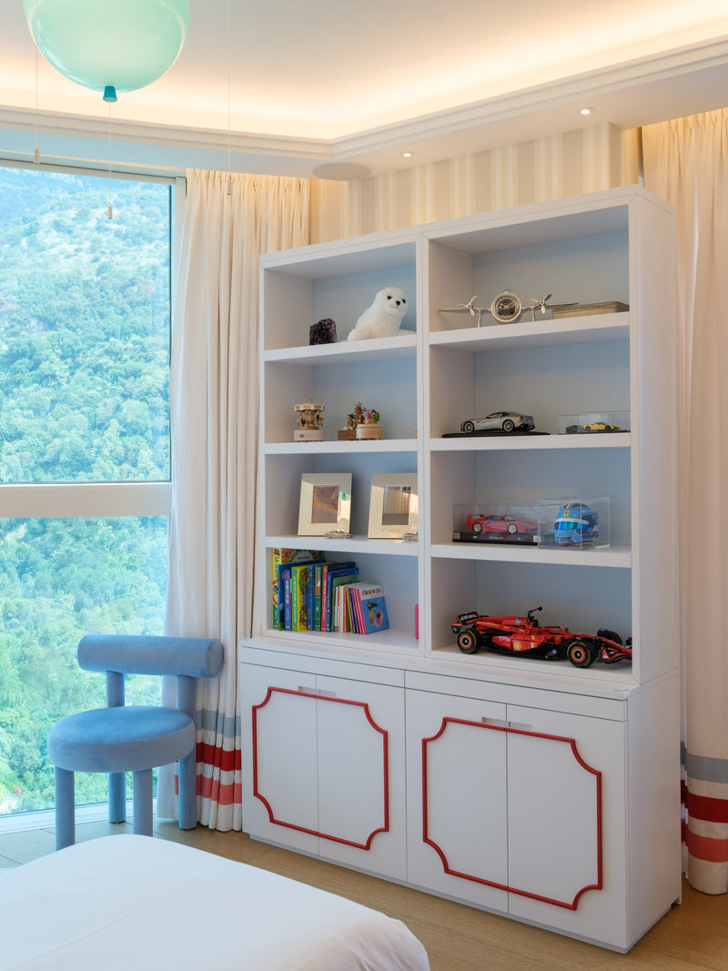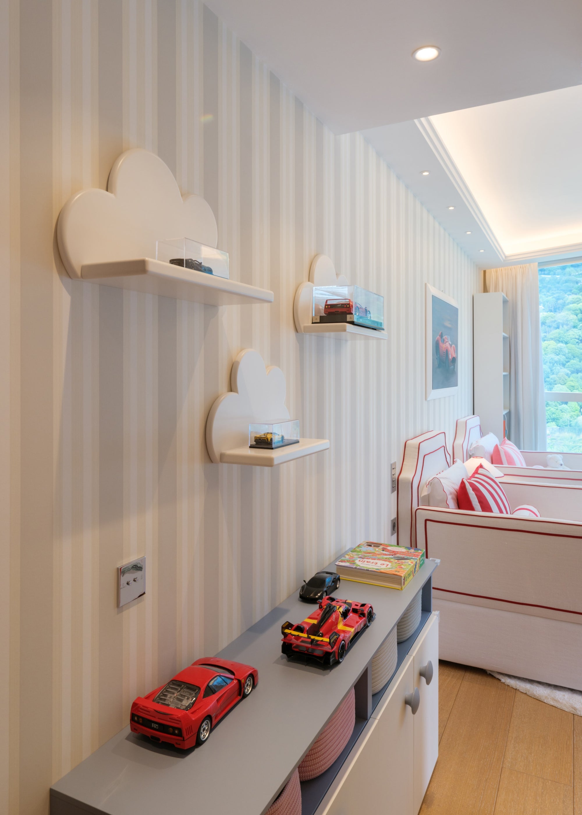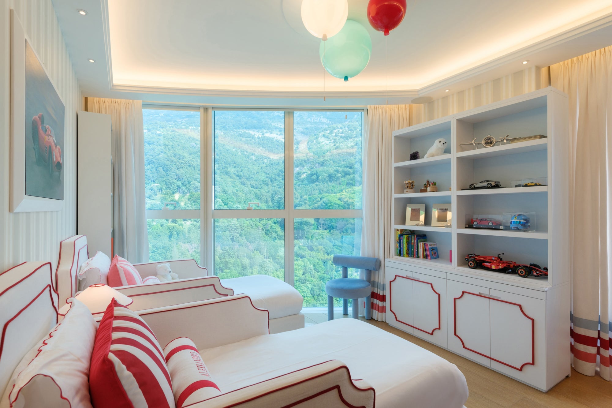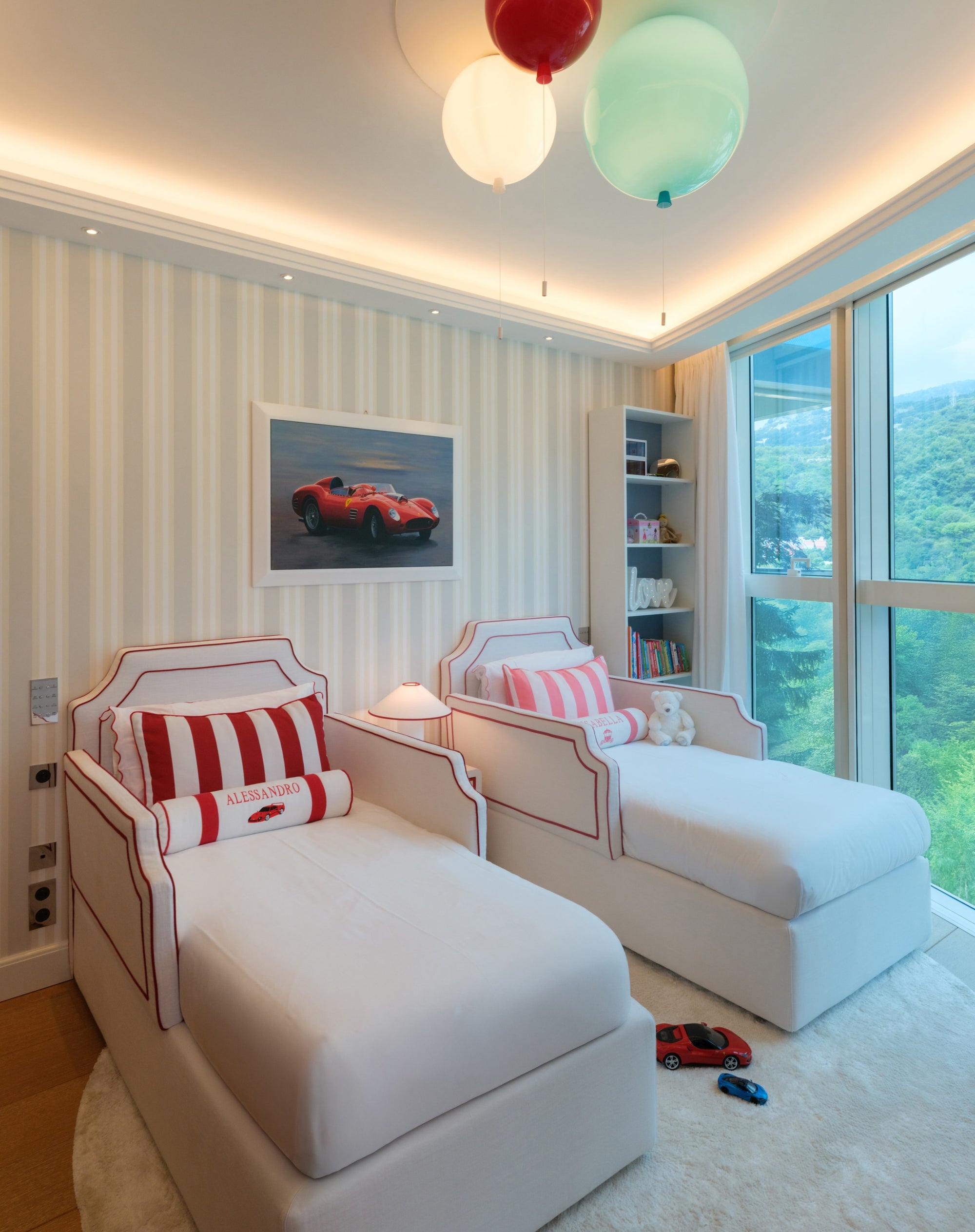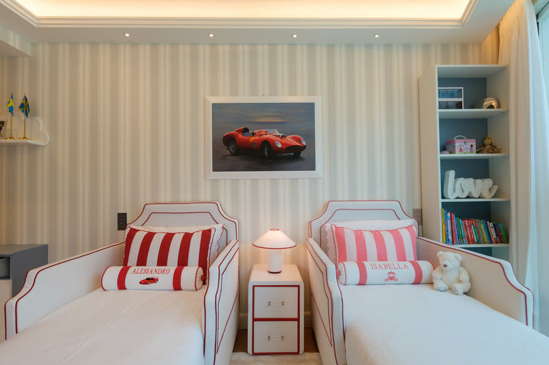 The room features a charming carriage for the little girl and a sleek Ferrari for the boy, carried through in the cushion embroideries and matching illustrations. To avoid an overwhelming red and pink palette, we introduced touches of celestial blue in the wallpaper. This harmonious blend of colors is also reflected in the balloon ceiling lights and the curtains.
