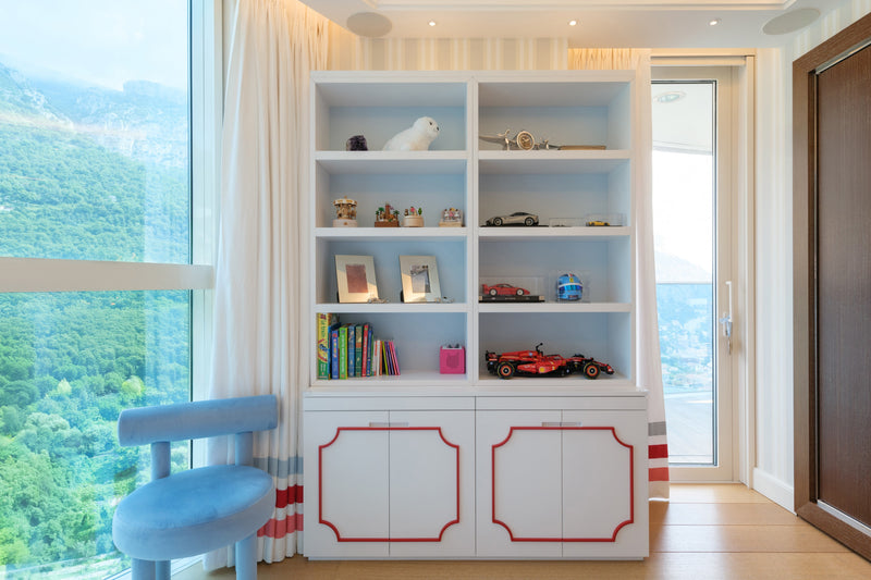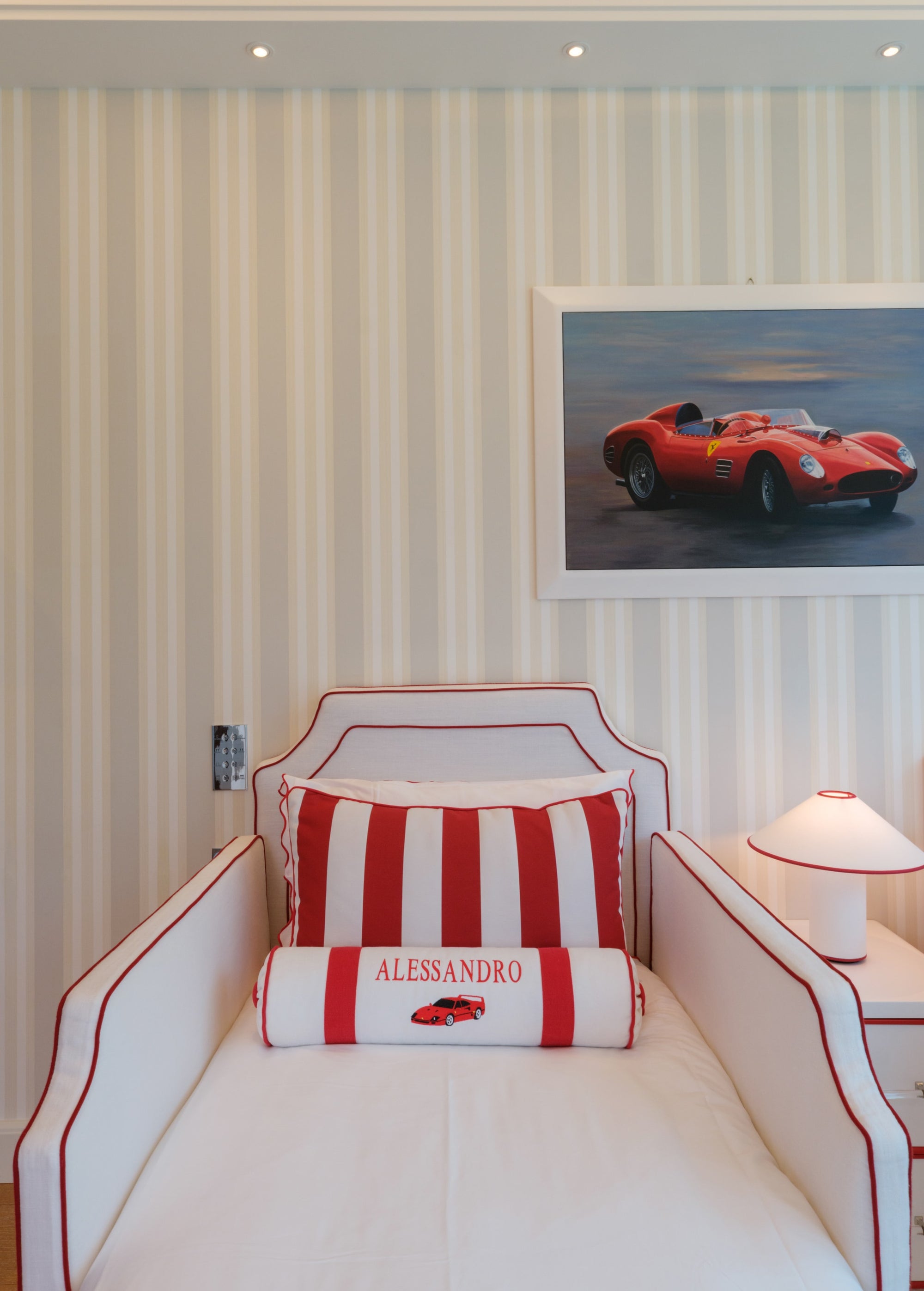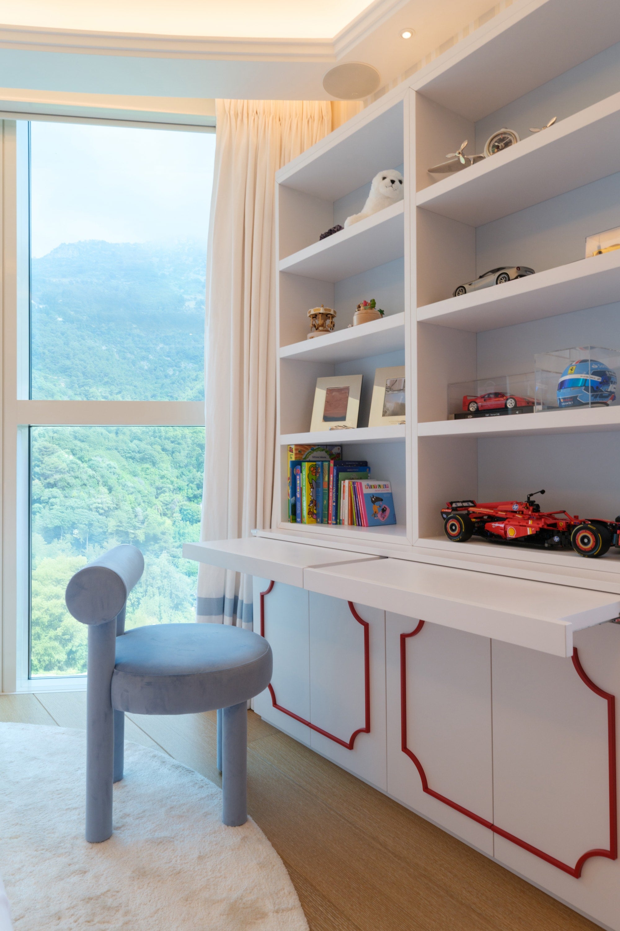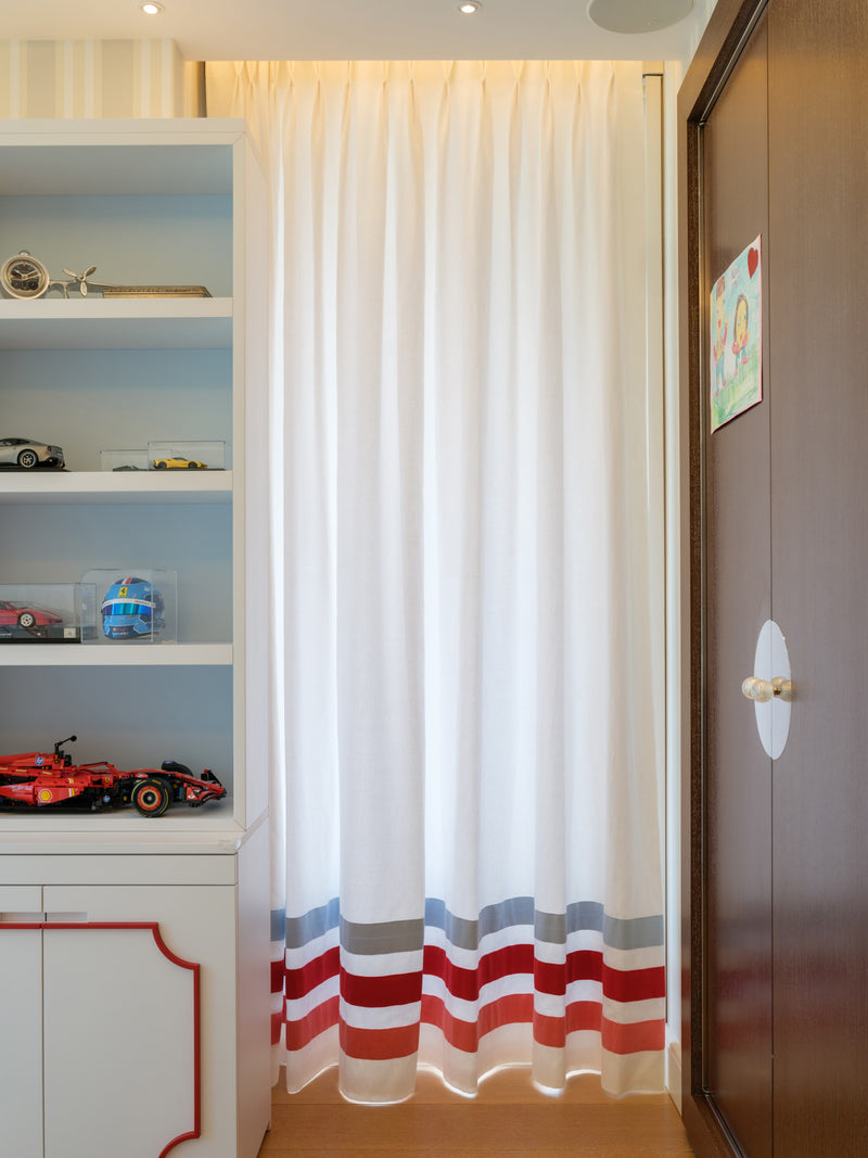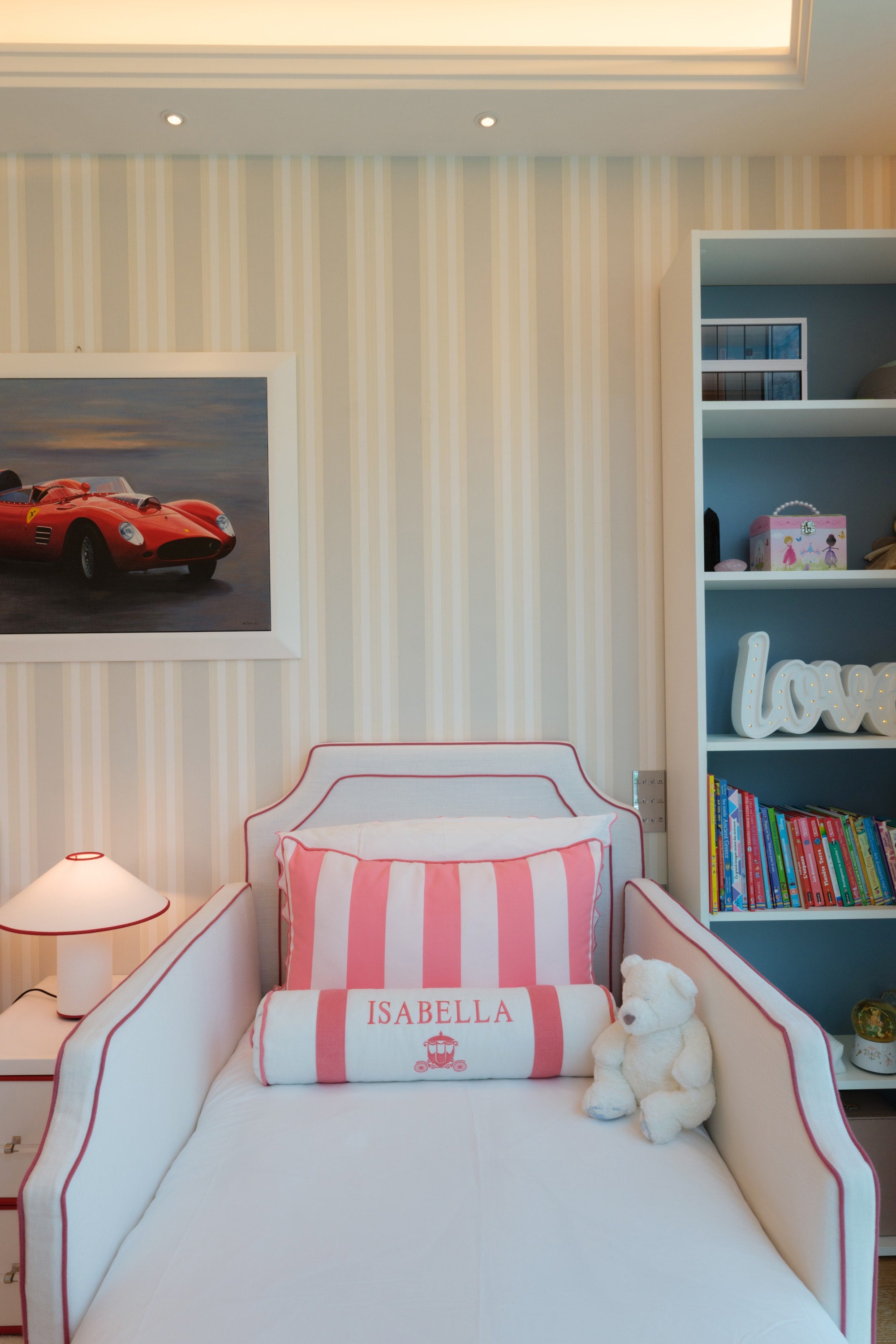 The room features a charming carriage for the little girl and a sleek Ferrari for the boy, carried through in the cushion embroideries and matching illustrations. To avoid an overwhelming red and pink palette, we introduced touches of celestial blue in the wallpaper. This harmonious blend of colors is also reflected in the balloon ceiling lights and the curtains.