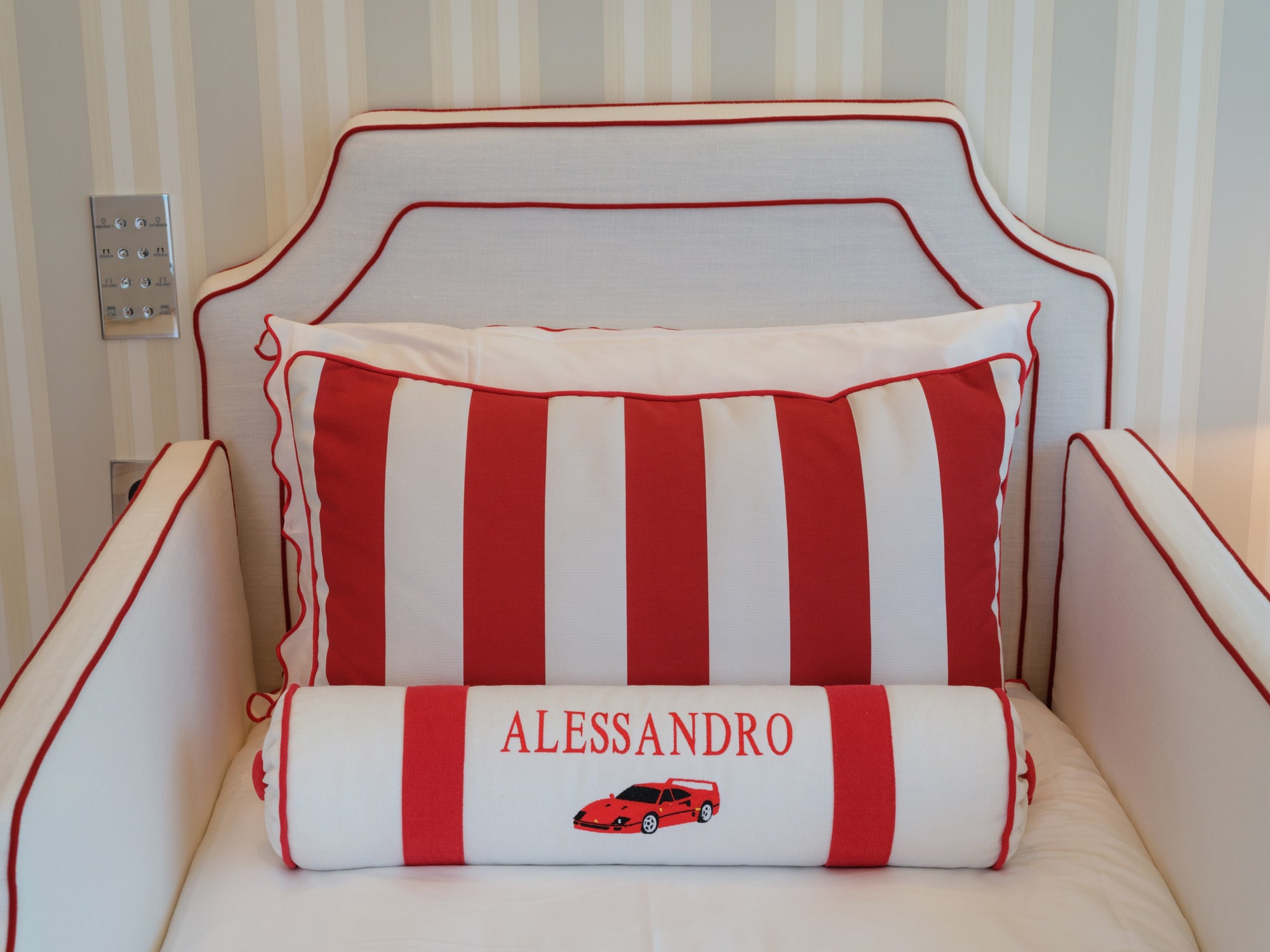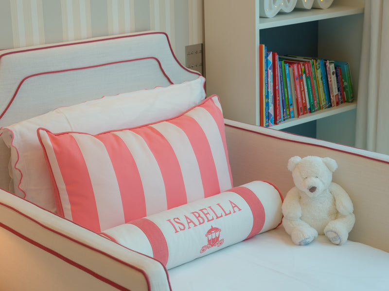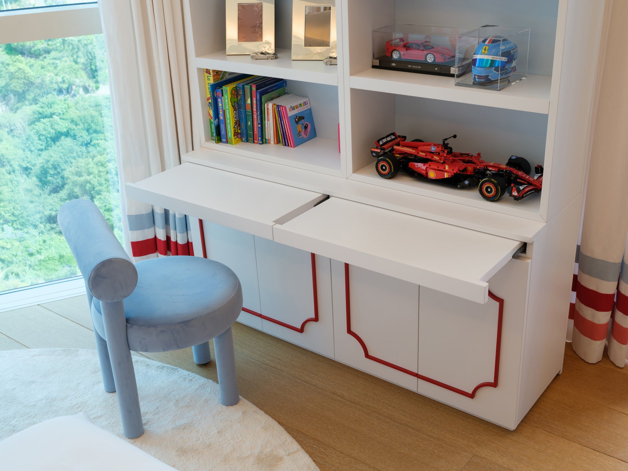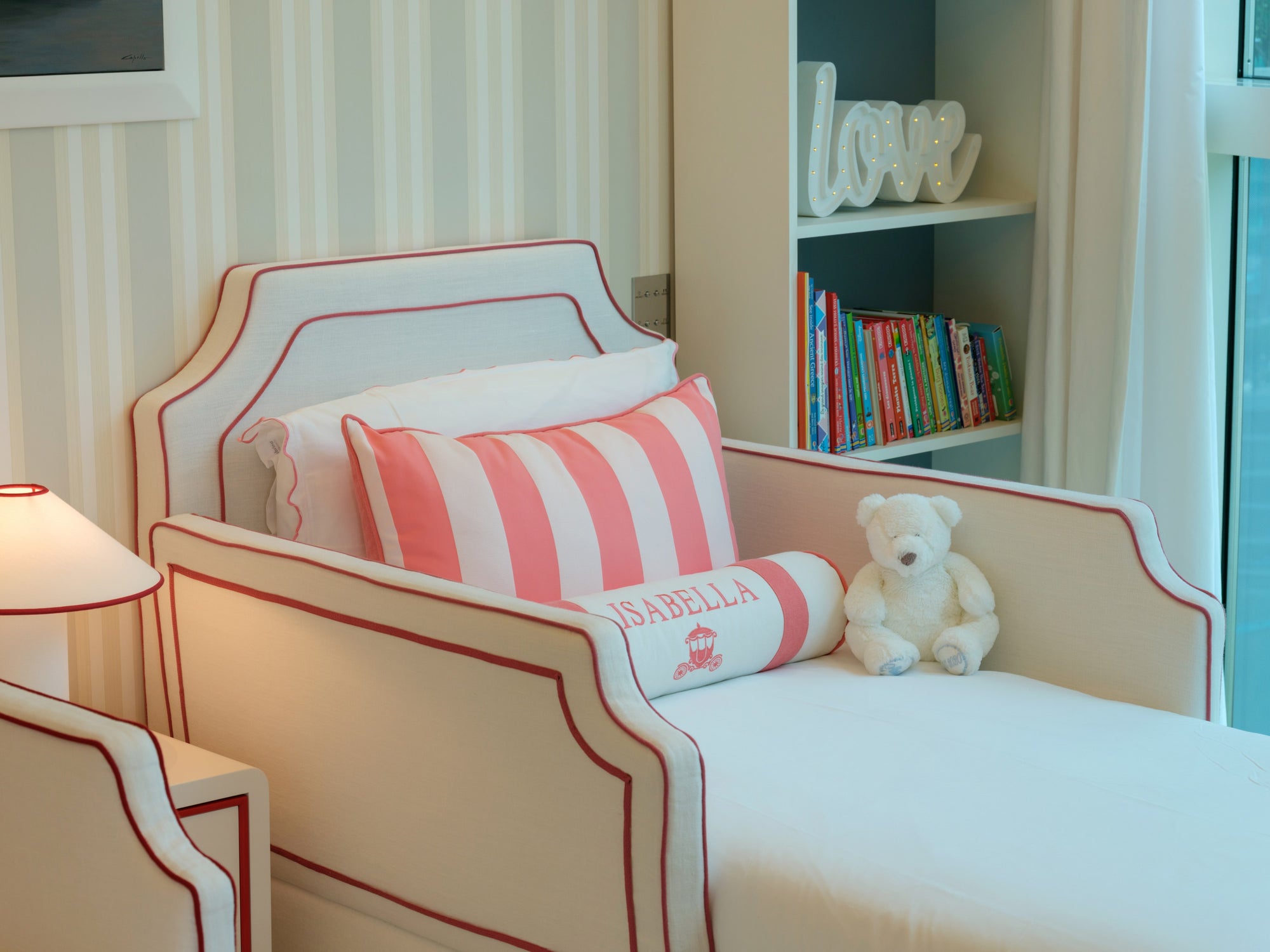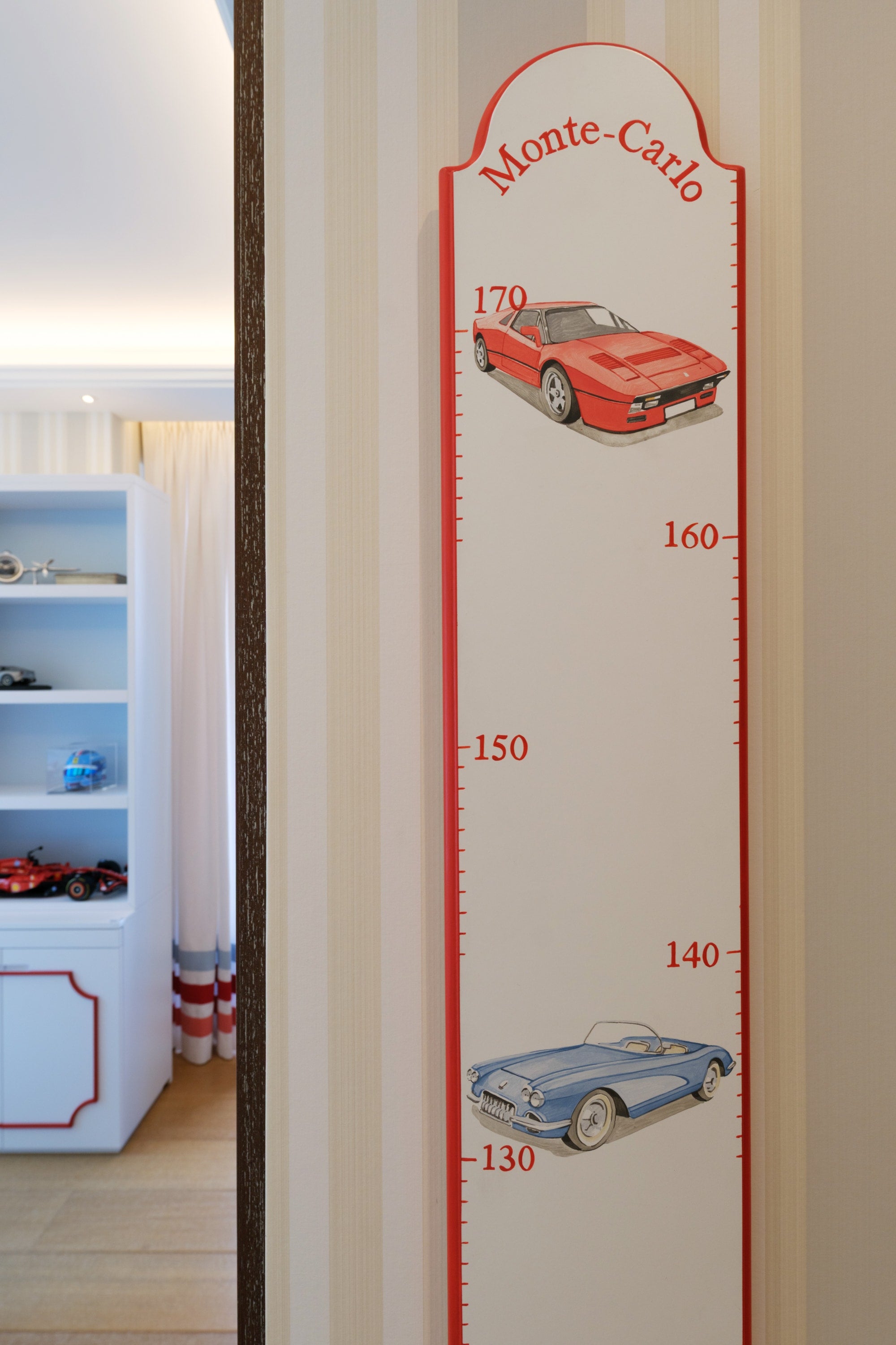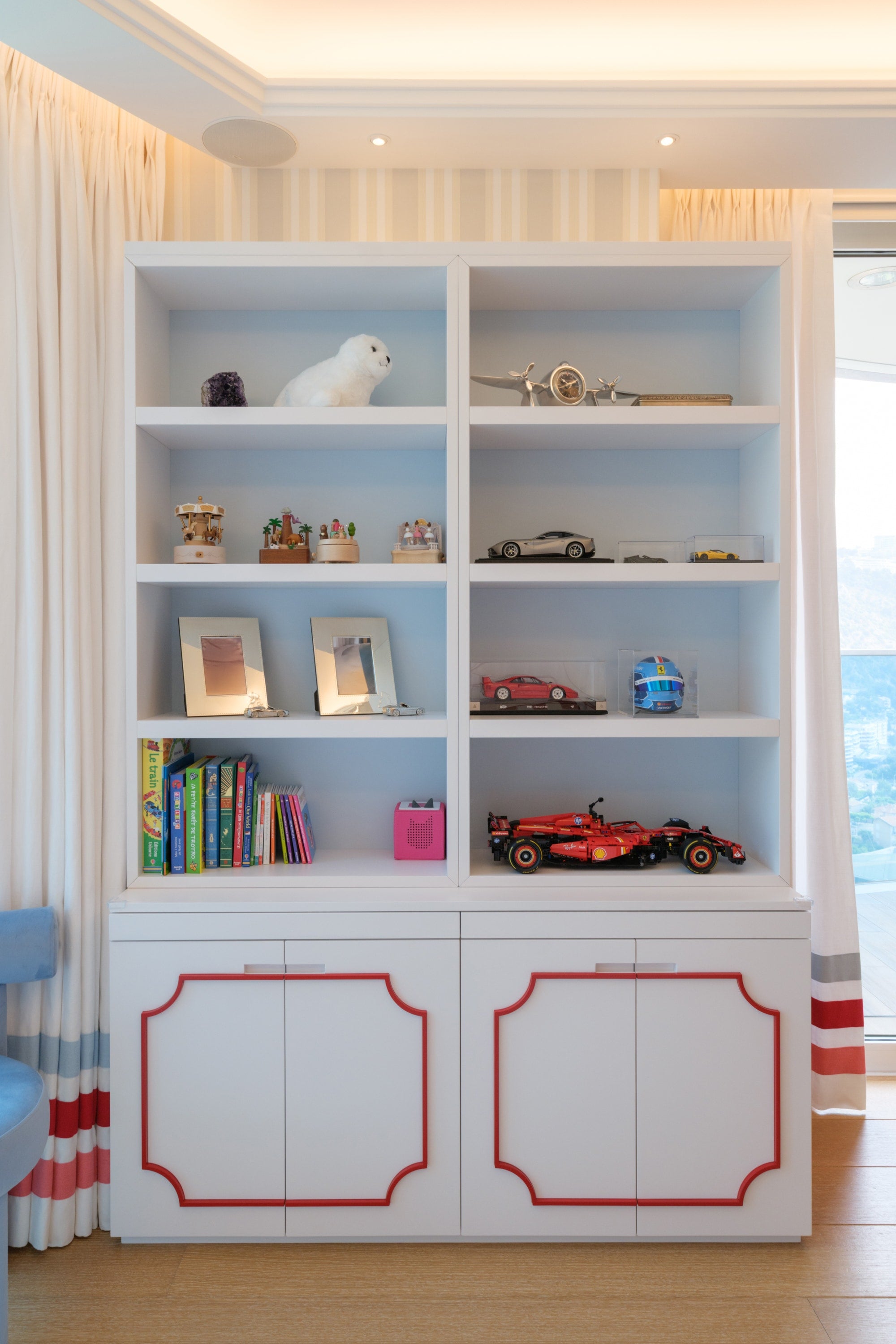 The room features a charming carriage for the little girl and a sleek Ferrari for the boy, carried through in the cushion embroideries and matching illustrations. To avoid an overwhelming red and pink palette, we introduced touches of celestial blue in the wallpaper. This harmonious blend of colors is also reflected in the balloon ceiling lights and the curtains.