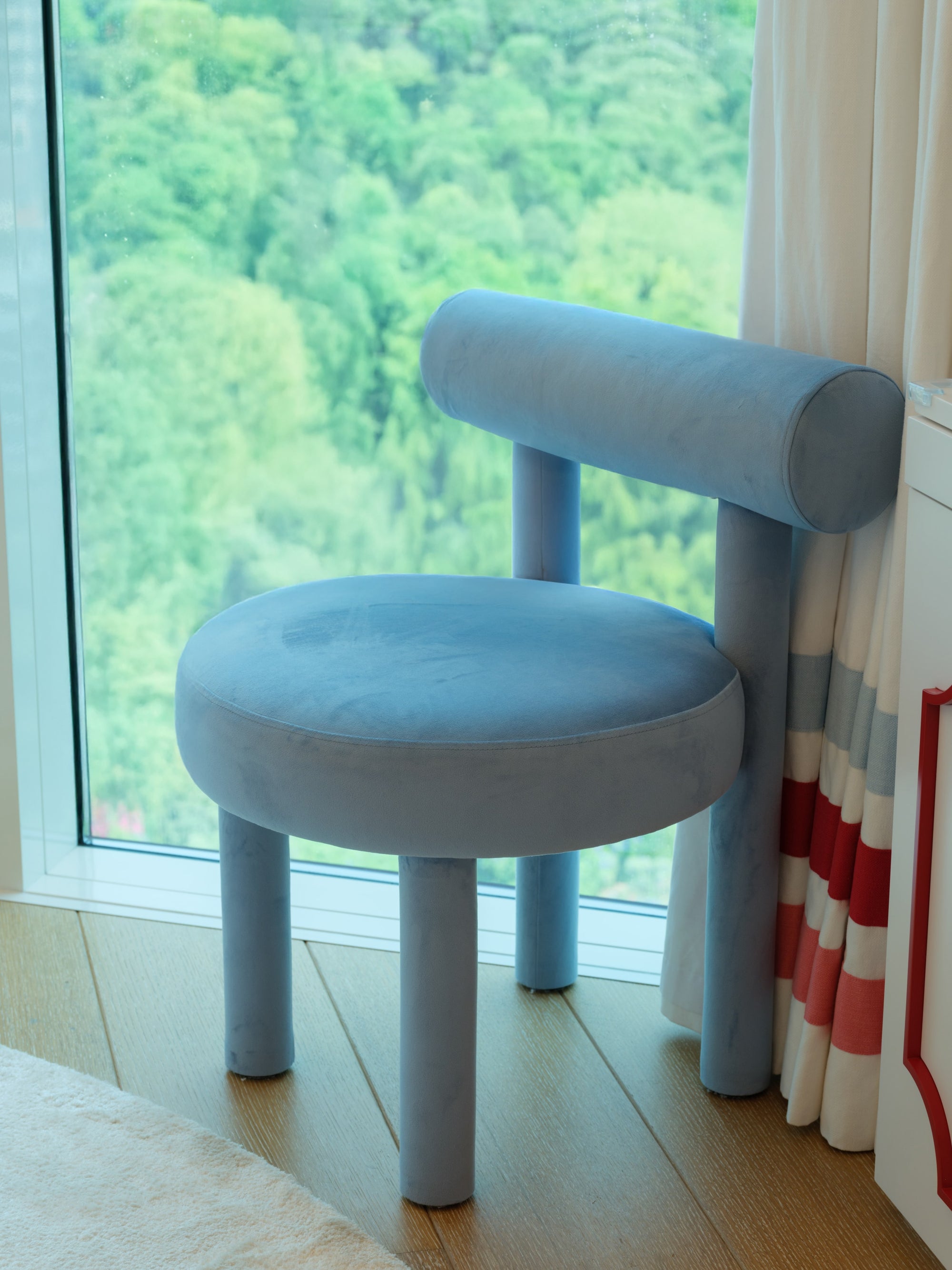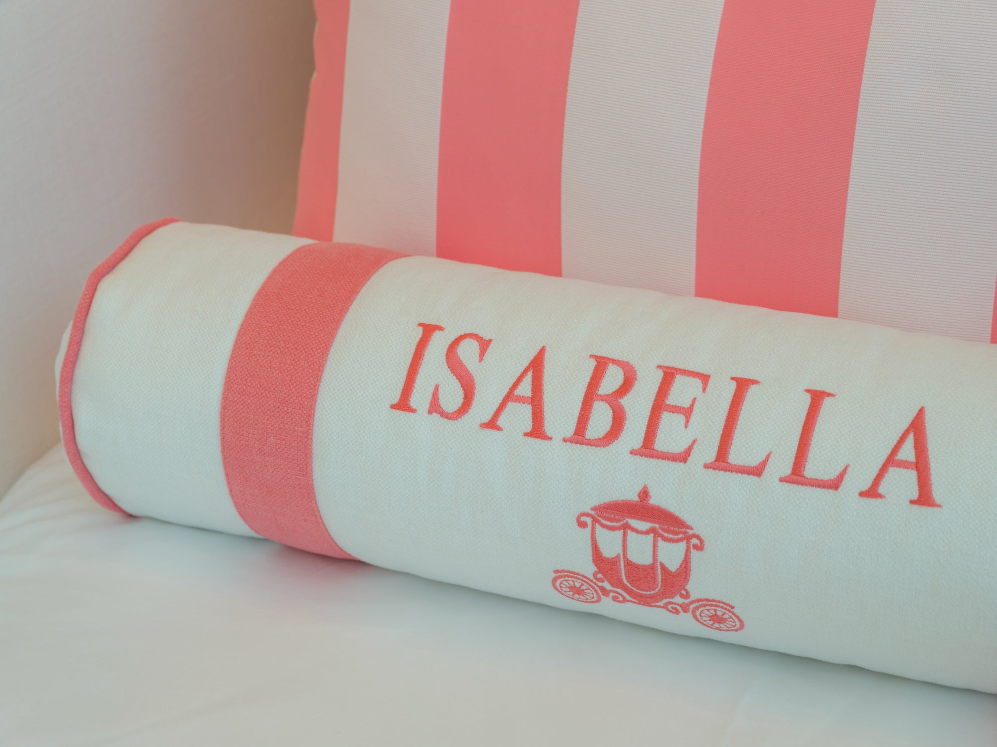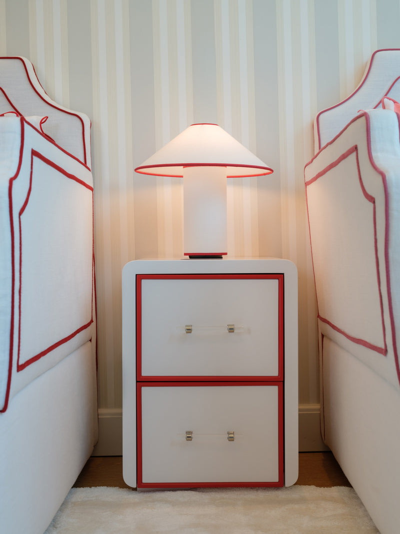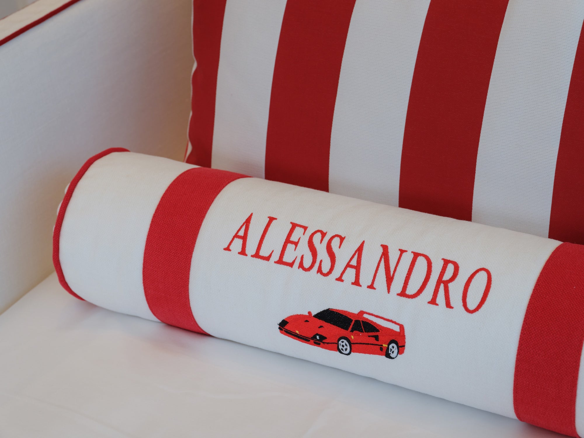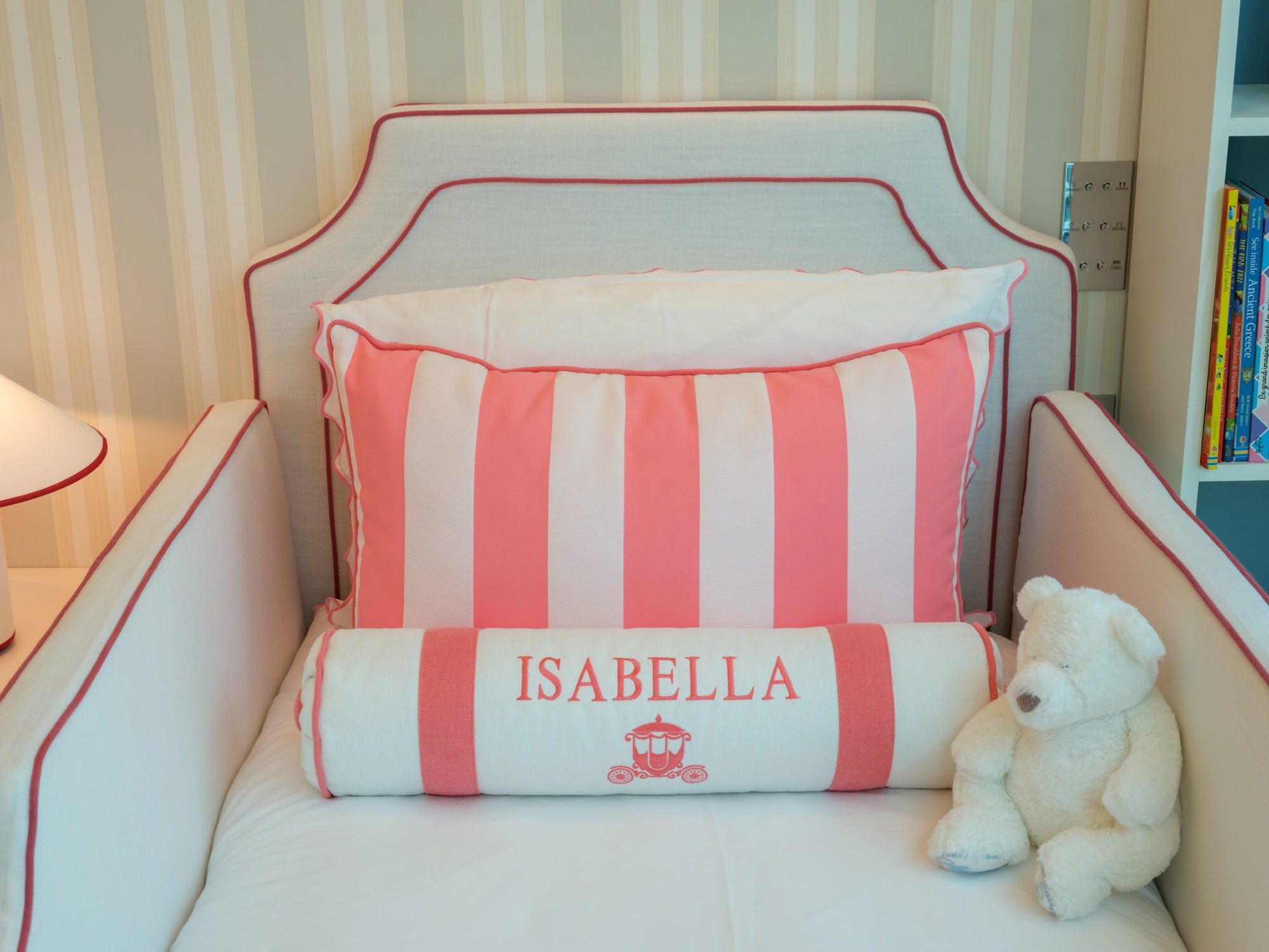 The room features a charming carriage for the little girl and a sleek Ferrari for the boy, carried through in the cushion embroideries and matching illustrations. To avoid an overwhelming red and pink palette, we introduced touches of celestial blue in the wallpaper. This harmonious blend of colors is also reflected in the balloon ceiling lights and the curtains.
