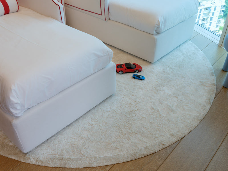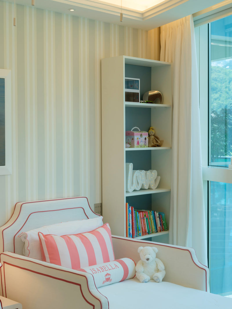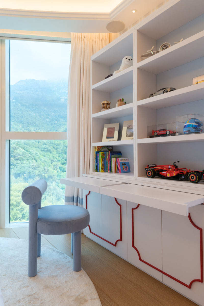The custom small beds are equipped with protective side barriers, crafted by our skilled upholsterer. Given the limited space, we optimized storage by incorporating a multifunctional bookcase with pull-out trays serve as tabletops. This thoughtful design ensures both functionality and aesthetic appeal, making the room both practical and enchanting.