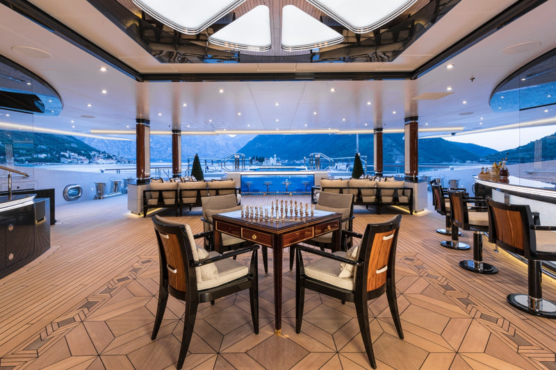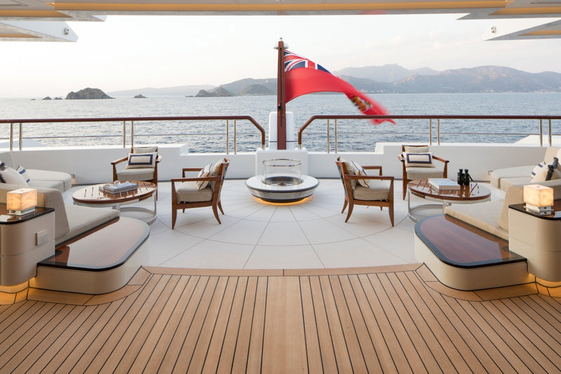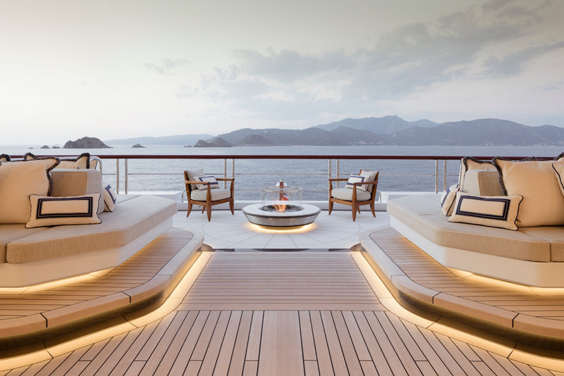 We provided all the furniture for the outdoor decks, crafted with the highest quality of teak and varnished wood, and designed sumptuous cushions with luxurious fabrics and trimmings from Dedar.
