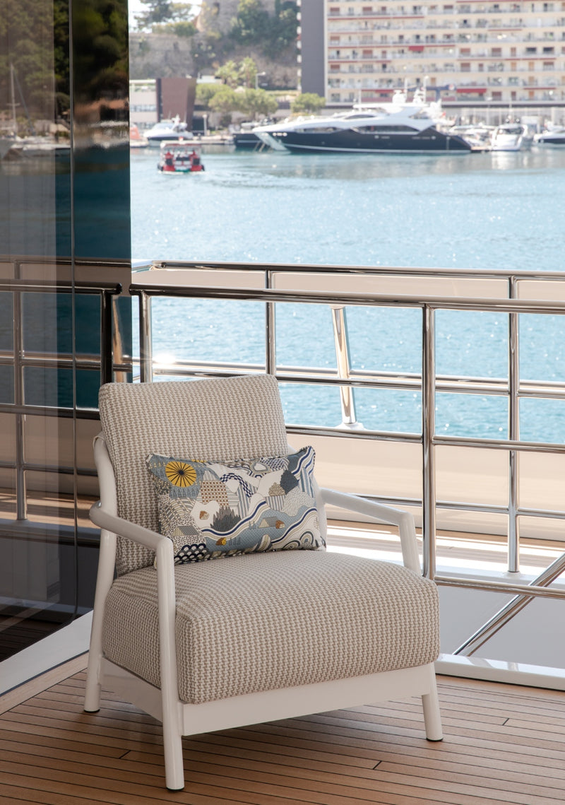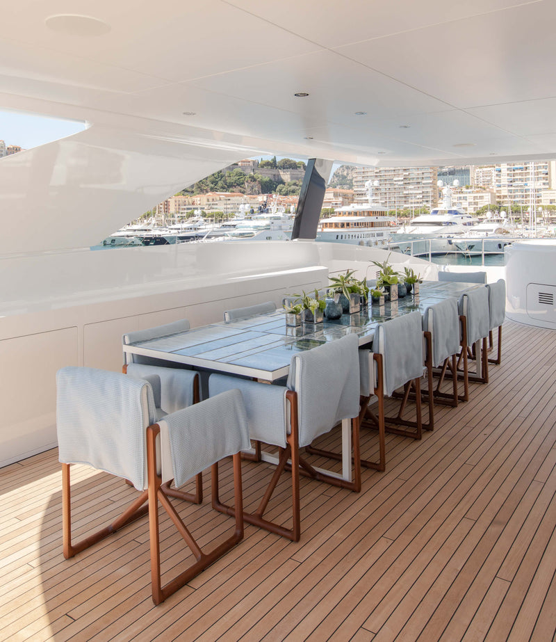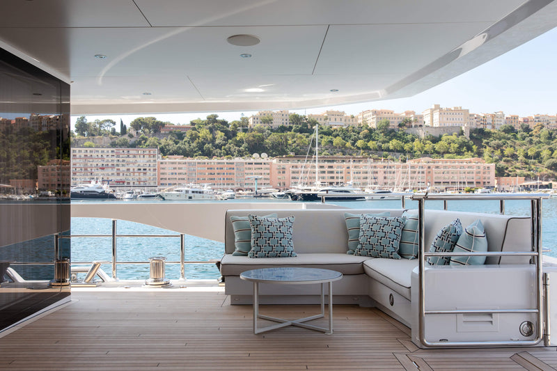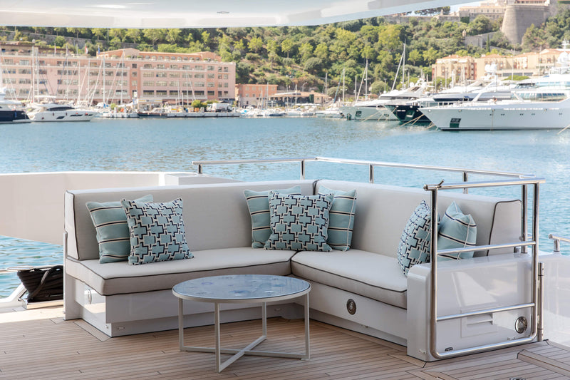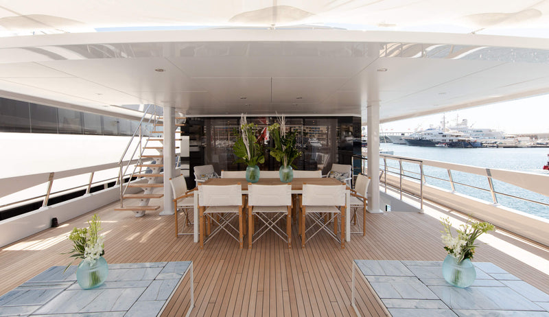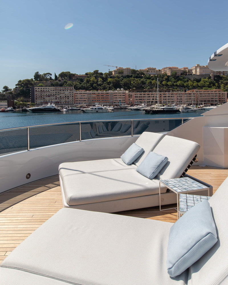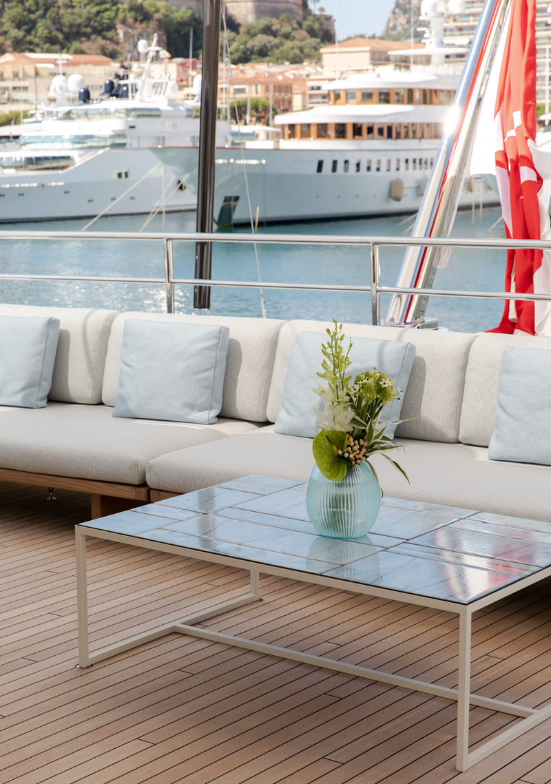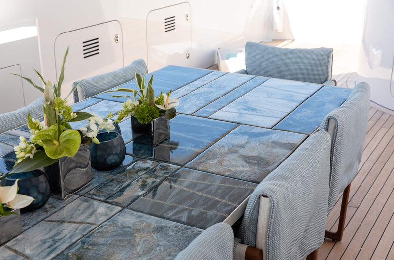 To elevate the onboard experience further, we collaborated with artist Marella Ferrara to customize Paola Lenti outdoor furniture. The result is a collection of ceramic tables in the iconic blue of the boat, fusing artistry with practicality.