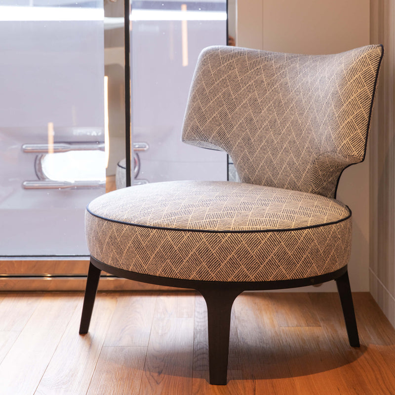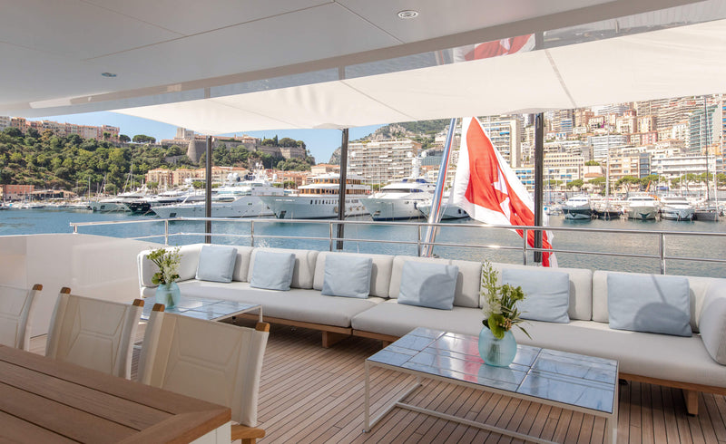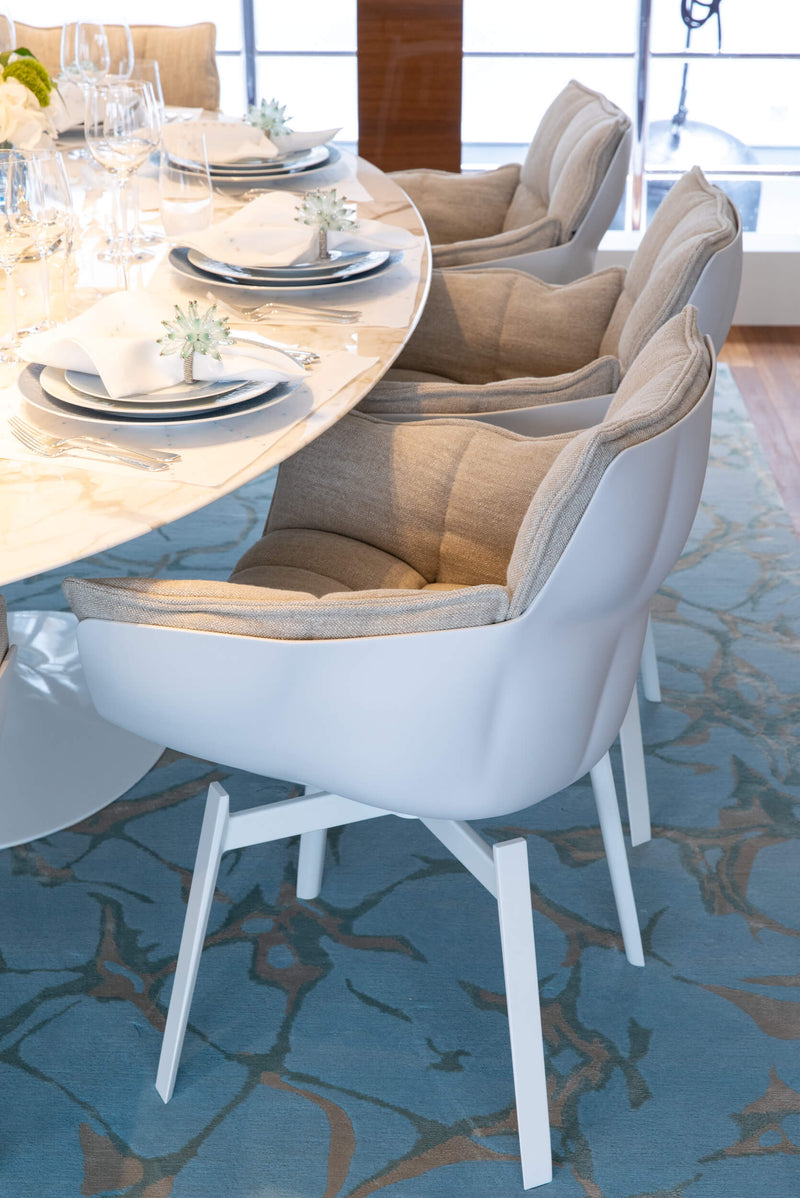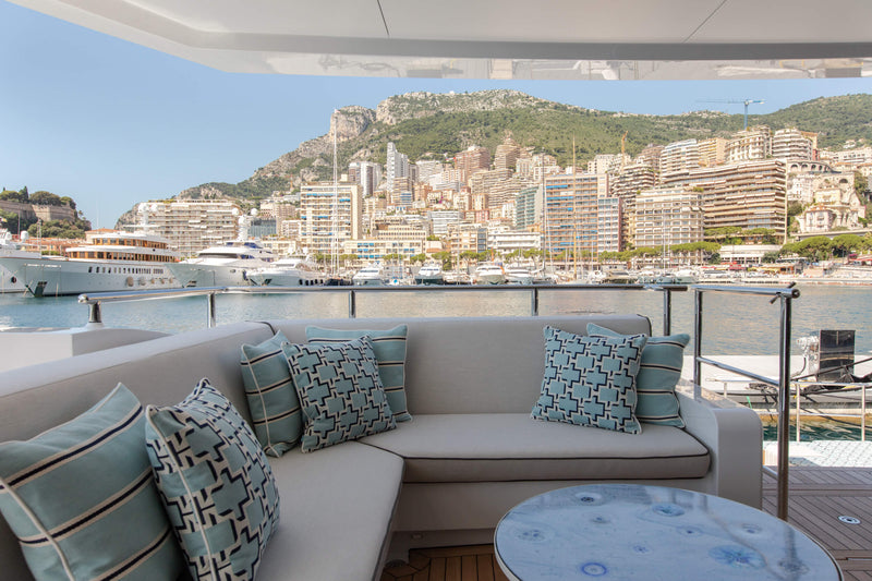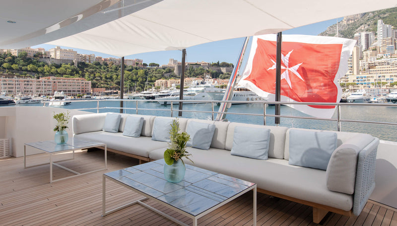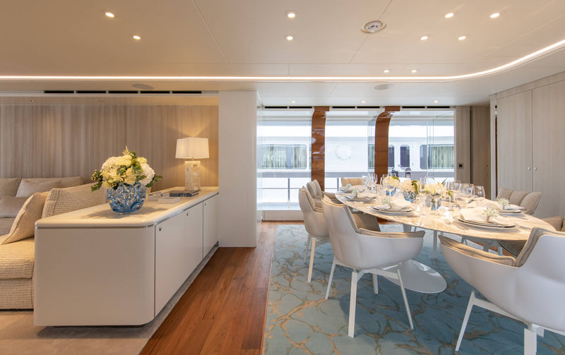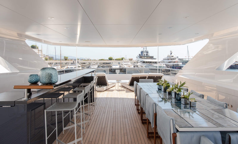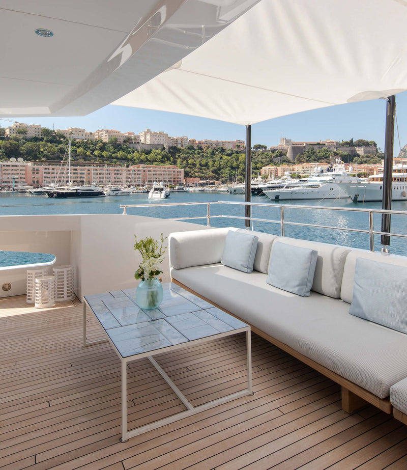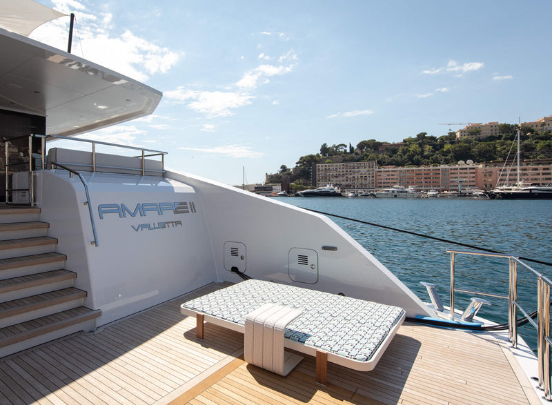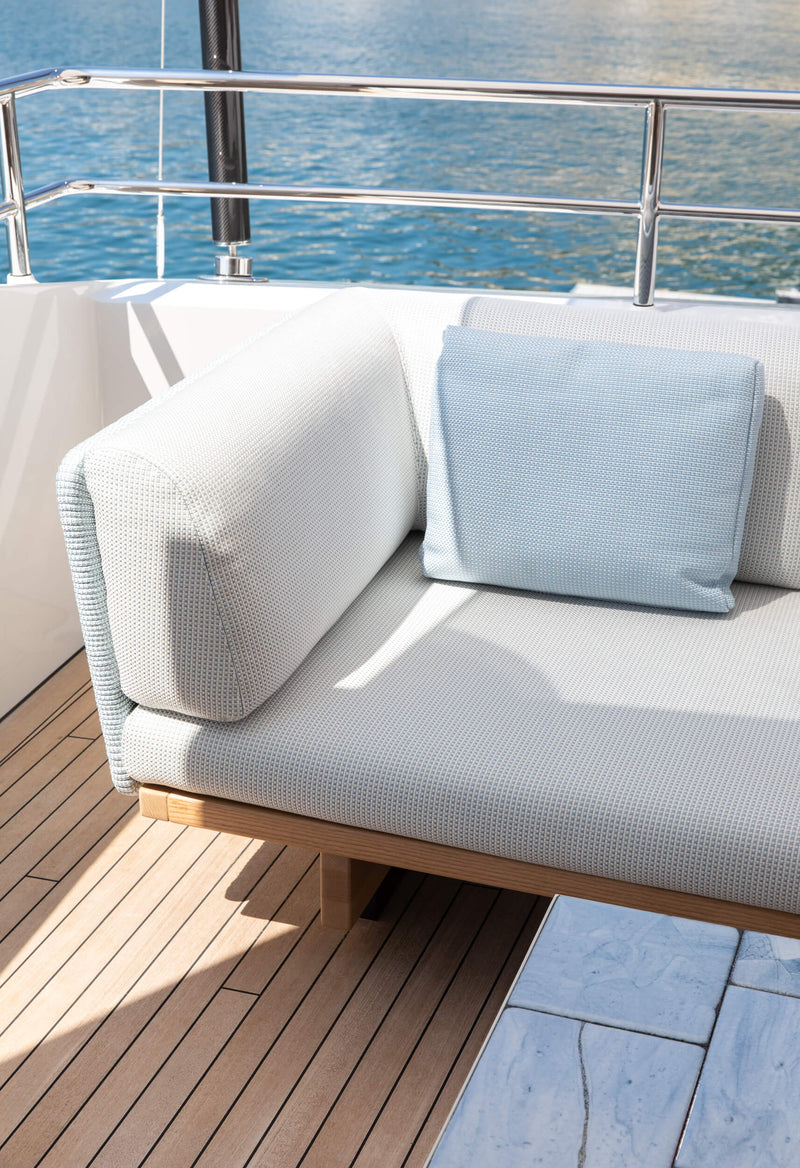 To elevate the onboard experience further, we collaborated with artist Marella Ferrara to customize Paola Lenti outdoor furniture. The result is a collection of ceramic tables in the iconic blue of the boat, fusing artistry with practicality.