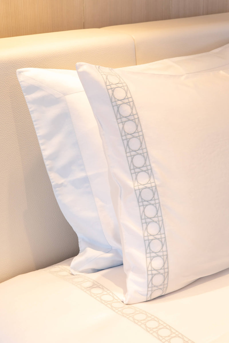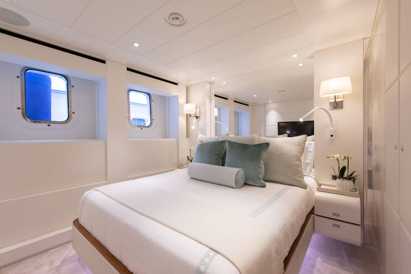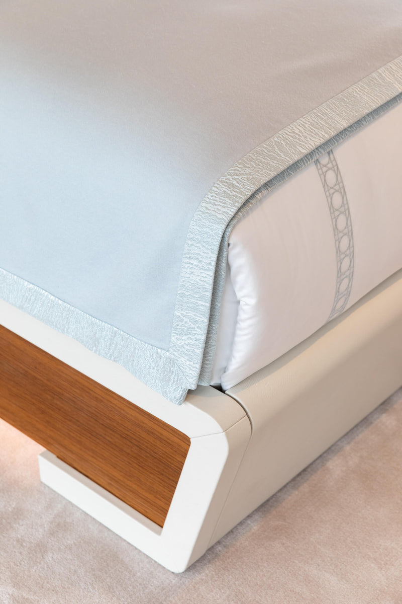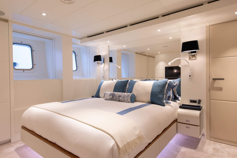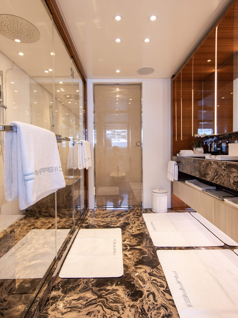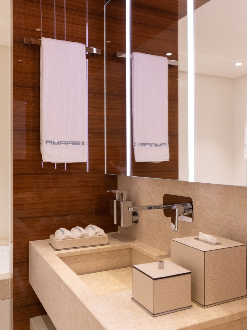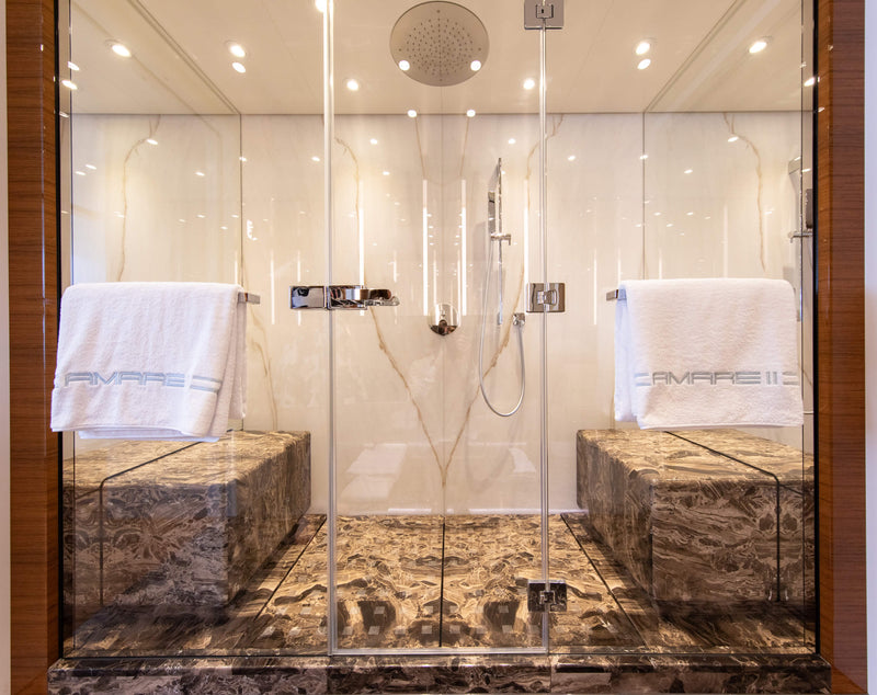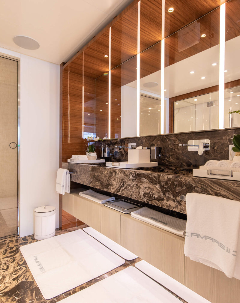 Each cabin in Amare II carries a distinct identity, adorned with luxurious fabrics and bed linen from the most prestigious fabric makers such as Loro Piana, Rubelli, and Dedar, ensuring a haven of comfort and sophistication.