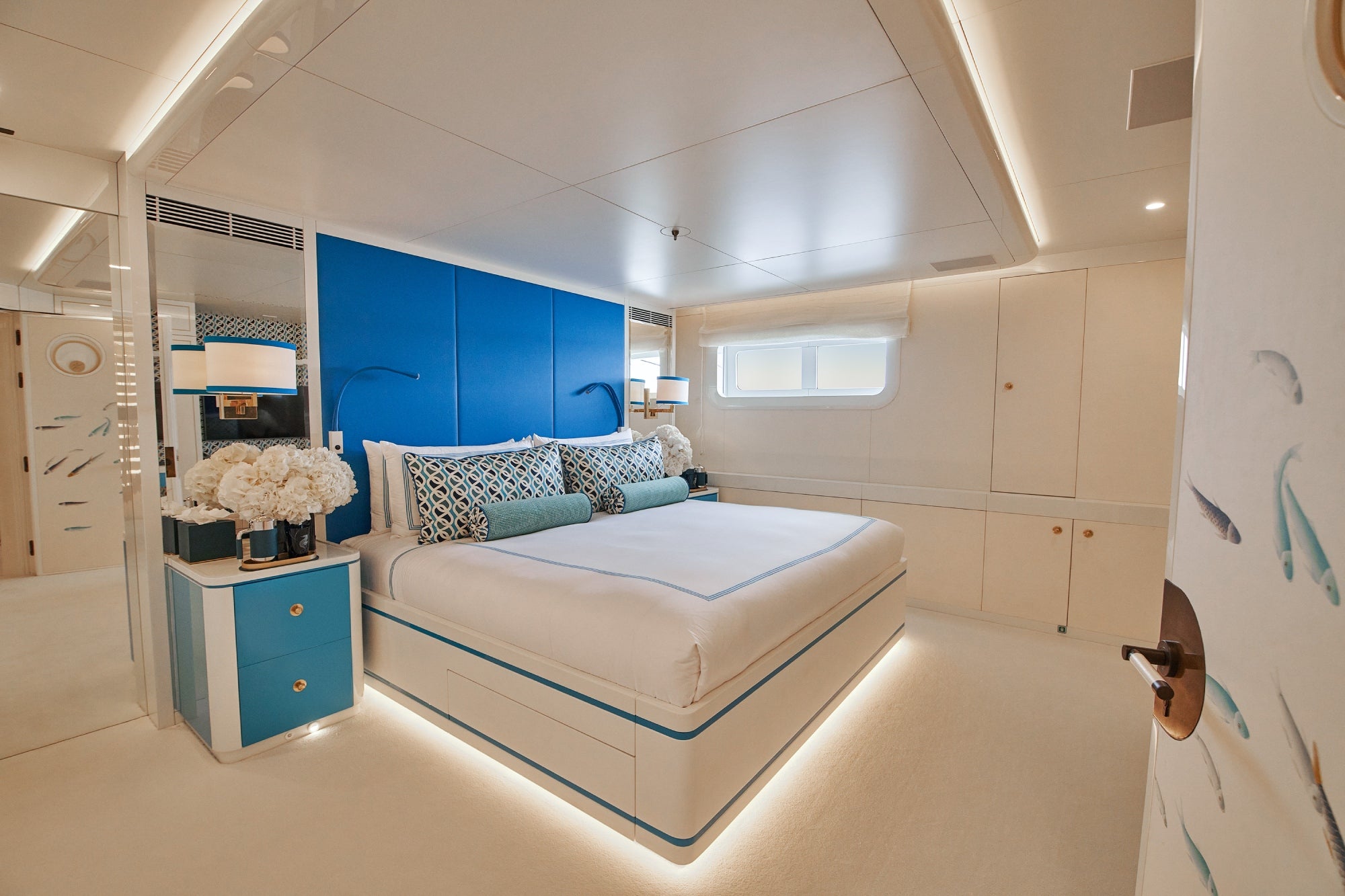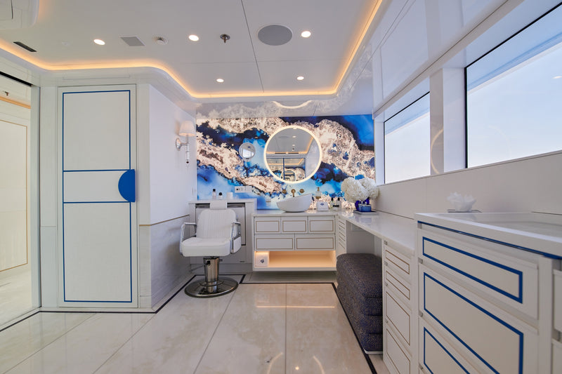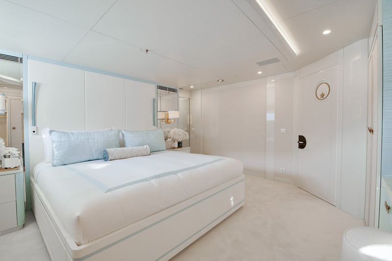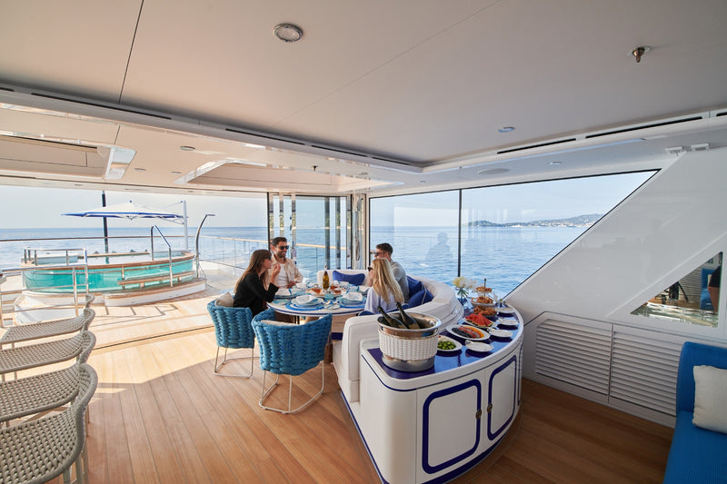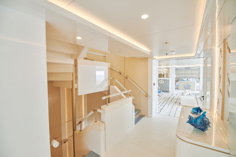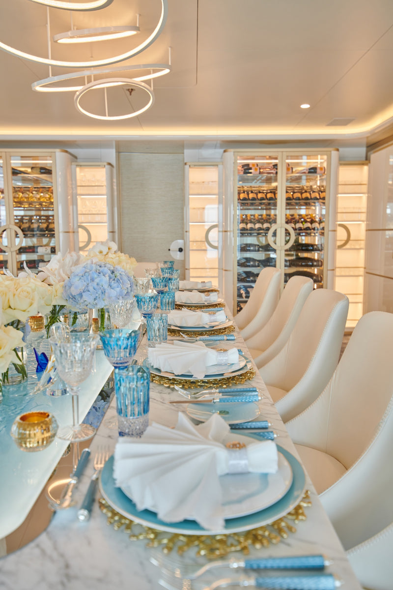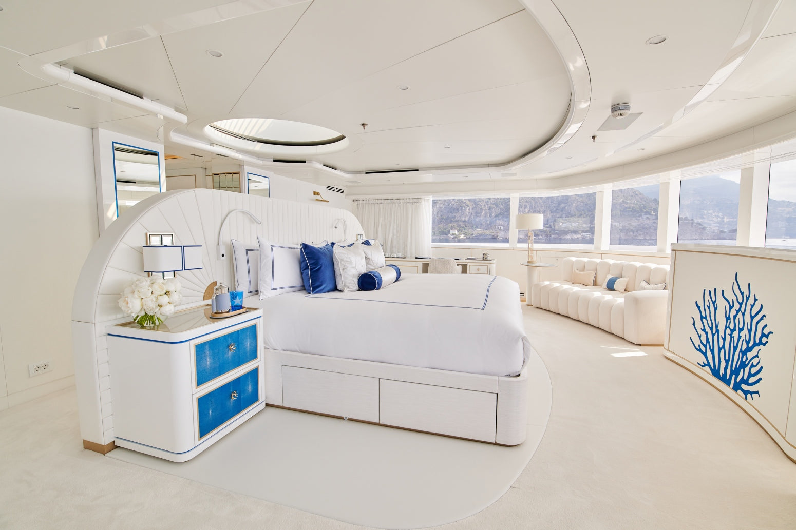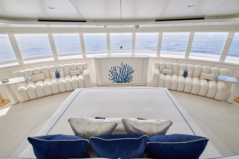 The master bedroom at the bow showcases a coral theme, while each guest cabin boasts a unique marine animal theme, creating an unforgettable and immersive oceanic experience. The exteriors adorned in Paola Lenti custom furniture, make the experience on board one of beauty and comfort.