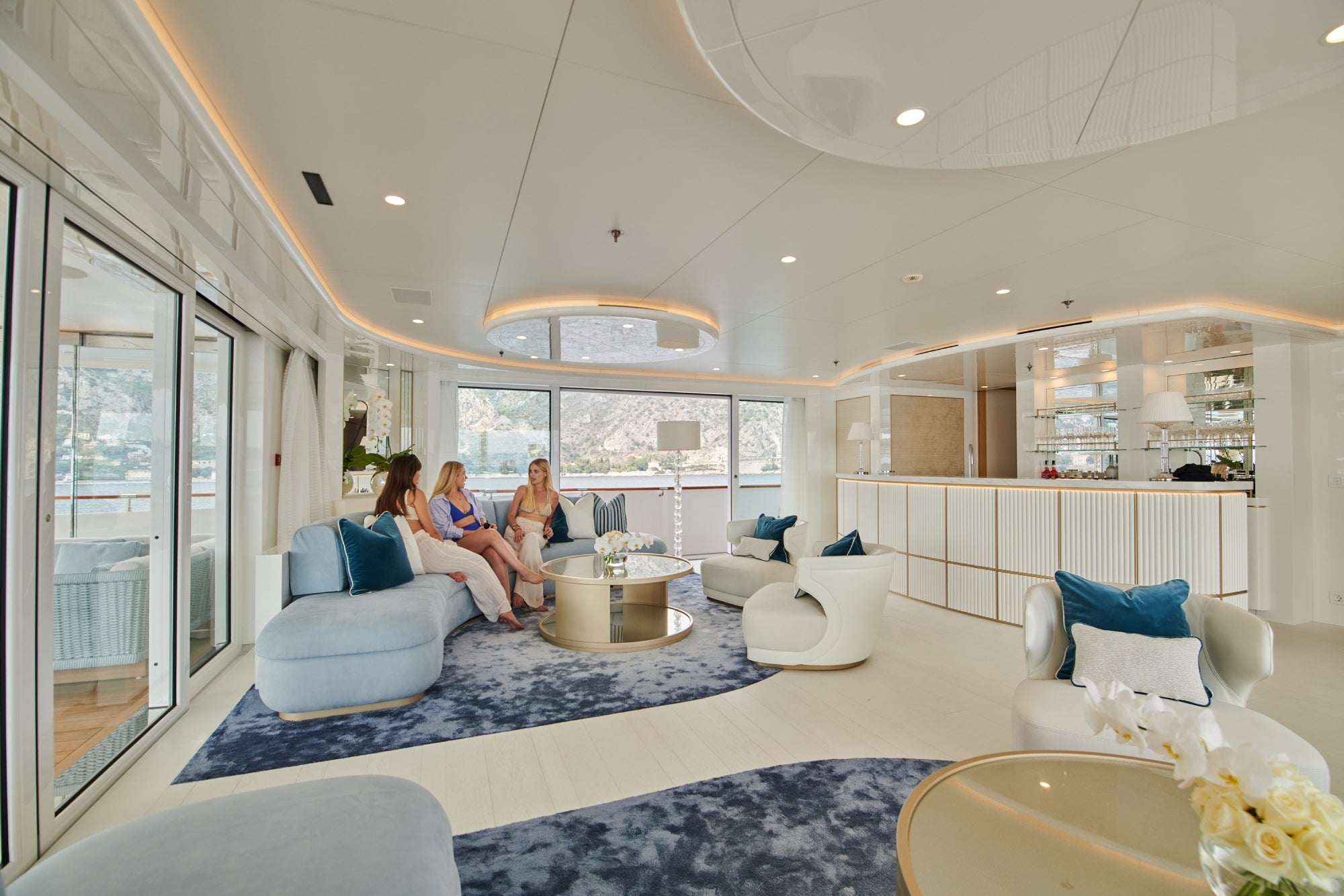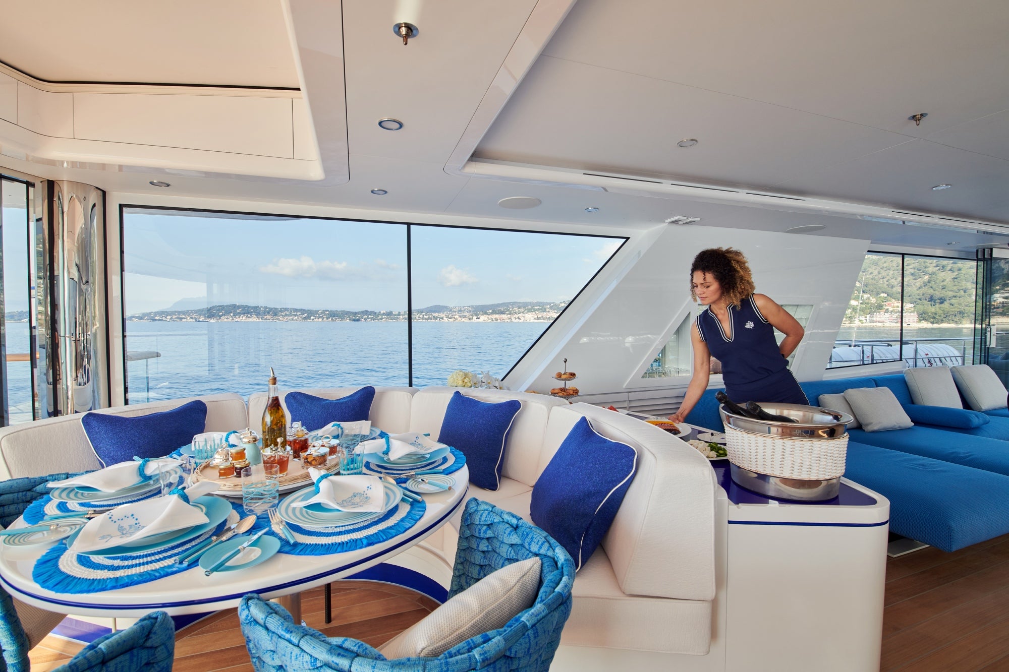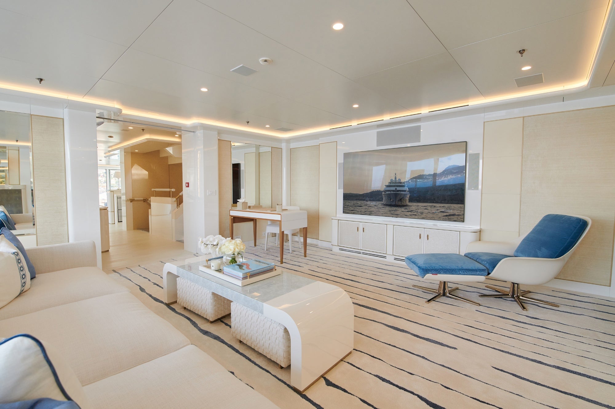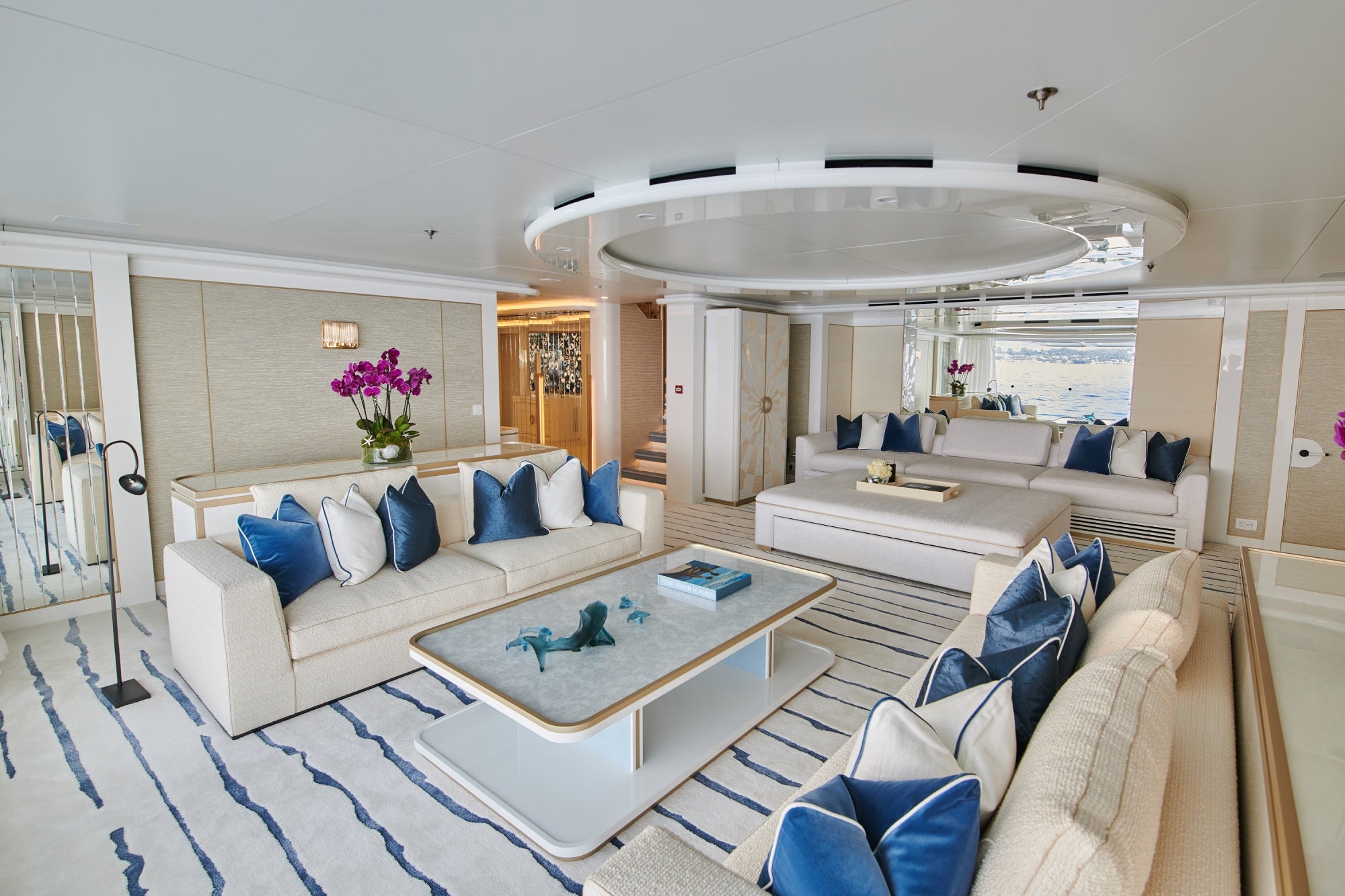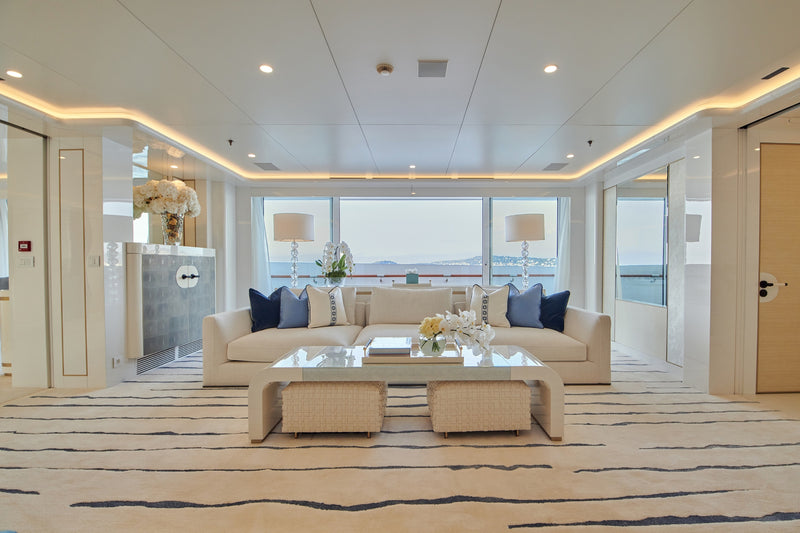 The master bedroom at the bow showcases a coral theme, while each guest cabin boasts a unique marine animal theme, creating an unforgettable and immersive oceanic experience. The exteriors adorned in Paola Lenti custom furniture, make the experience on board one of beauty and comfort.