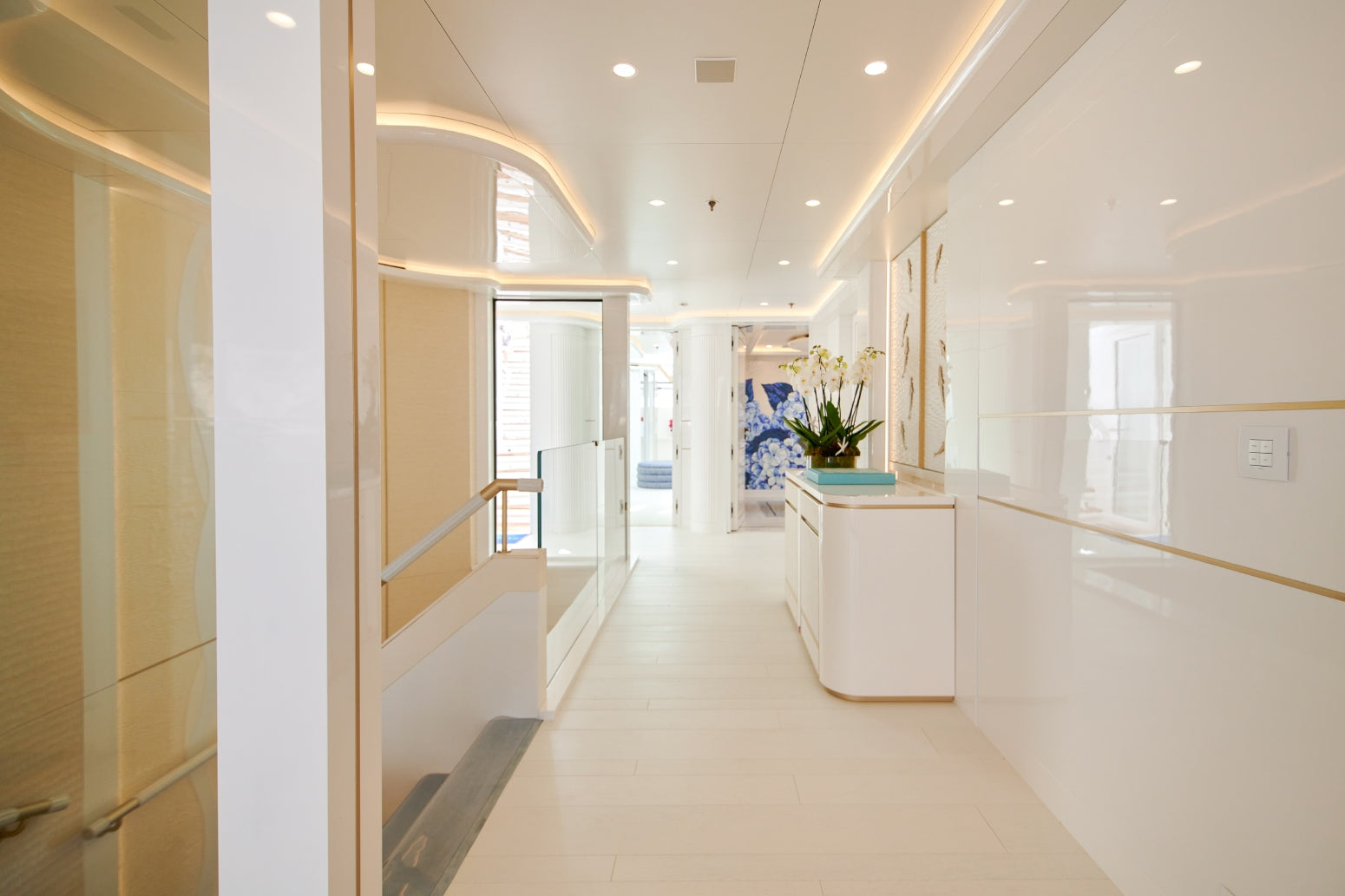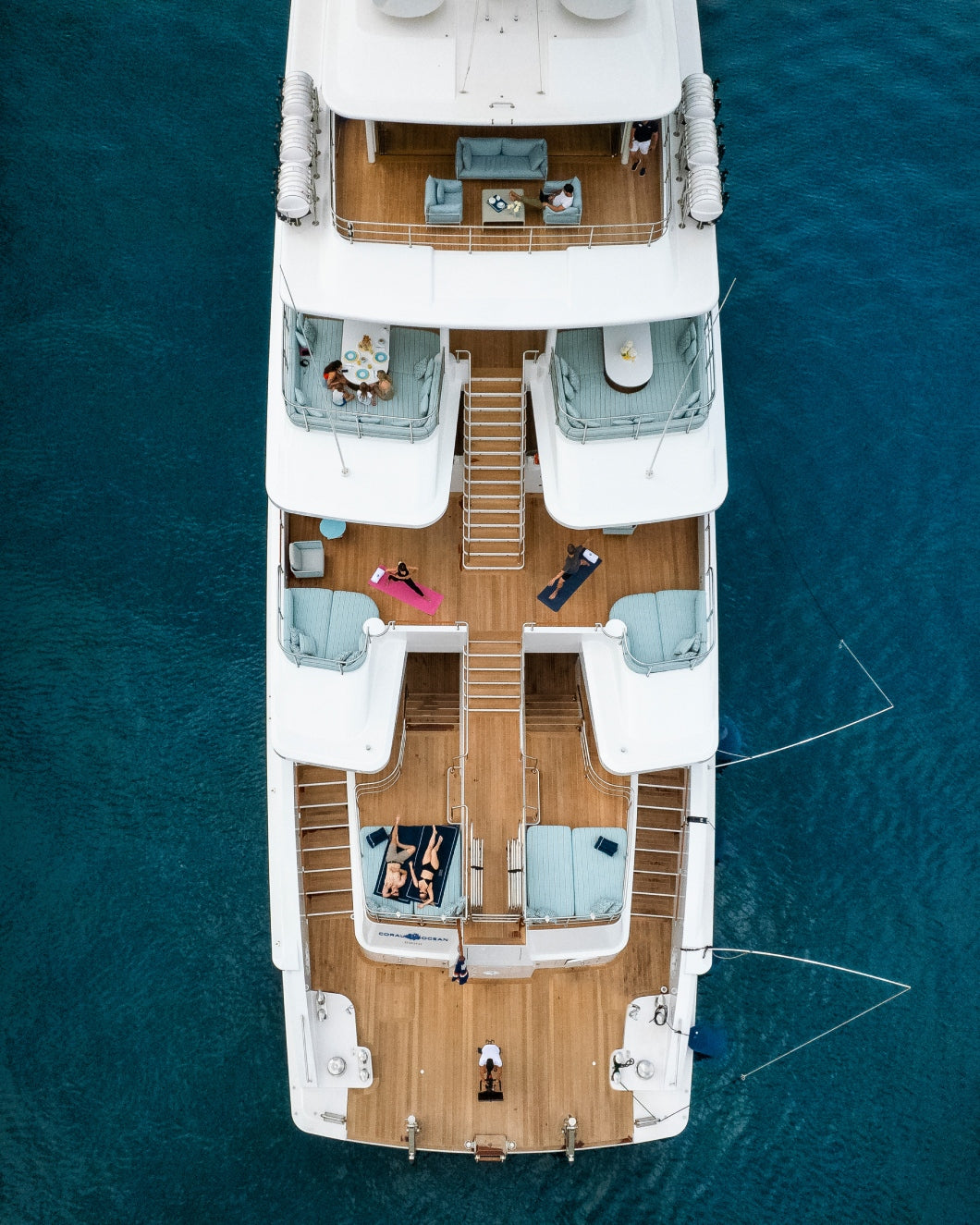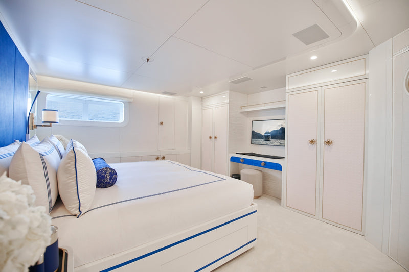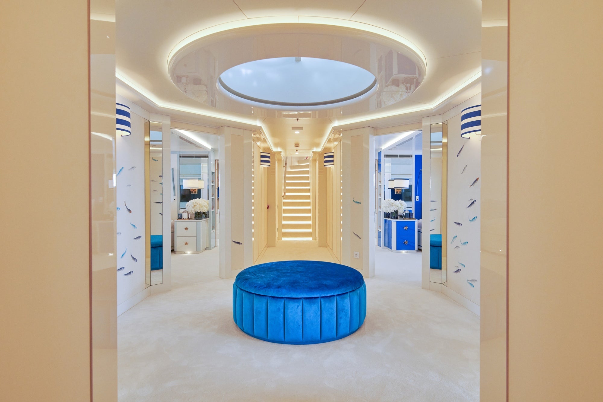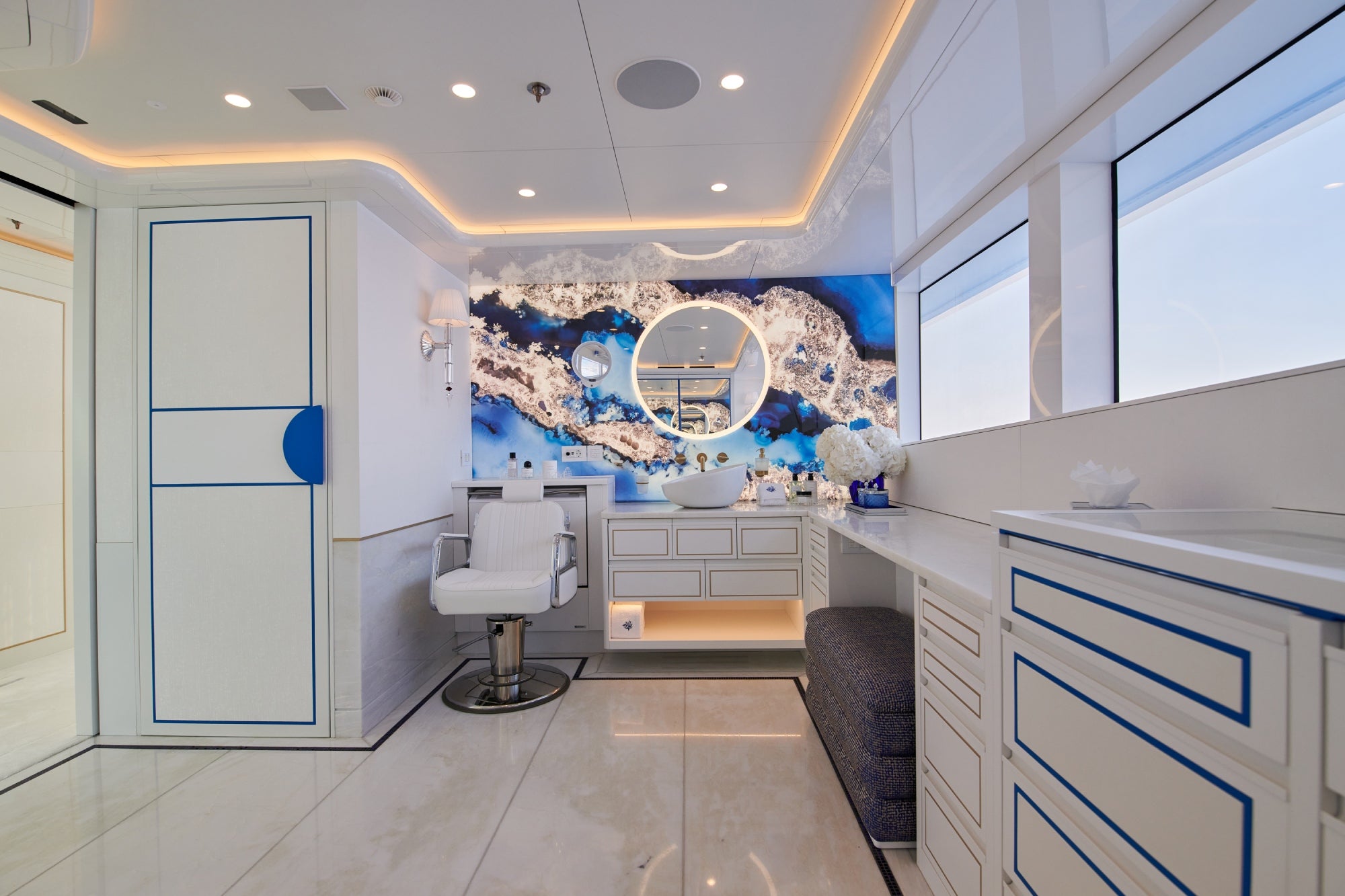 The master bedroom at the bow showcases a coral theme, while each guest cabin boasts a unique marine animal theme, creating an unforgettable and immersive oceanic experience. The exteriors adorned in Paola Lenti custom furniture, make the experience on board one of beauty and comfort.