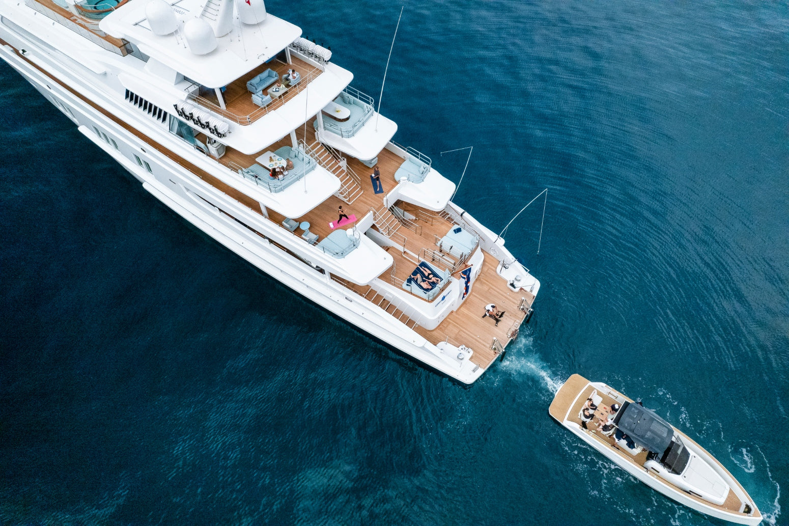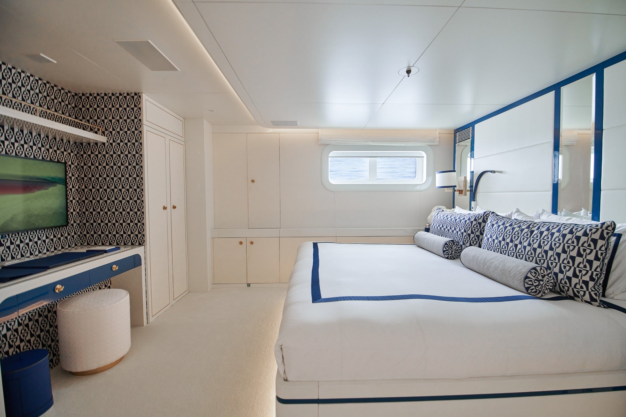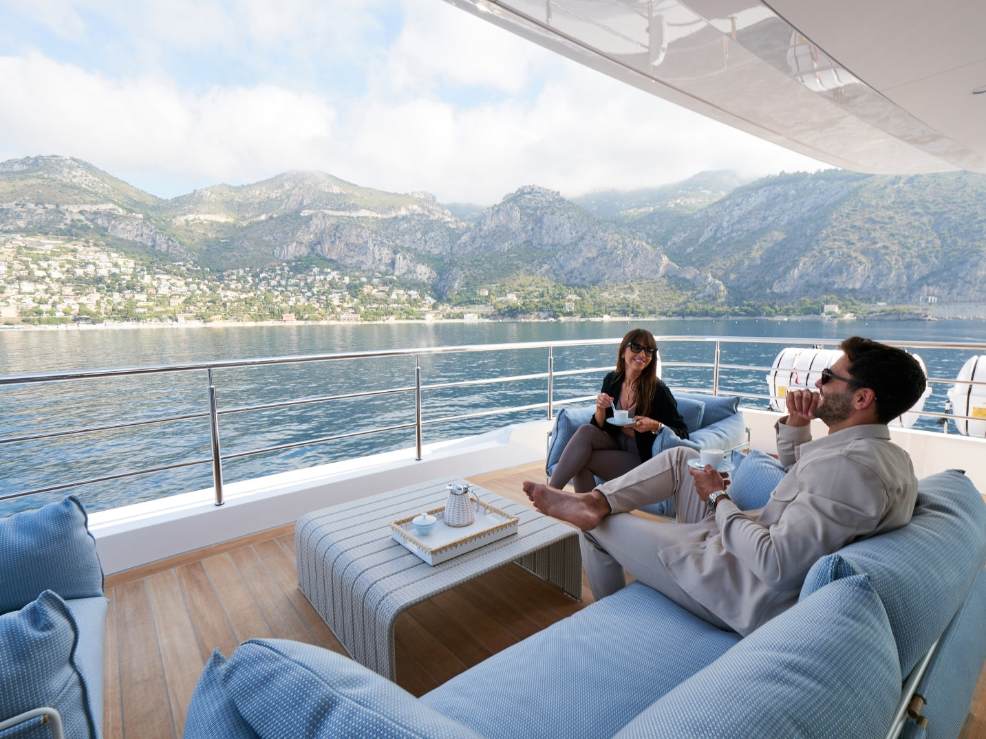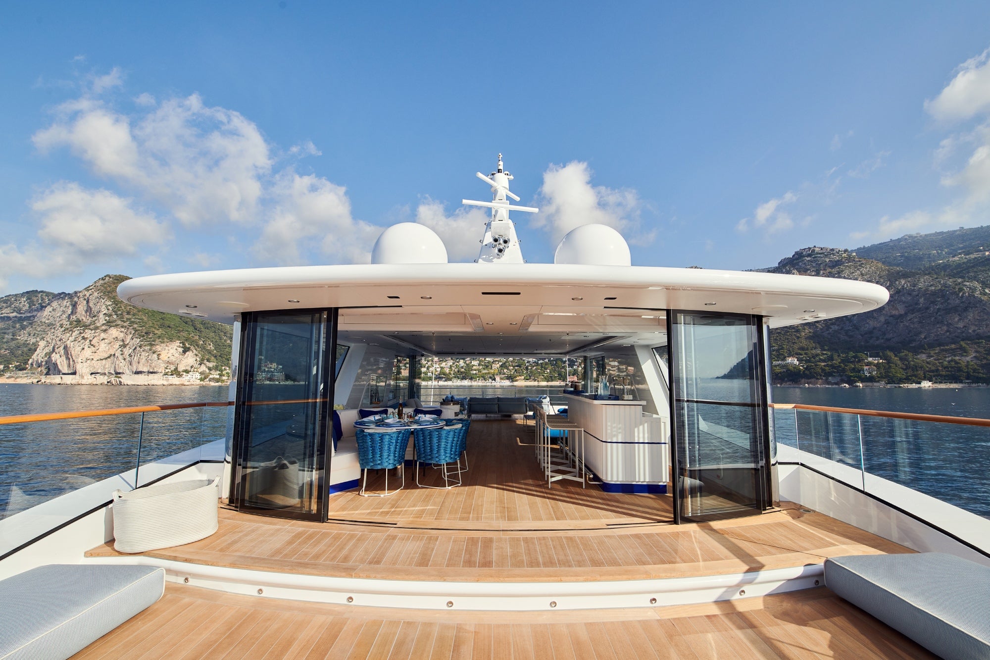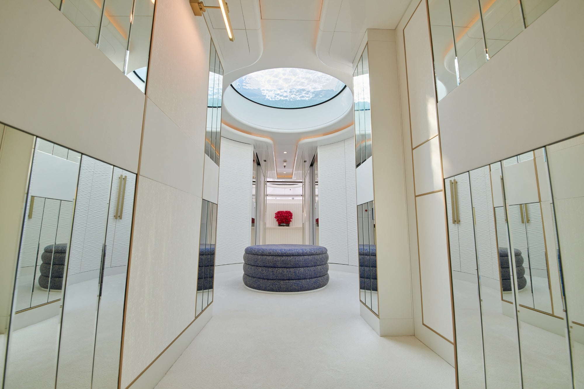 The master bedroom at the bow showcases a coral theme, while each guest cabin boasts a unique marine animal theme, creating an unforgettable and immersive oceanic experience. The exteriors adorned in Paola Lenti custom furniture, make the experience on board one of beauty and comfort.