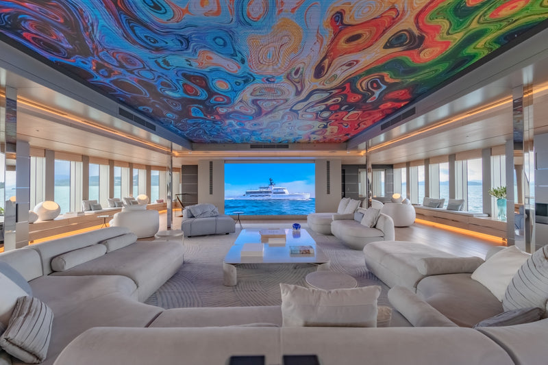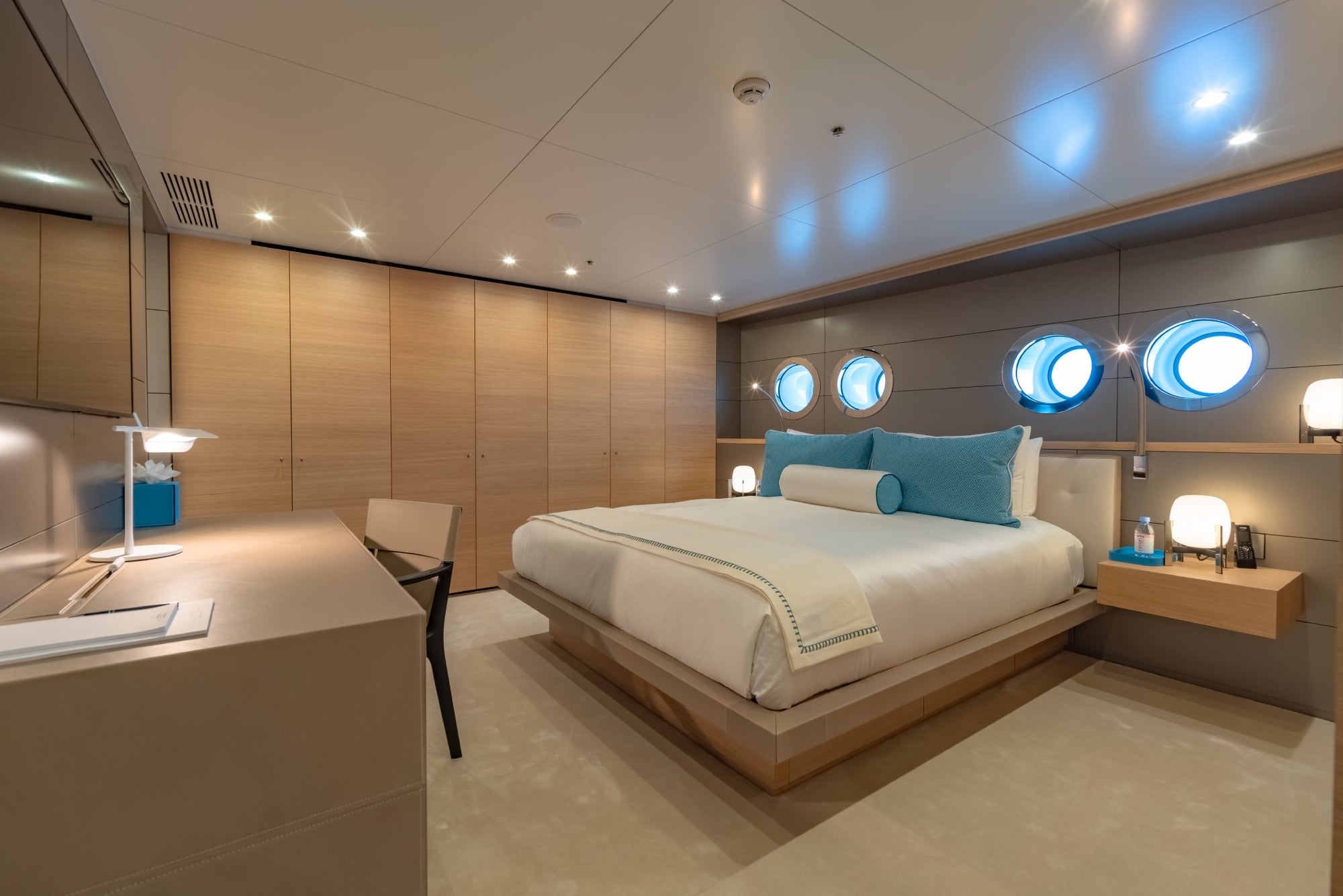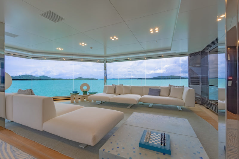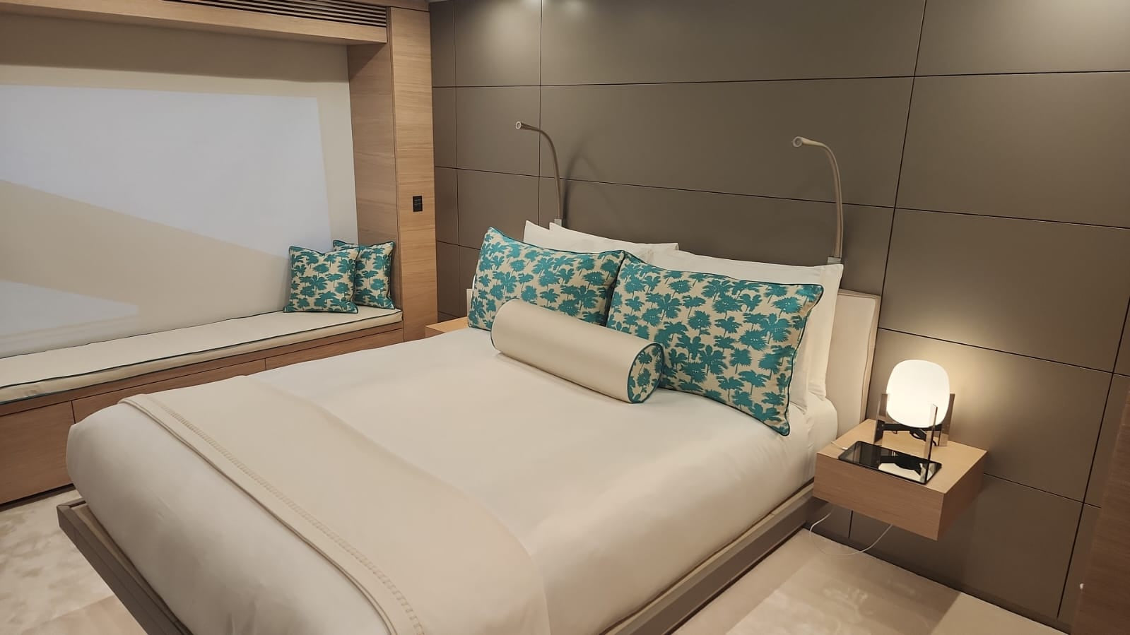 The neutral ivory base and varying shades of blue harmoniously blend together to create a soft, comfortable, and warm atmosphere that perfectly balances the yacht's bold, masculine energy.