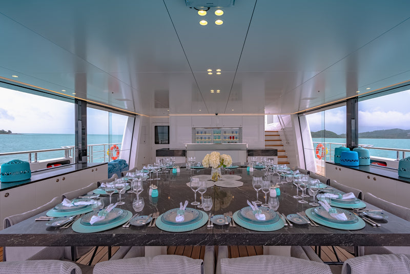 With the carefully curated fabrics, tableware, and decorative accessories we selected, the interior of M/Y Wanderlust exudes an elegant and sophisticated style, making it a true masterpiece of yacht interior design.