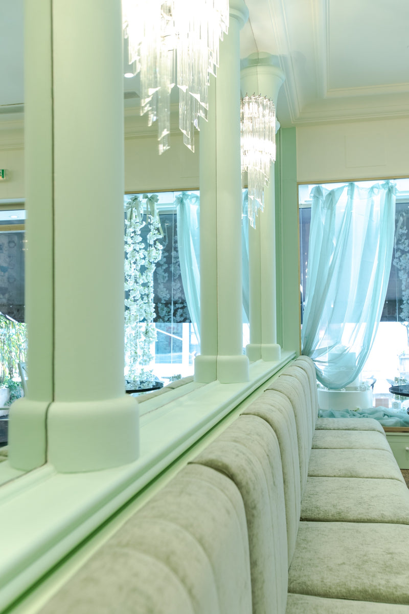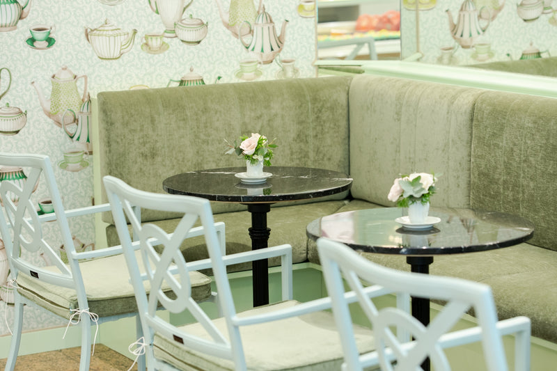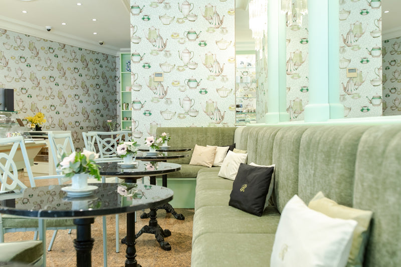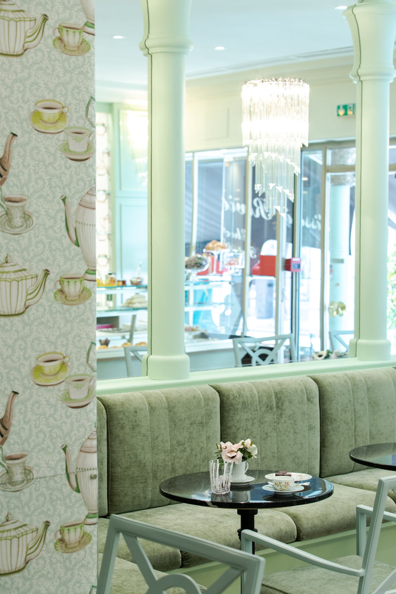 Enjoy some fresh pastries and beverages sitting in its new elegant atmosphere with custom made pistachio furniture, a light green seating area with soft Nobilis velvet and Manuel Canovas' wall fabric will make even the Mad Hatter envious!