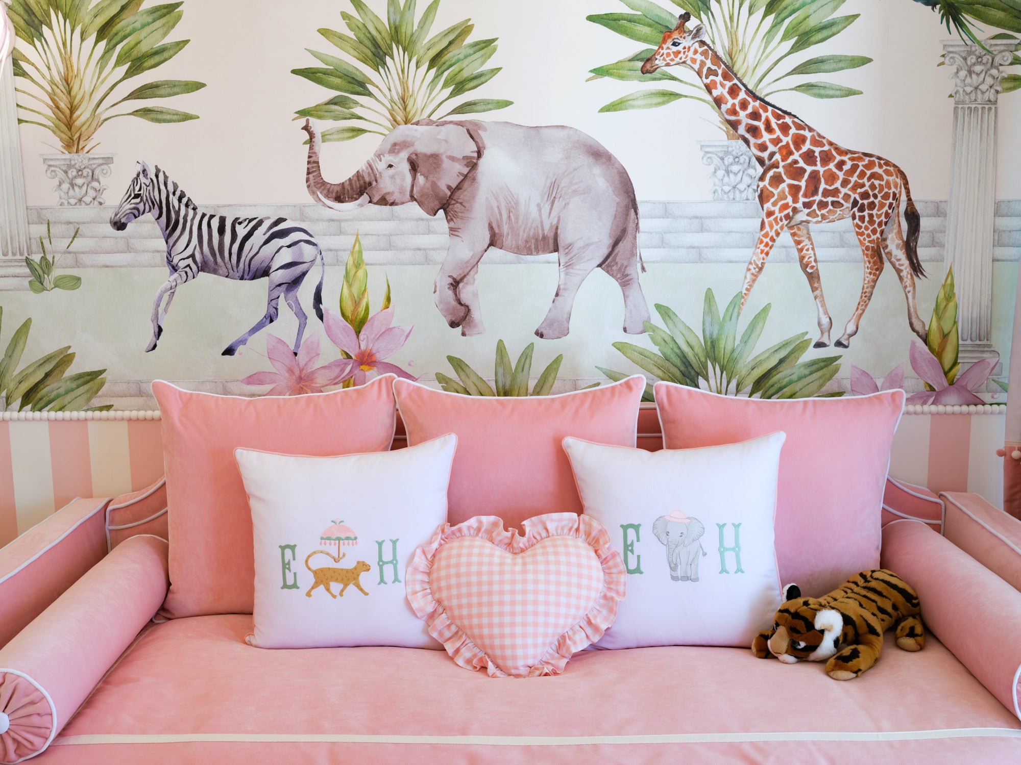 Our custom wallpaper mural creates a world of exploration, grounded by pink and white striped wainscoting that adds classic sophistication. The journey begins in the hallway, where the safari unfolds along both walls, drawing you into the enchanted space beyond. A bright pink velvet daybed anchors the nursery for late-night lullabies and afternoon stories, while a vintage-inspired crib with hand-carved rose details and tufted upholstery becomes an heirloom centerpiece.