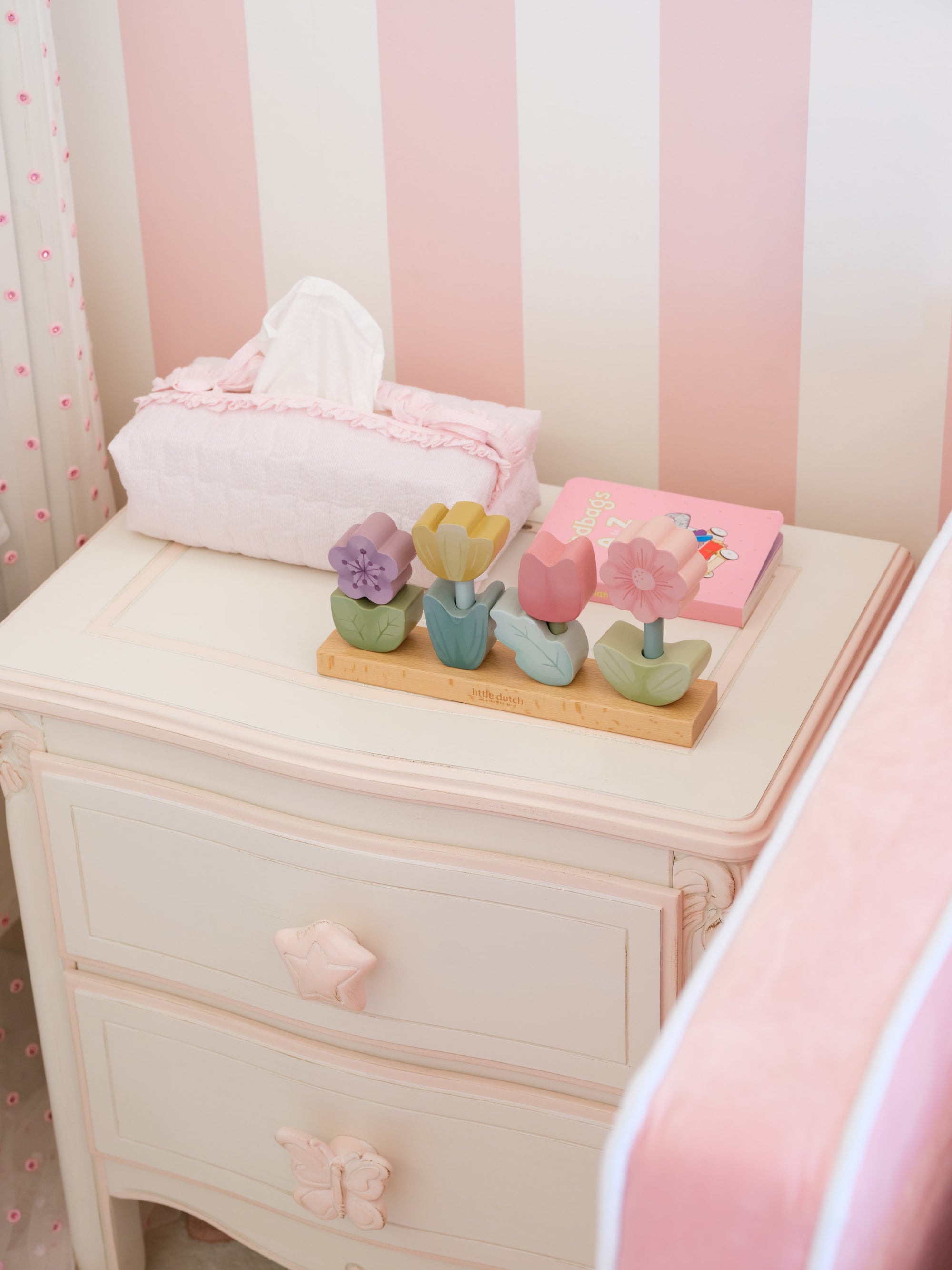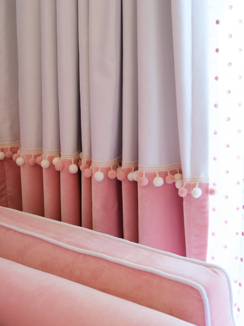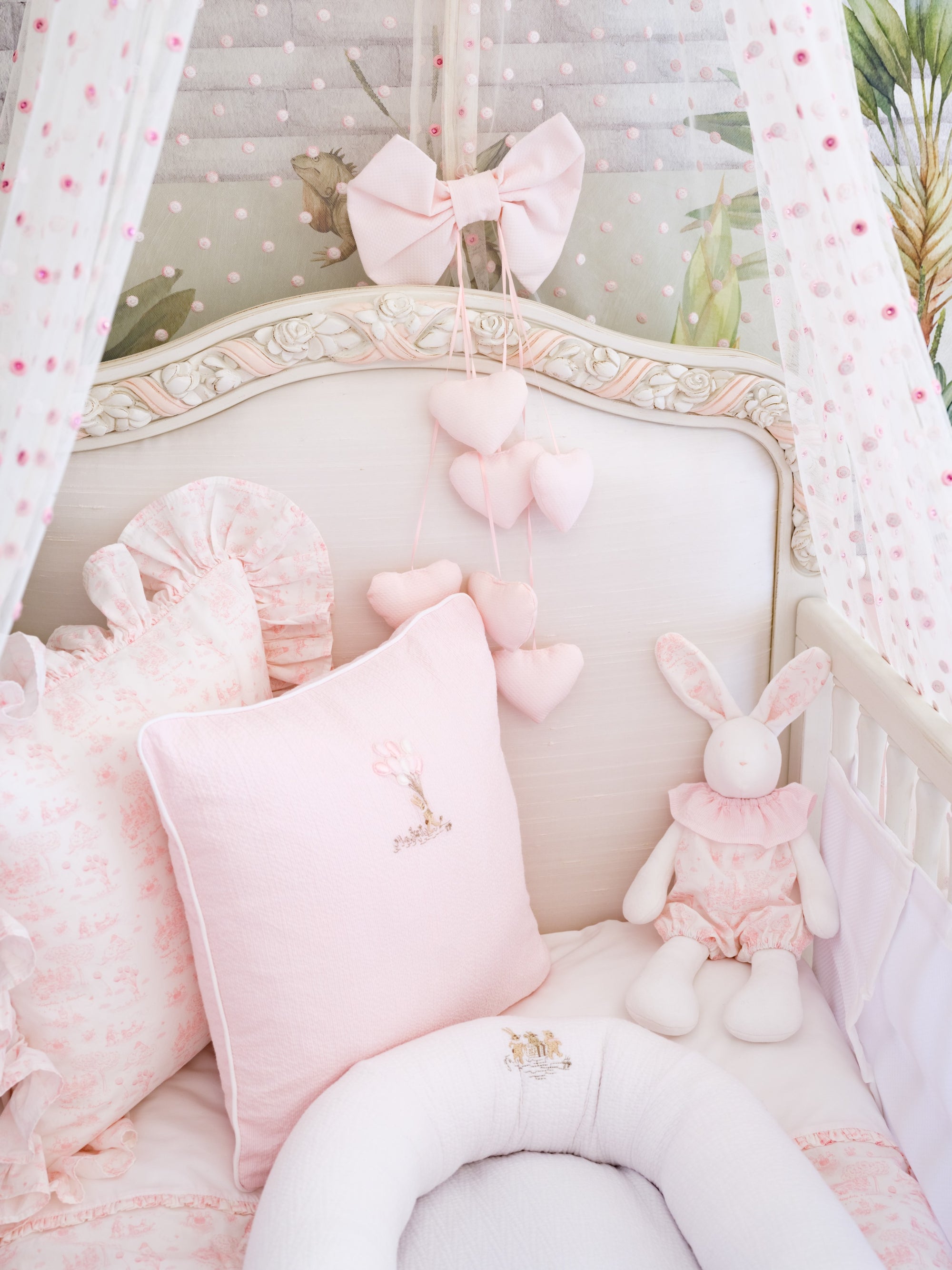 Thoughtful details complete the narrative: a custom tulle canopy embroidered with Swarovski crystals, embroidered pillows adorned with delicate crowns, plush heart garlands, and the softest companions for tender moments. Layers of pink-hued textiles in varying patterns create depth and warmth.
