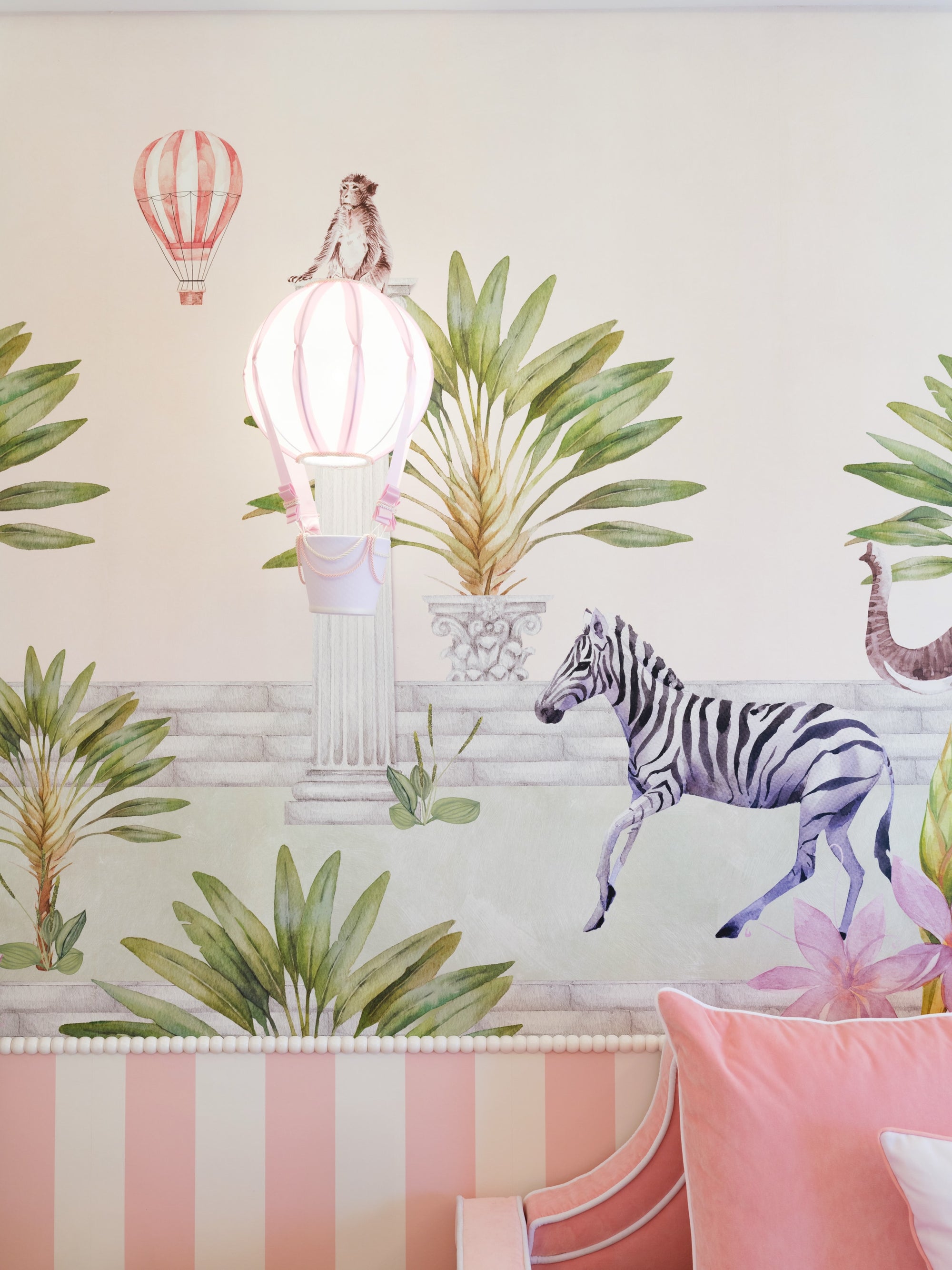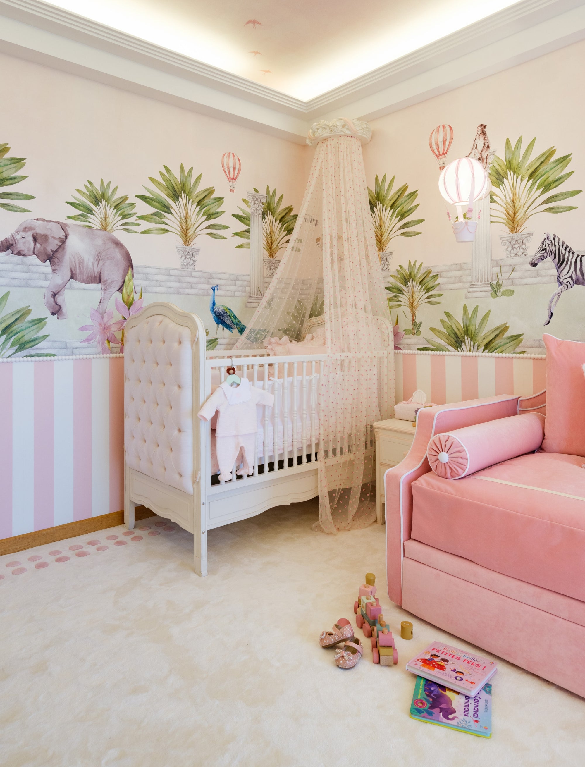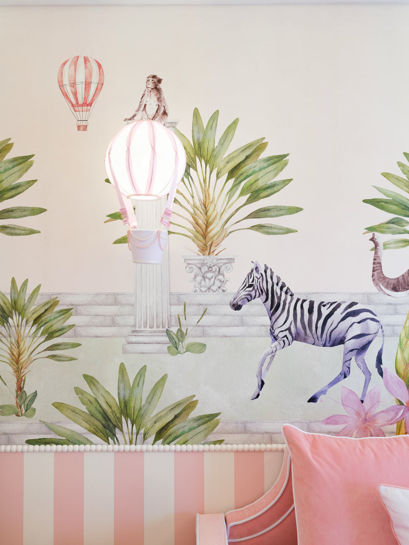 Majestic elephants, graceful giraffes, and proud zebras wander through palm groves and blooming magnolias. Peacocks spread their iridescent plumes while hot air balloons drift overhead. This nursery is an immersive storybook, where the wild meets the whimsical in blush and rose.