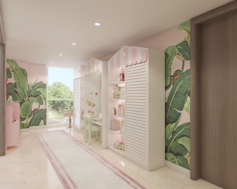 We re-ceated the iconic Beverly Hills wallpaper for an exotic feel & designed a fun storage cabinet with shutters and an integrated desk