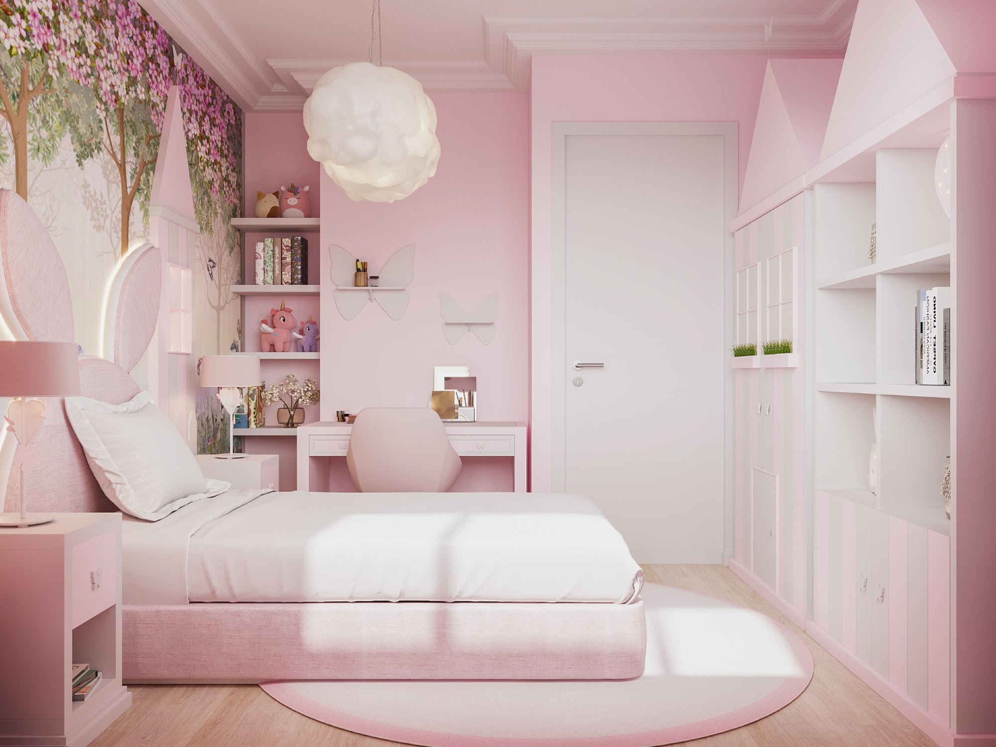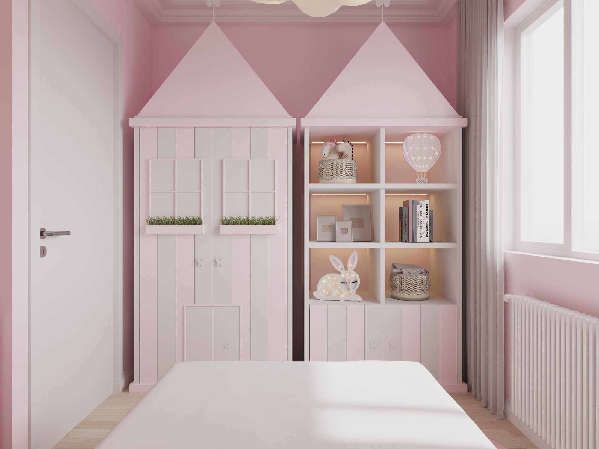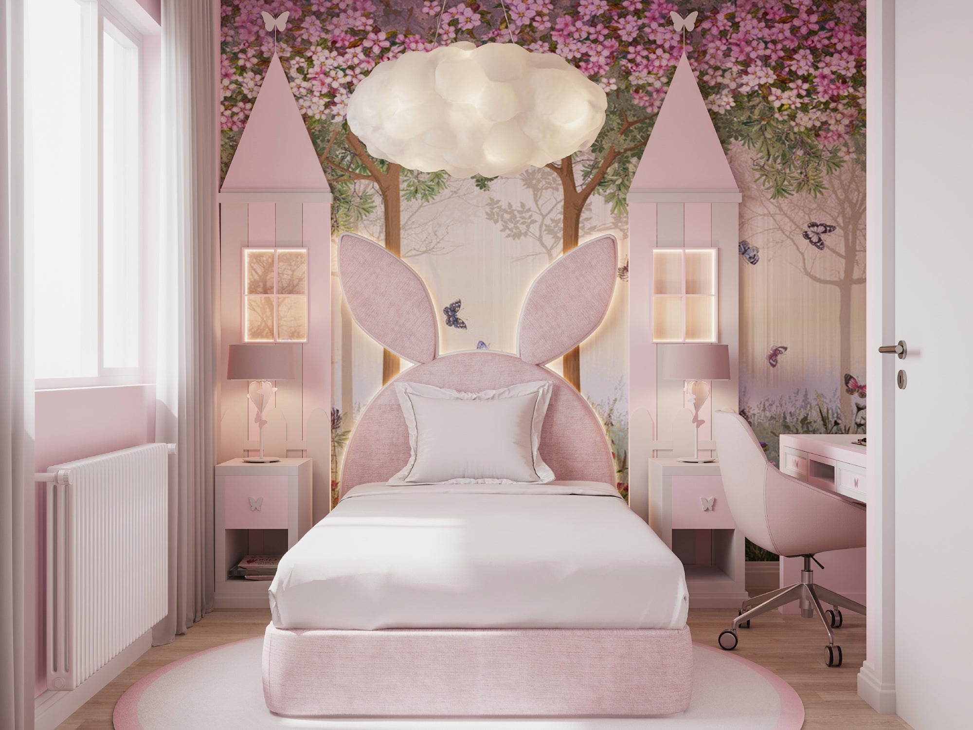 We created the Rabbit Bedroom as a personal enchanted world for a six-year-old little girl. It was a challenging project as the room was relatively small, but we managed to create a magical sleeping area, a functional desk space, and a spacious closet zone.