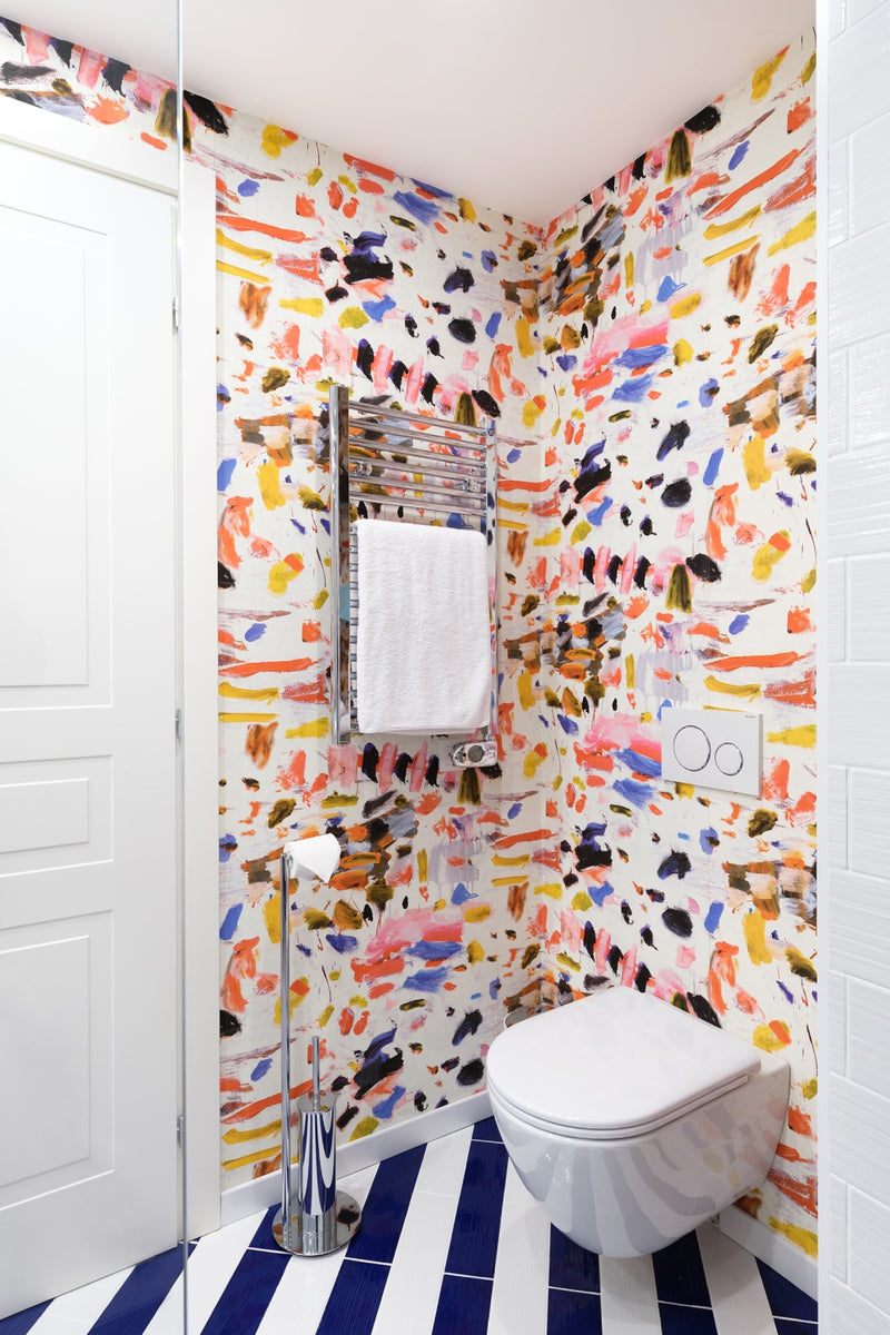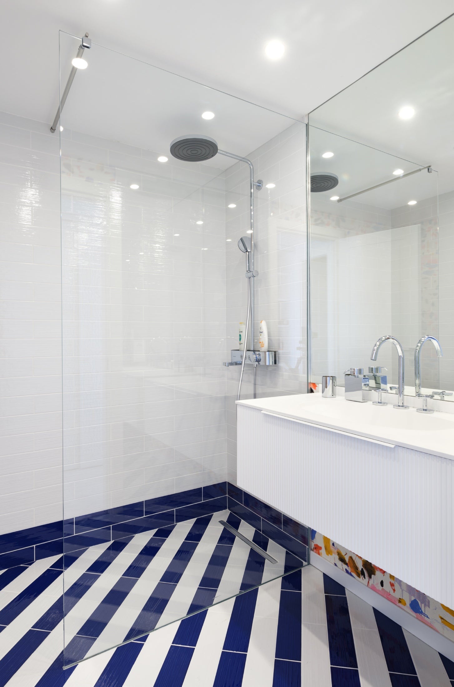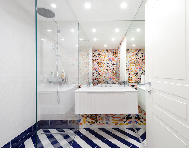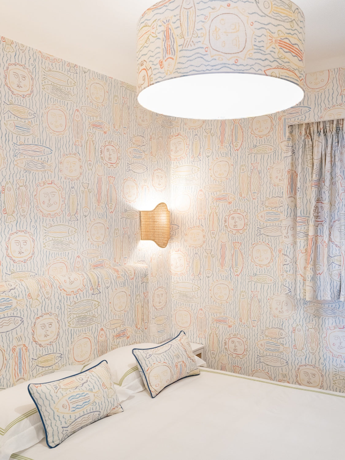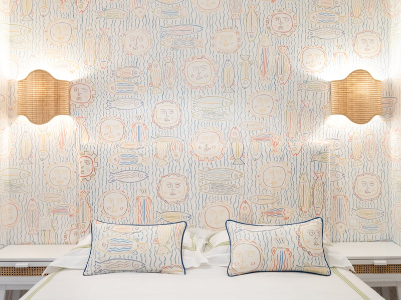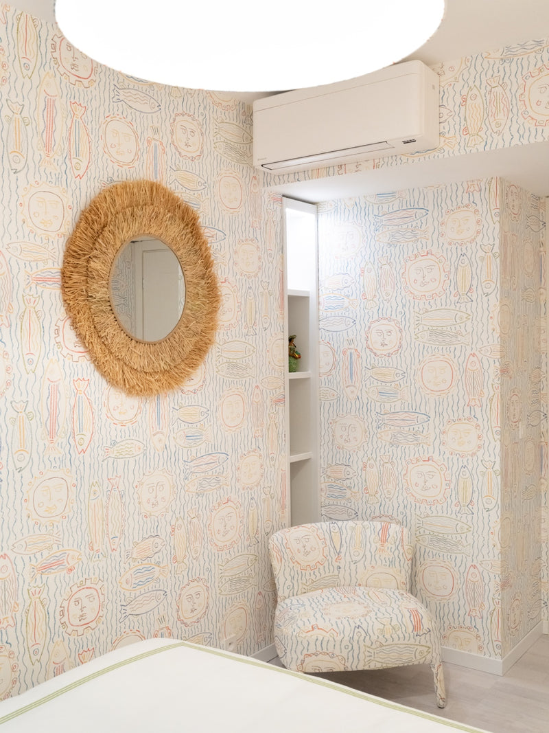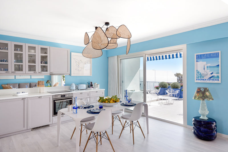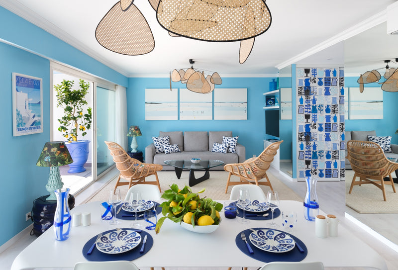 To achieve this, we painted the walls in a vibrant blue and installed artistic Pierre Frey wallpapers that embodied the 60s Riviera aesthetic. The living room features a comfortable sofa bed and an iconic Link table by B&B, paired with Eames dining chairs for a touch of classic elegance. The bathroom is adorned with beautiful Klein blue striped ceramic tiles, while the fun room is clad in playful Pierre Frey fish fabric and wallpaper.