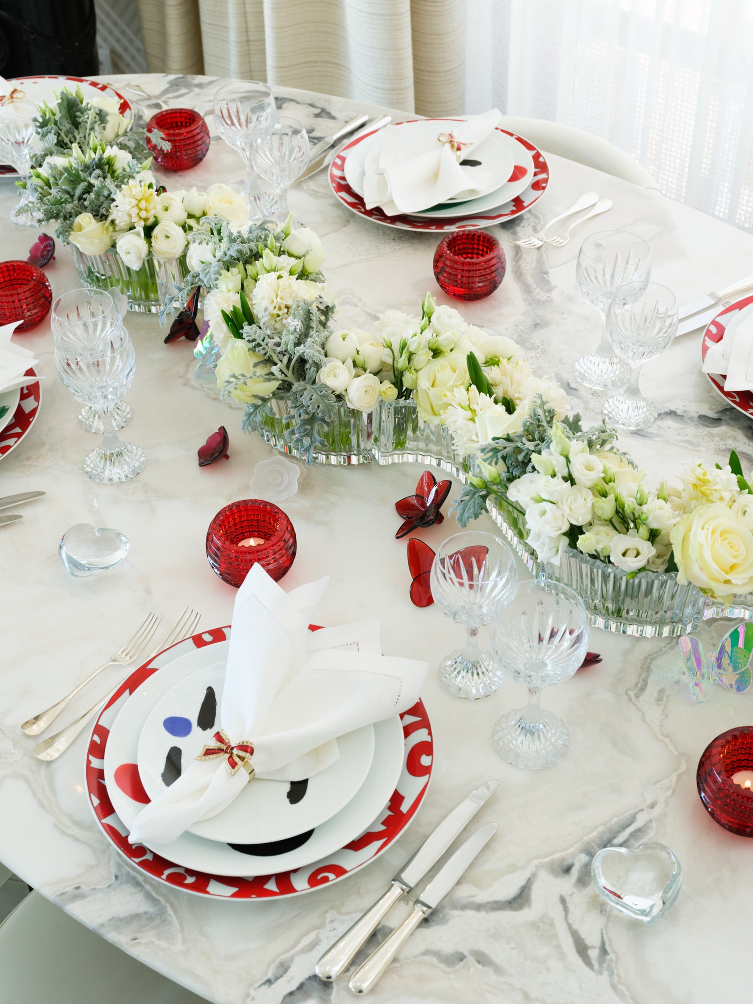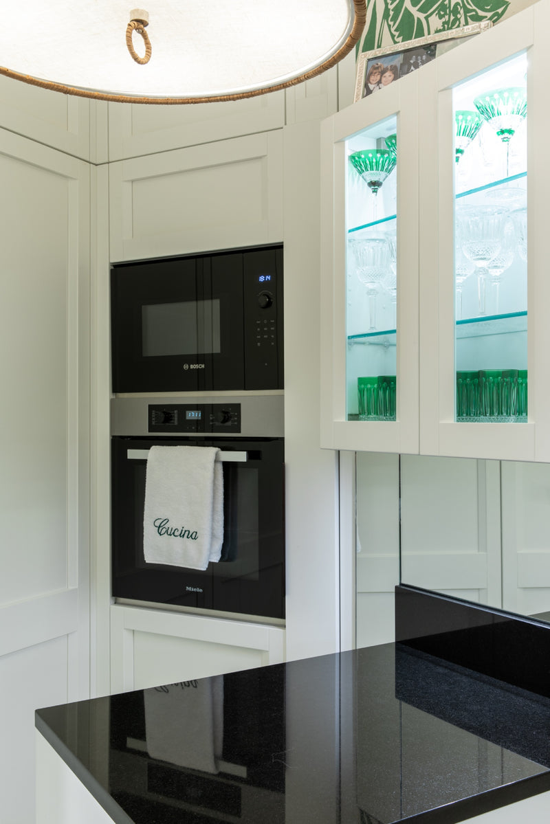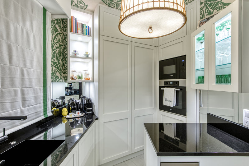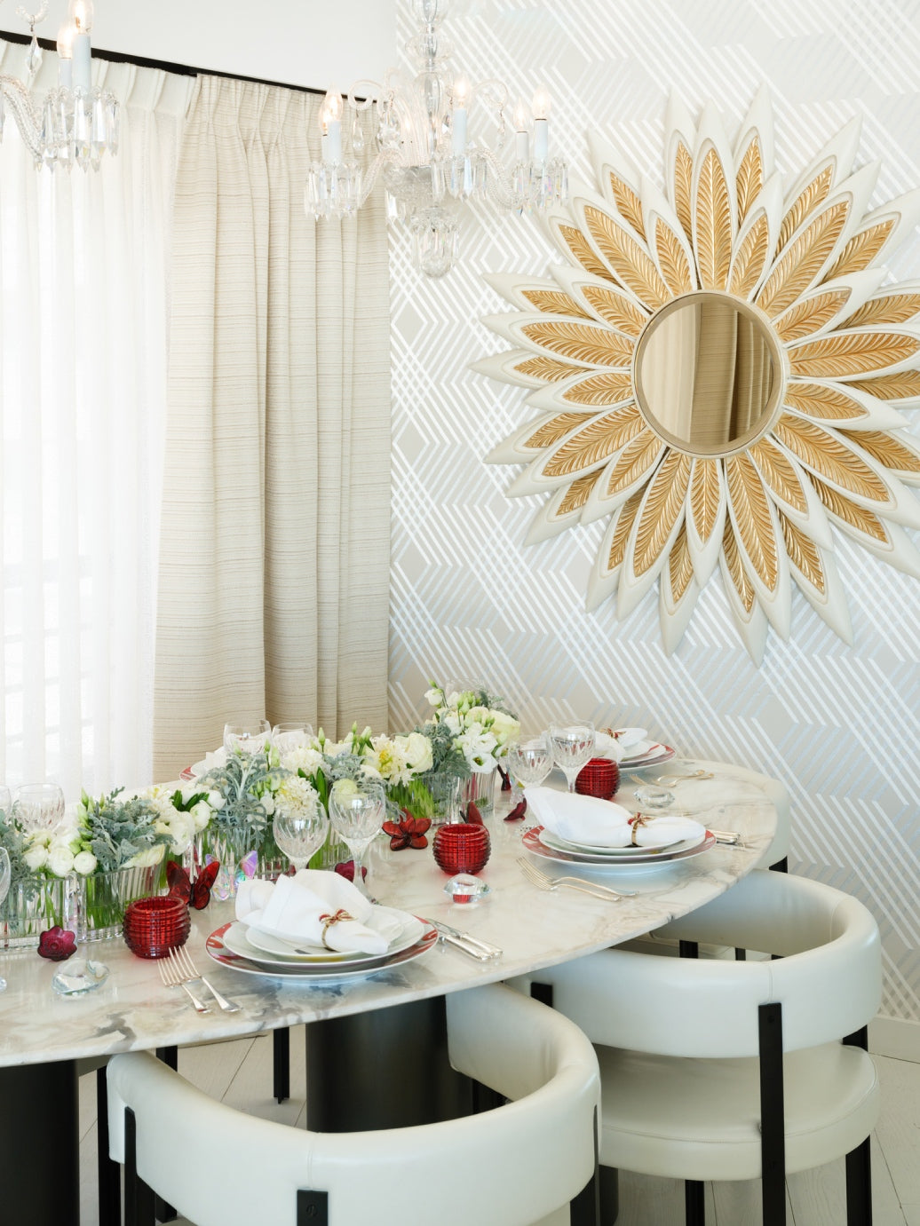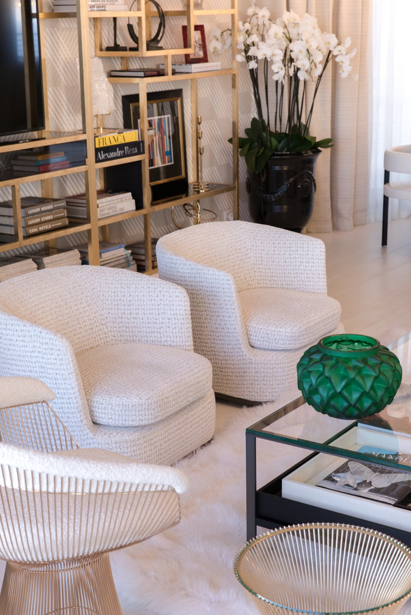 The ivory-white bases is offset by a rich emerald green or deep red accents. The comfortable bouclé sofa from B&B is modernized by a glass coffee table from B&B and a polar white onyx dining from Baxter. The custom-made shagreen and mother of pearl console, minimalistic yet luxurious lacquer buffet and gold leaf bookcase show our carpenters attention to detail.