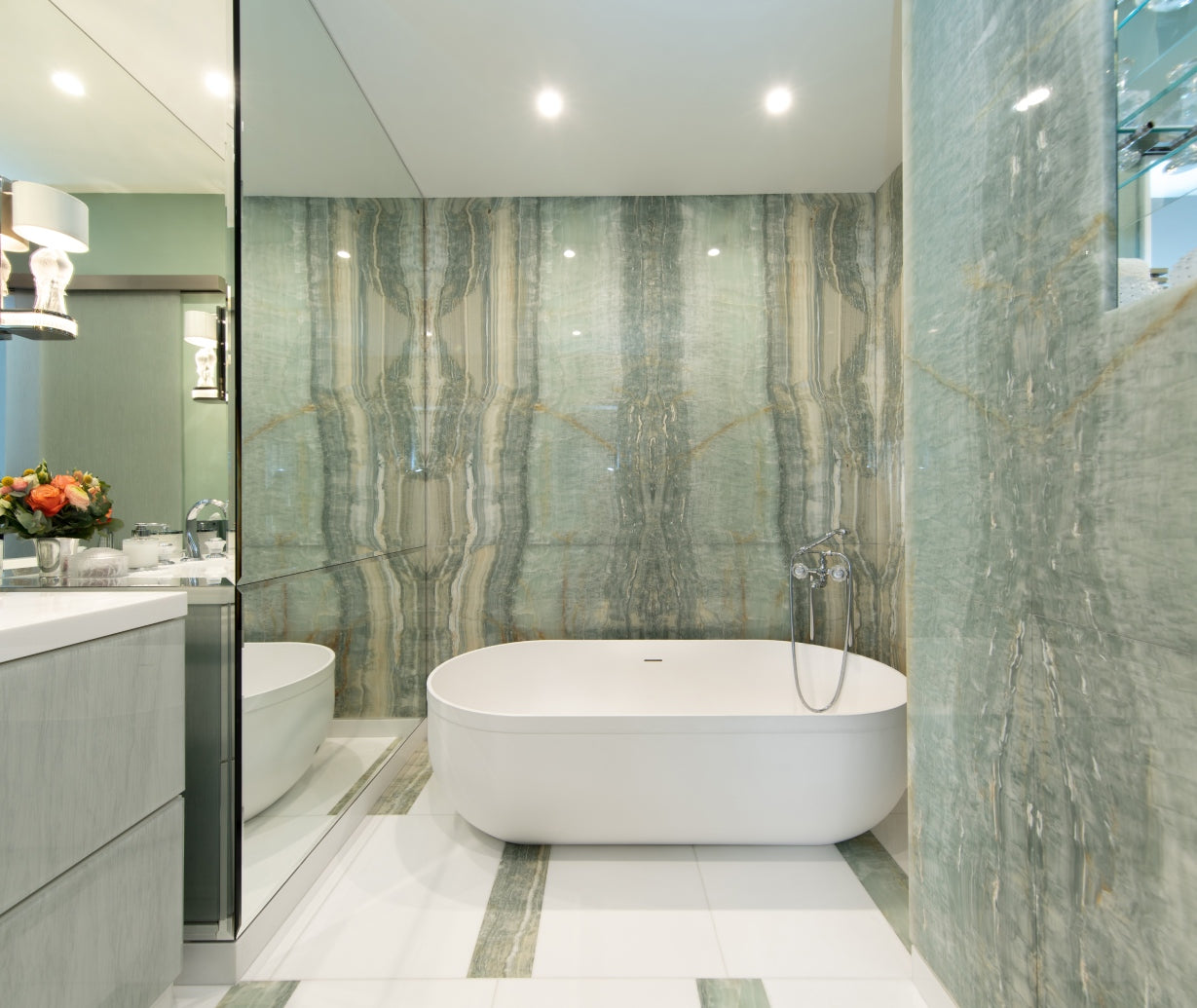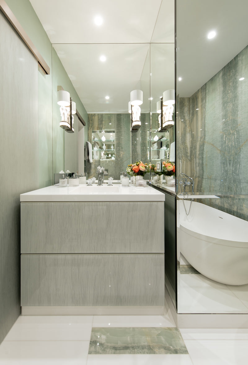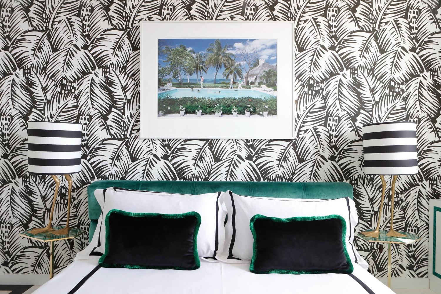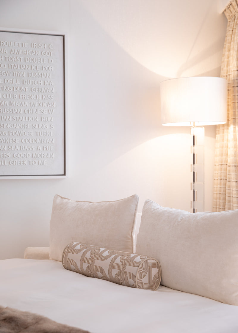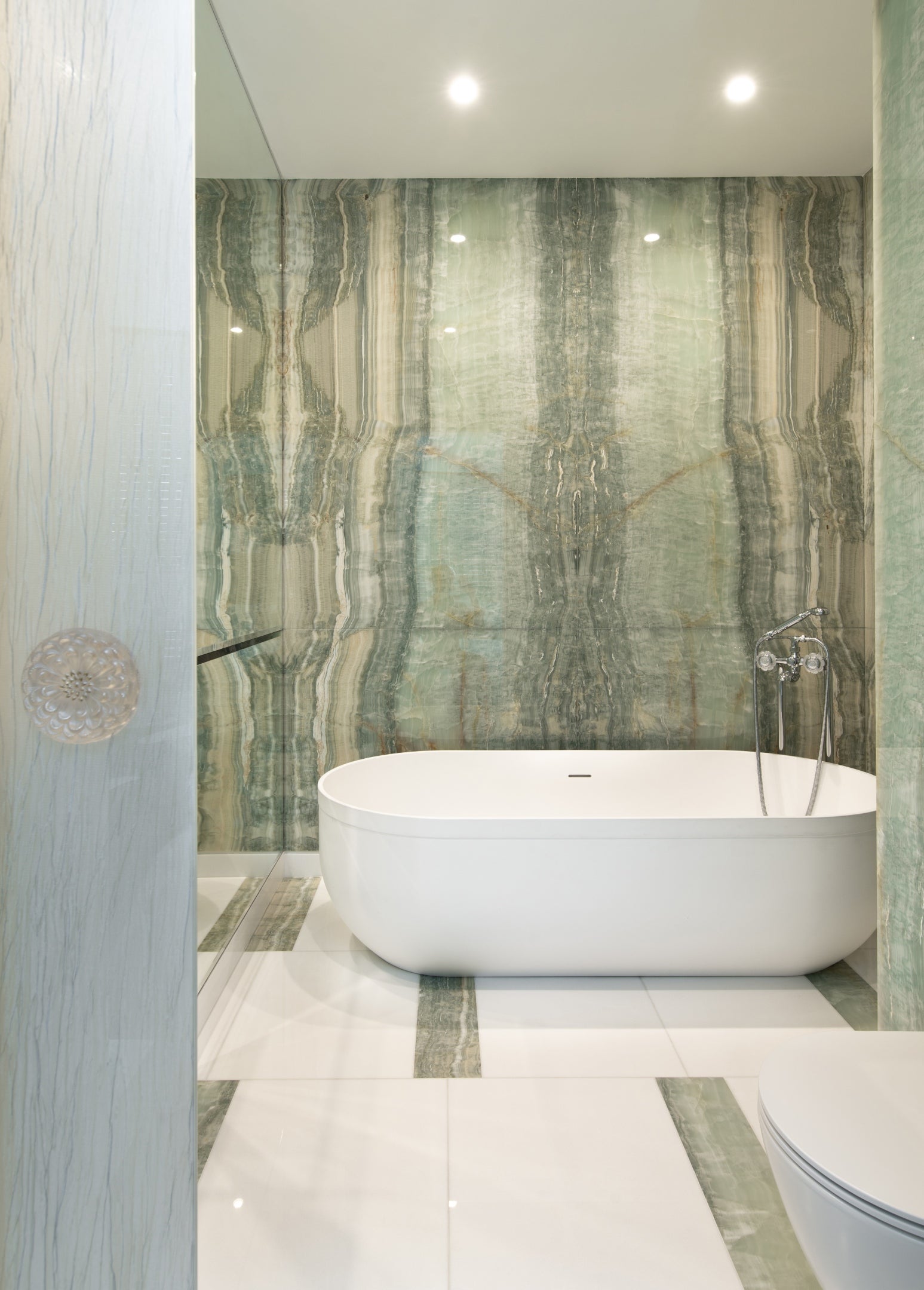 The calming master bedroom includes a sumptuous green onyx bathroom with Lalique x THG hardware and the guest bedroom showcase the eclectic yet elegant taste of the client.