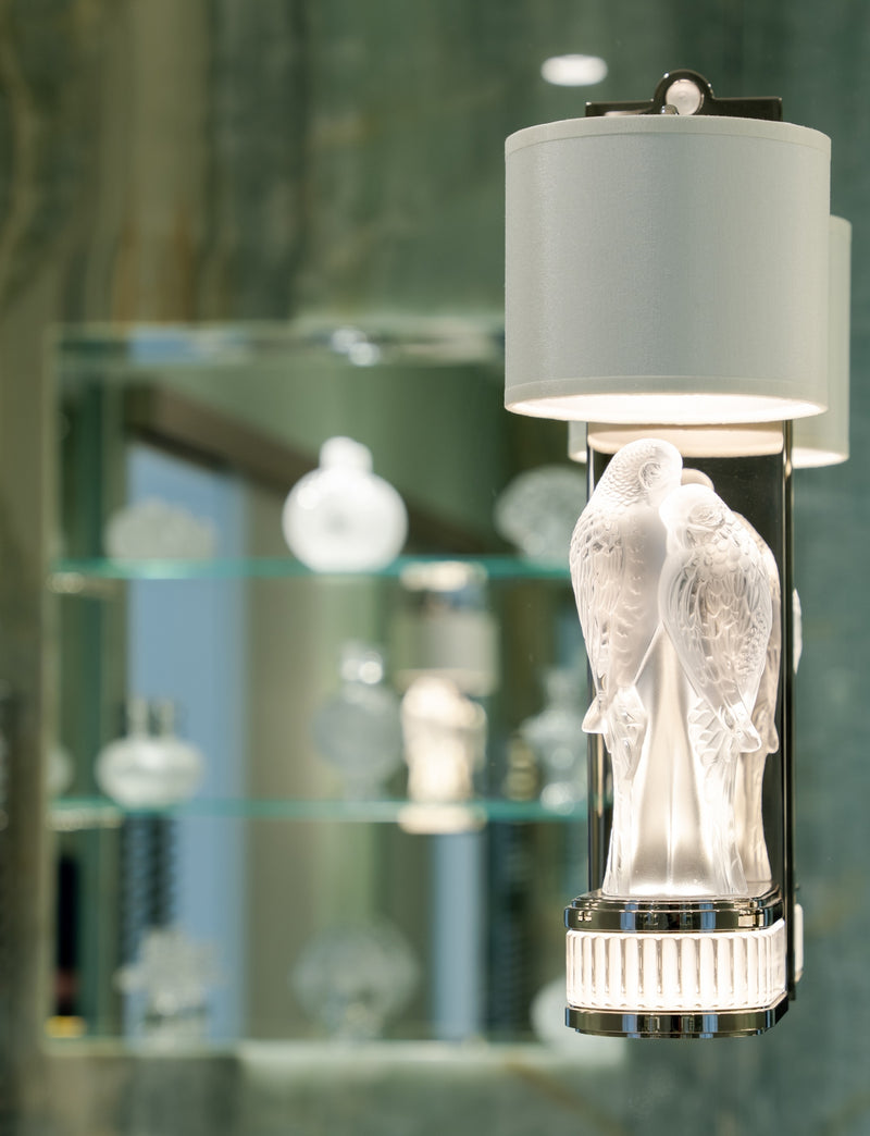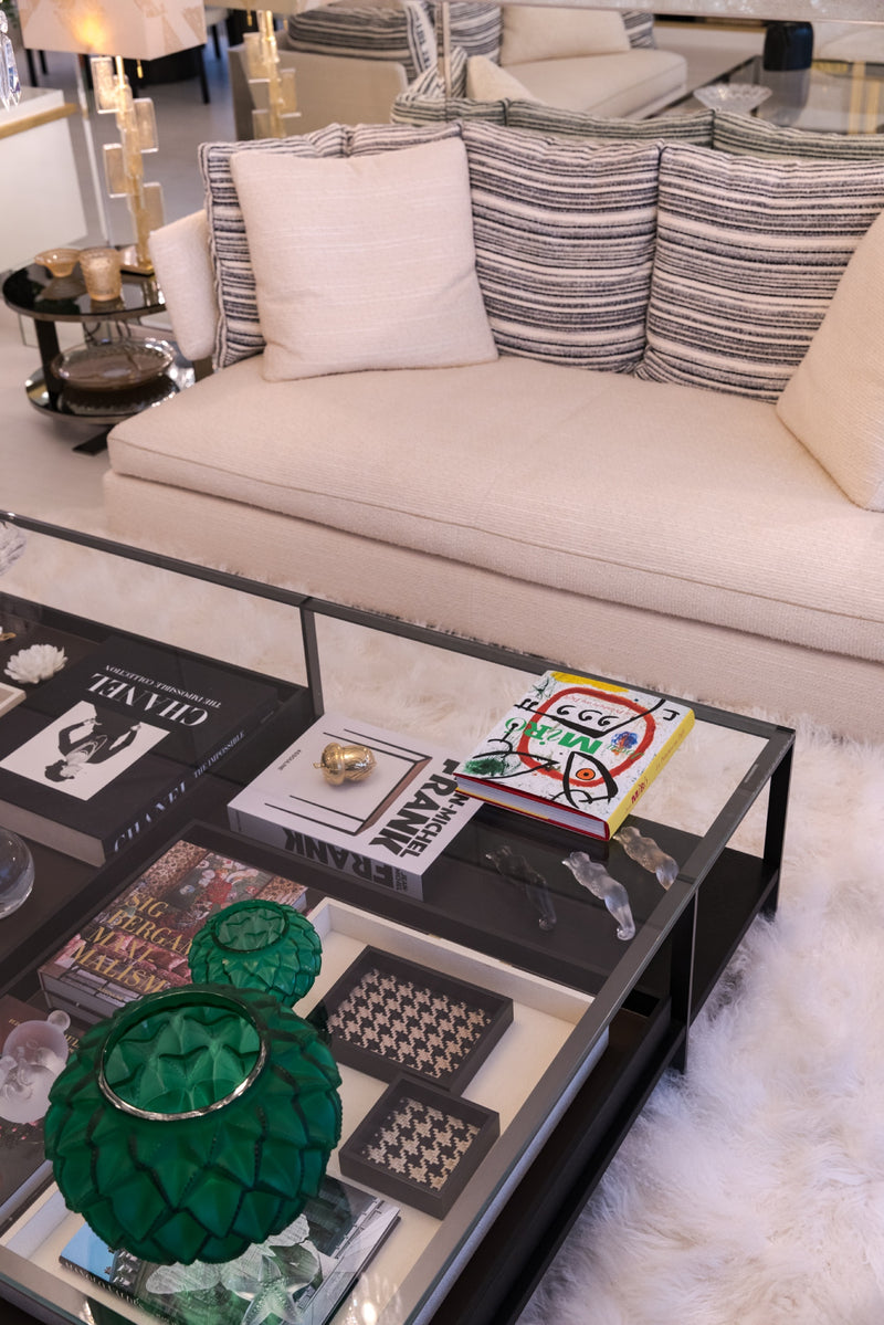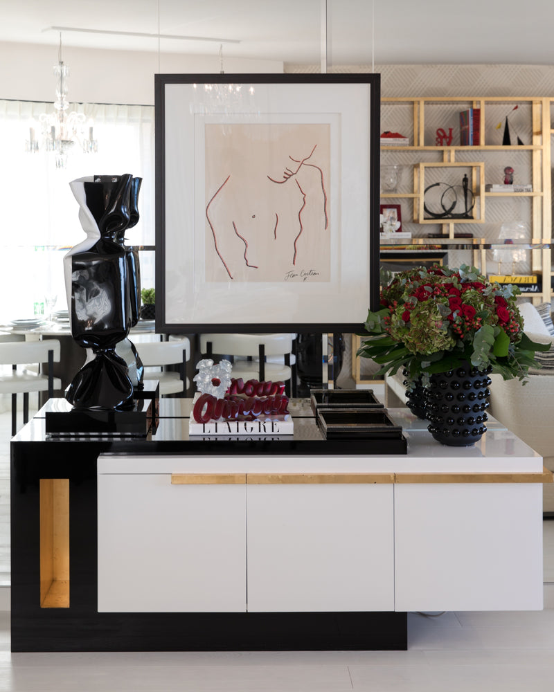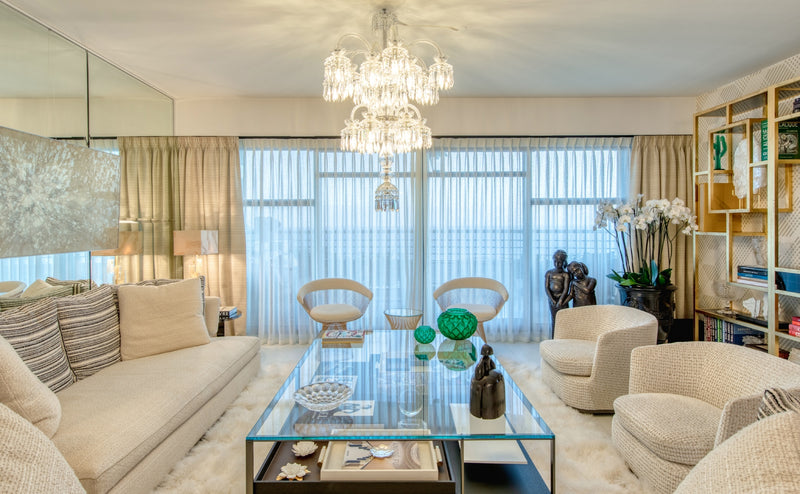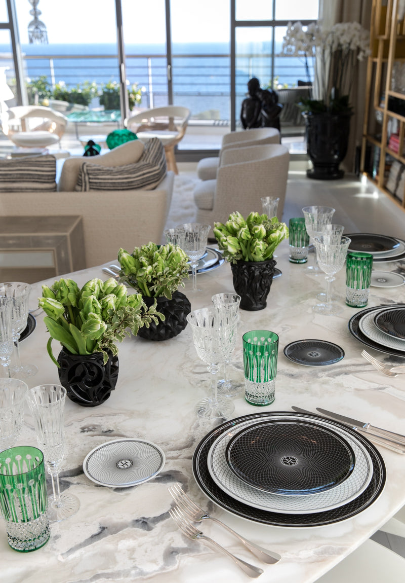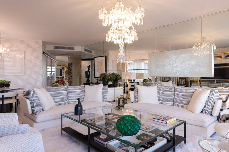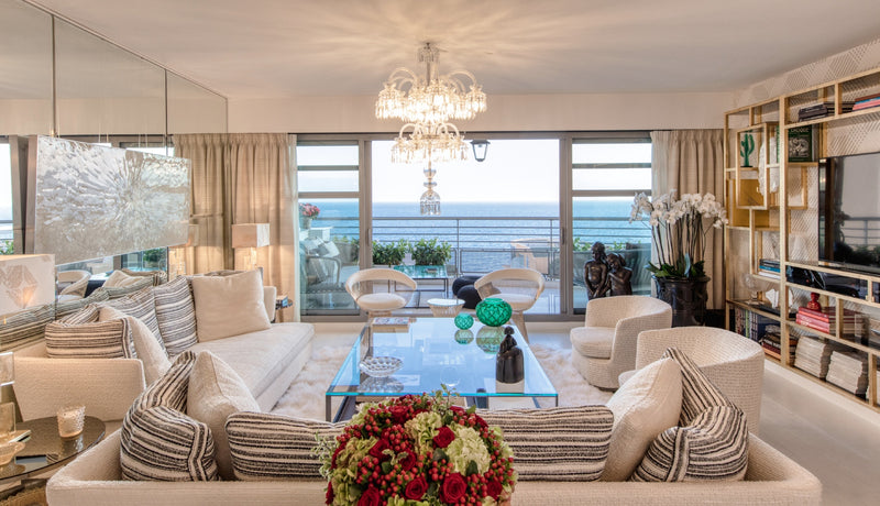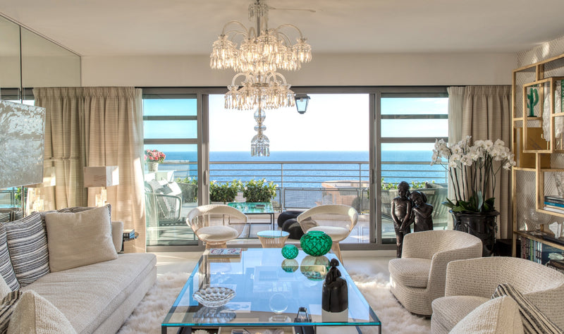 This sea view apartment in Monaco offers stunning views of the city and beach club. The classic-contemporary living room features timeless crystal pieces from Lalique, Saint Louis or Baccarat, and artwork by local artist such Jean Cocteau or Ben Vauthier.