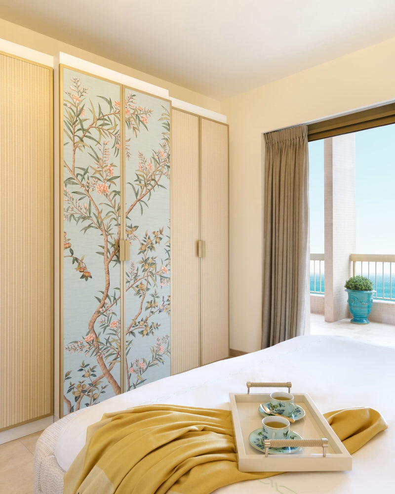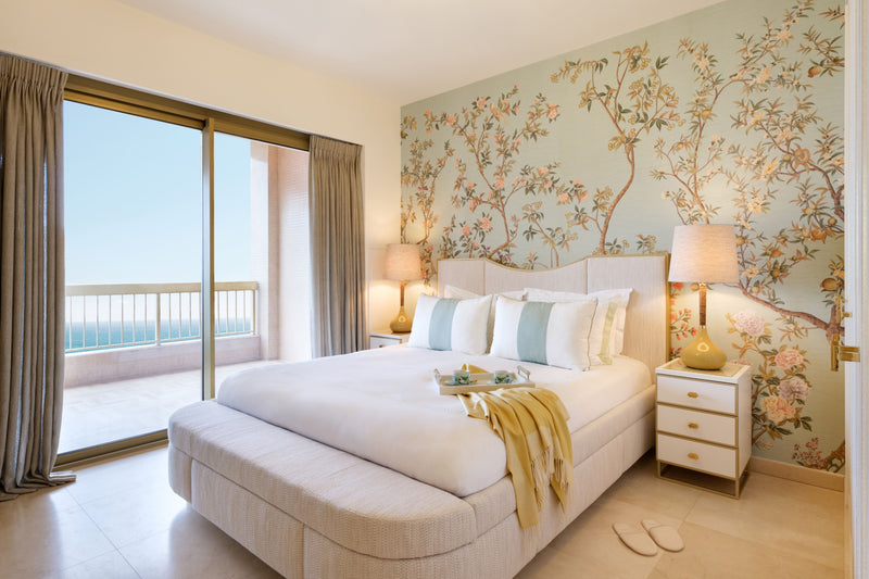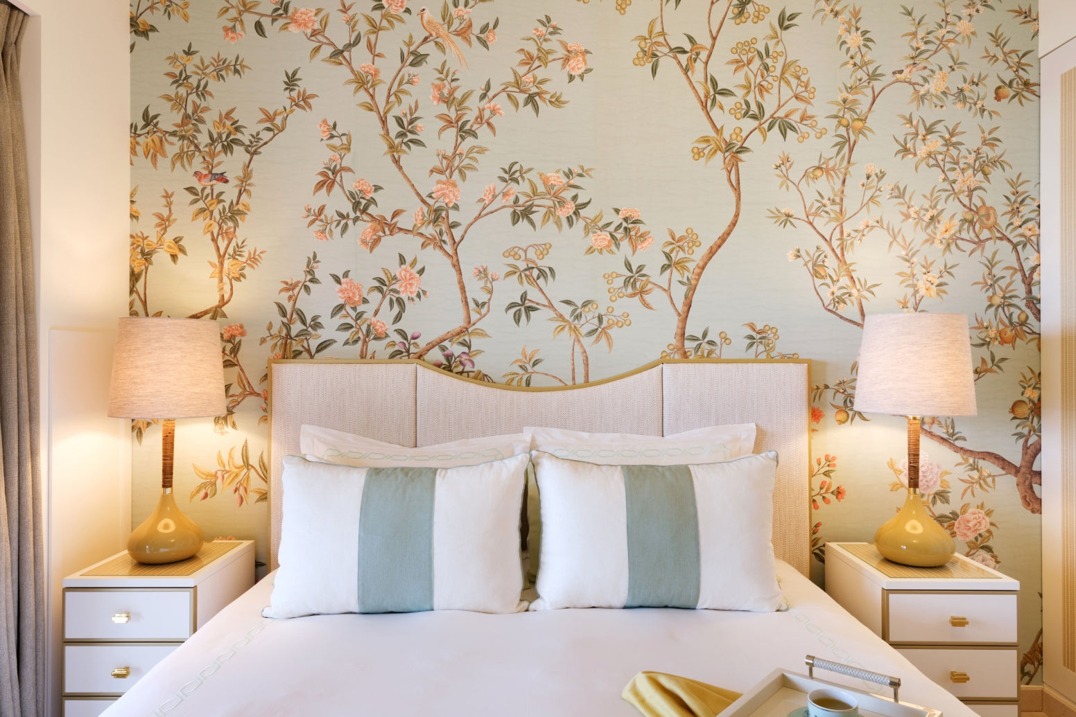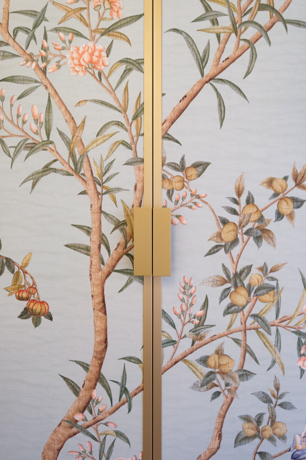 We selected an elegant mint wallpaper from Iksel with a chinoiserie design including peach and mustard trees. To complement it, we chose ceramic mustard and cane Porta Romana lamps.