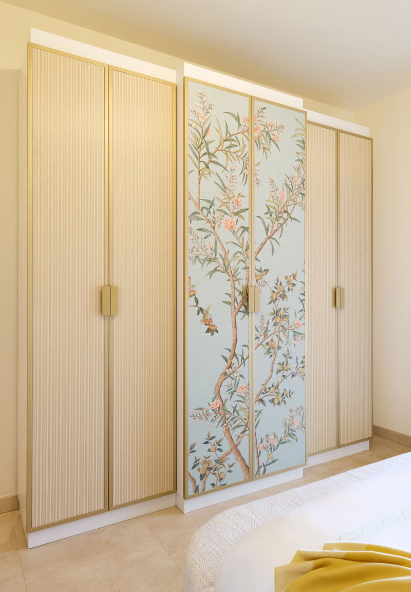 Finally, we designed a custom wardrobe with both wallpapers present in the room, complete with LED when opening the doors to find shelves, rods and custom trouser racks for maximum storage !
