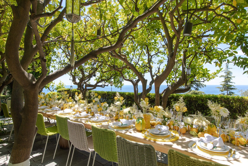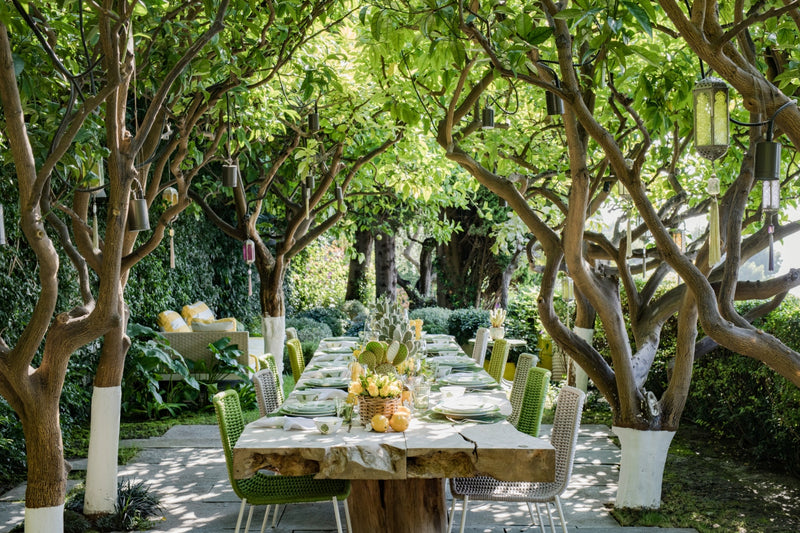 The neutral tones are perfectly complemented by Mediterranean colors in fabrics, furniture, tableware, and artwork.
